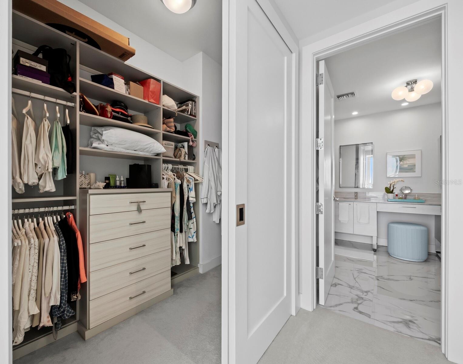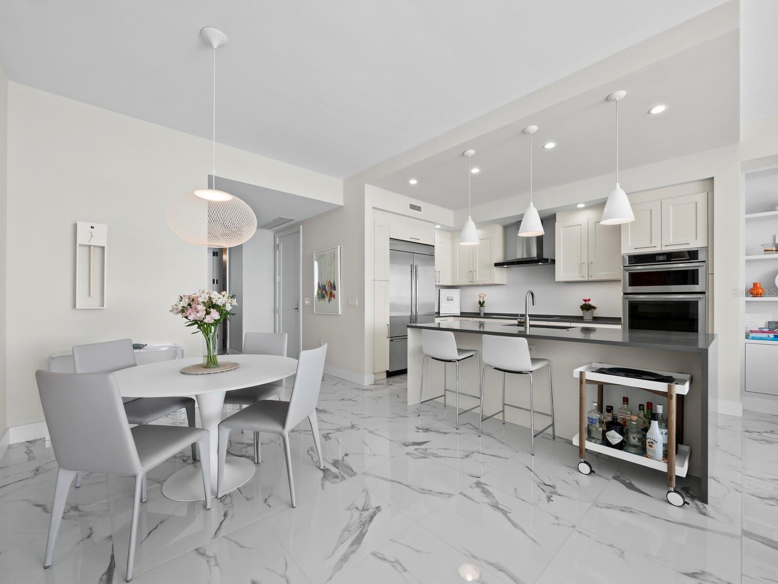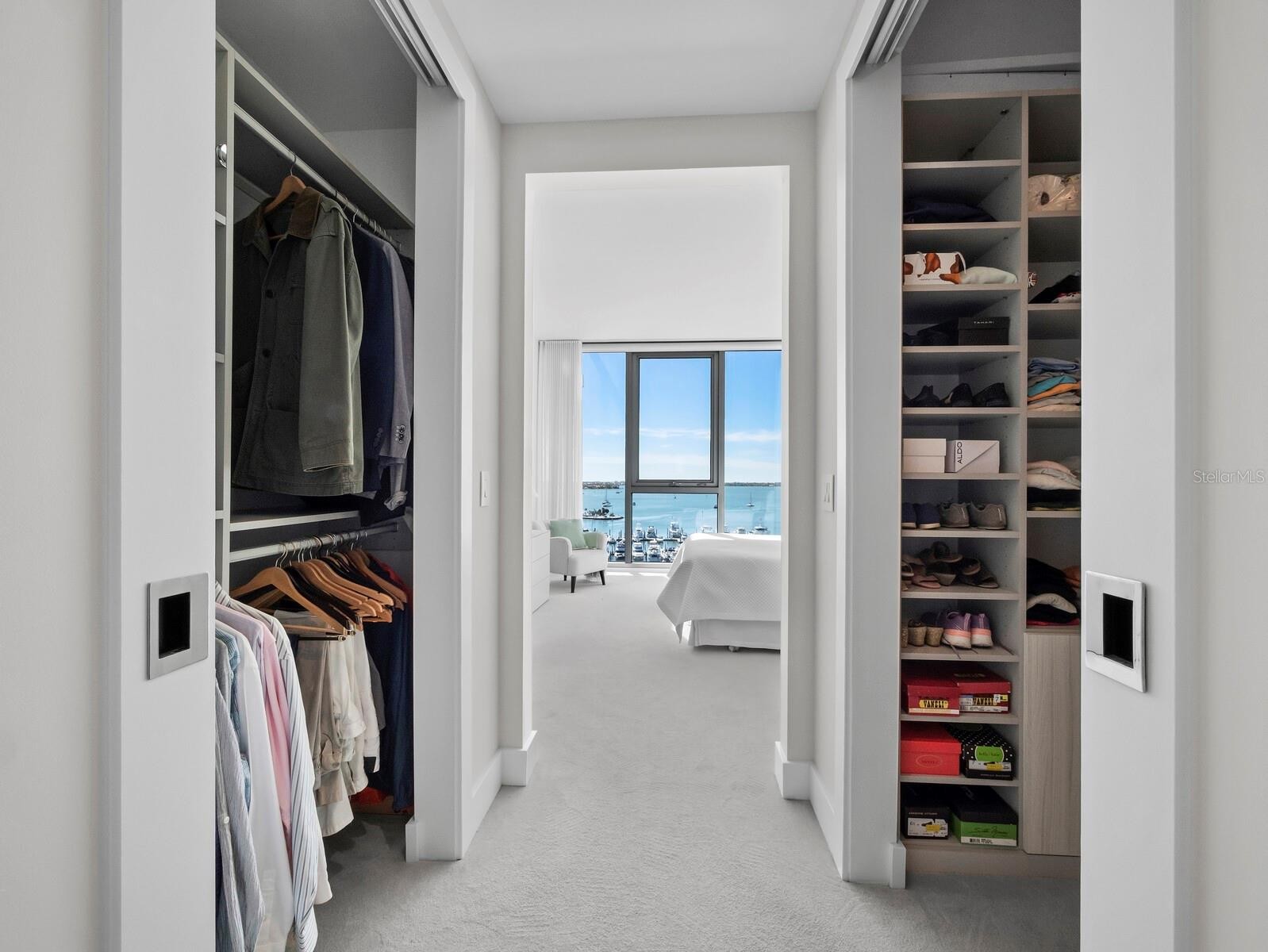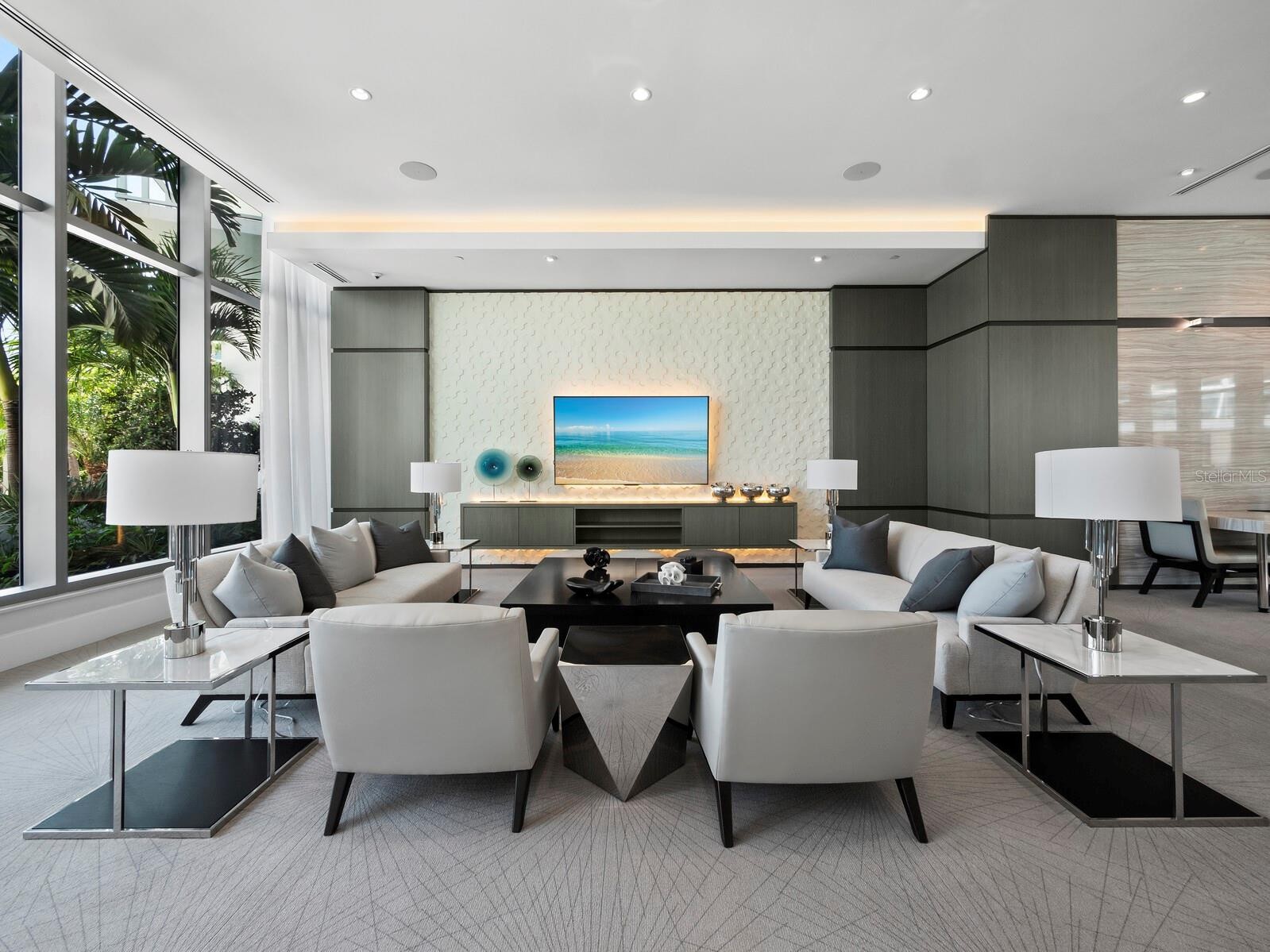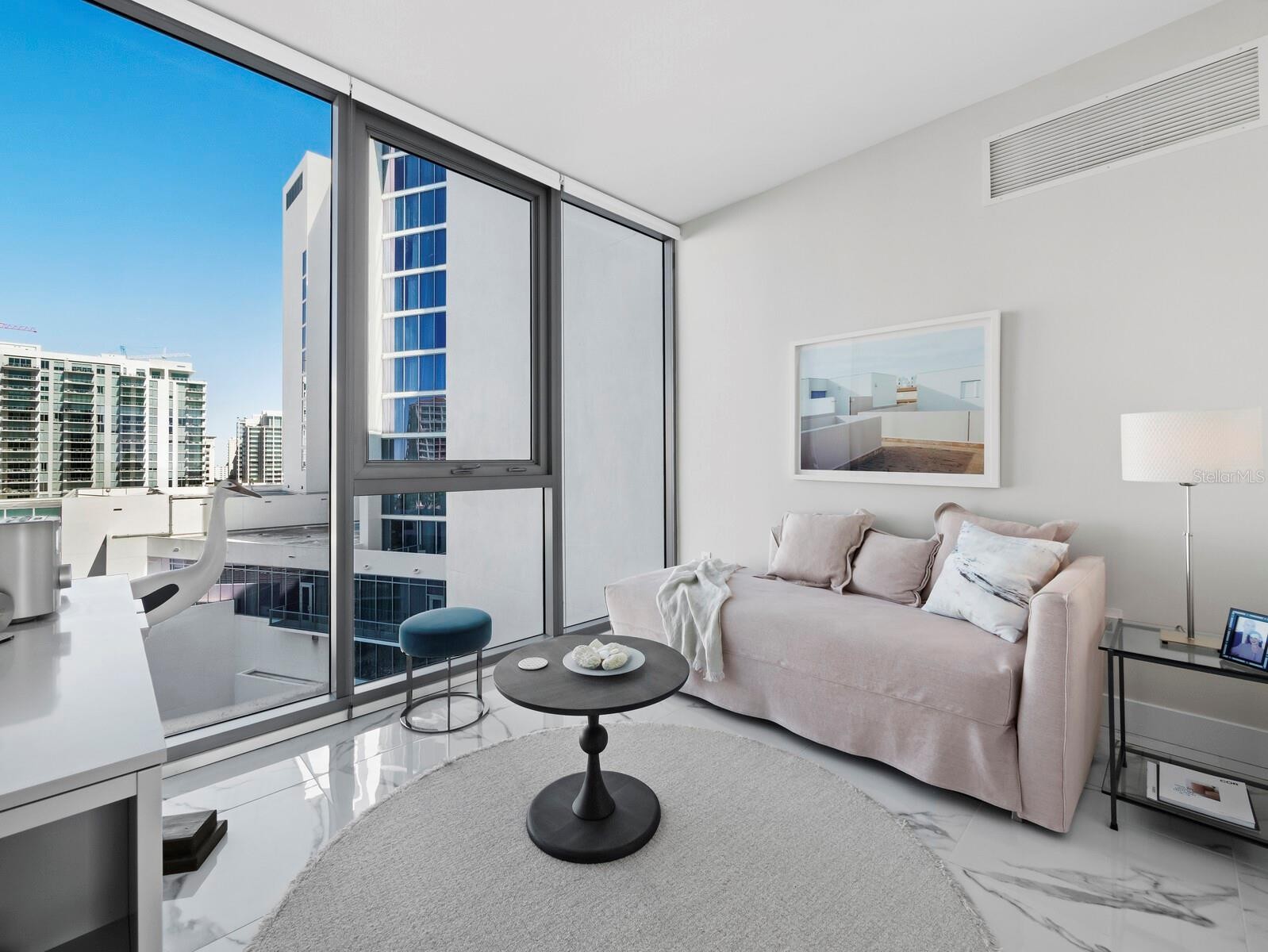 Numerous functional and design upgrades add significant value to this pristine, high-floor residence in one of Sarasota's most sought-after buildings. Positioned in a stack preferred for its through sight lines that showcase elevated vistas of both the waterfront and cityscape, this homes luxuries include large format porcelain tile flooring, motorized window coverings, premium custom cabinetry, custom built-ins in the living room and guest room, and designer lighting and fixtures throughout. With a layout ideal for entertaining and personal retreat, 1,770 A/C square feet encompass two large ensuite bedrooms as well as a separate den and powder bath and a dedicated utility and laundry room for added convenience. Private elevator access opens to a central vestibule and corridor that features spectacular, unobstructed views through floor-to-ceiling windows on either side of the residence. In the primary living space, the gourmet kitchen and dining area flow easily with the living room, all overlooking and opening fully to a deep private terrace with coveted southwestern exposure and marina views. Full-height windows and sliding glass doors create a seamless connection to the outside, expanding the living space with additional room for lounging and dining. Accentuated by a chic modern pendant, the dining area inside accommodates a table for six or more, with adjacent counter seating at the oversized kitchen island. Arranged for optimal prep and hospitality, the kitchen features premium appliances and finishes including stainless double-door refrigerator, range and hood, wall oven, integrated microwave, and a deep basin sink. Bespoke cabinetry and surfaces complement the homes elevated modern style. Past the great room, the spacious owners suite enjoys exquisite west-facing views through a wall of glass, with room for seating, dual closets with custom built-in wardrobe systems, and a spa-like bathroom with separate water closet, glass enclosed walk-in shower and an extra-long double vanity with cosmetic station. On the other side of the home, a large guest room enjoys an ensuite with soaker tub and floor-to-ceiling windows overlooking Downtown Sarasota. City views extend to the adjacent den, a generously sized flex space ideal for a media lounge, private office, or occasional hospitality. Beyond the interior, this unit has the considerable advantage as one of only six in the building with a parking space that can be equipped for EV charging. Located within steps of the waterfront at the heart of Downtown Sarasota, VUE is renowned for its resort-style amenities and gleaming modern features. From the notable service amenities including valet and concierge to the heated pool and spa with lounge areas, firepits, and grill station, and state-of-the-art fitness and resident lounges, this building offers a truly luxurious lifestyle. Furnishings available by separate offer for the ultimate convenience of turnkey acquisition.