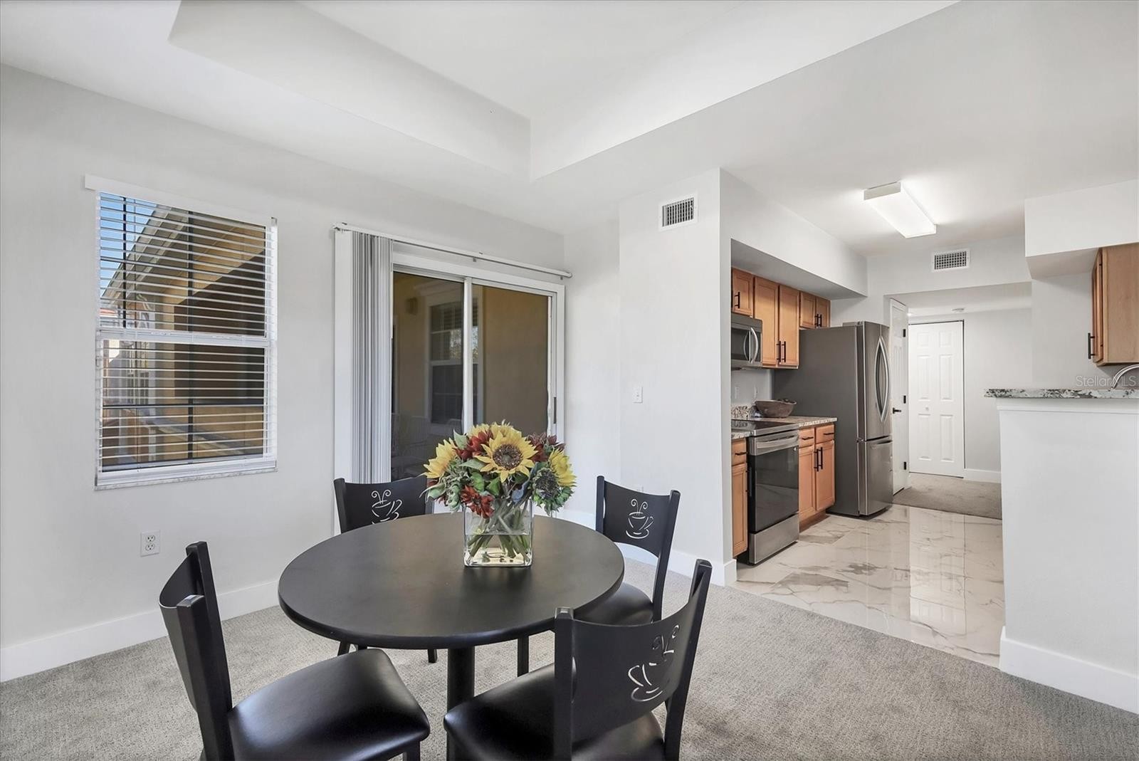 If you’re searching for a beautifully updated 3-bedroom, 2-bathroom condominium in the highly desirable, gated Villagio community near downtown Sarasota, this is the one. This inviting residence has been recently refreshed with plush new carpeting, stylish tile flooring in the kitchen and bathrooms, as well as updated fans and light fixtures throughout. From the moment you step inside, you’ll appreciate the bright, open-concept living and dining area, enhanced by elegant tray ceilings that add architectural charm. The centrally located kitchen is both functional and welcoming, offering abundant cabinetry, stainless steel appliances, granite countertops, and a breakfast bar that’s ideal for casual dining or entertaining guests. Retreat to the spacious primary suite, your own private haven featuring an updated ensuite bathroom with shower, a generous walk-in closet, and a versatile office or additional storage nook. Sliding doors from both the primary bedroom and dining area bring in lots of natural light and lead to a large, covered lanai—perfect for morning coffees or relaxing evenings. Two additional bedrooms provide ample closet space, and the guest bathroom with a bathtub is right next door. An in-unit laundry room with washer and dryer adds everyday convenience. Keep your cars protected from the elements, two deeded covered carports come with the unit. Villagio residents enjoy outstanding amenities, including a clubhouse with fitness center, heated resort-style pool, tennis and pickleball court, and a fenced dog park. Ideally situated near downtown Sarasota, marinas, and the Baltimore Orioles’ spring training facility at Ed Smith Stadium. You’ll also be just a short drive away from the stunning beaches of Lido Key and Siesta Key. Travel is effortless with close proximity to Sarasota/Bradenton International Airport and I75 and US301 close by. Whether you’re seeking a full-time residence, a winter retreat, or an investment opportunity this exceptional condo offers it all. Call today to schedule your private showing or virtual tour.