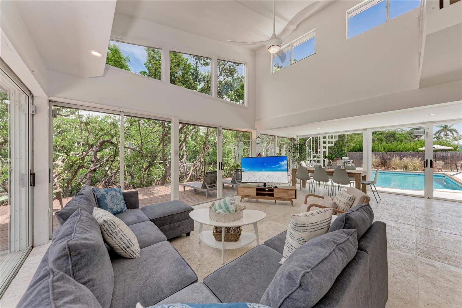 Discover Mia Bella — a rare canal-front estate on Anna Maria Island’s coveted North End. Set on an oversized 11,000+ square-foot lot with more than 94 feet of boatable canal frontage, this exceptional property offers direct boating access to the Intracoastal Waterway, Tampa Bay, and the Gulf of Mexico, along with a private dock. Located on a quiet residential street just steps from the sandy beaches and two blocks from Pine Avenue’s shops and dining, Mia Bella delivers the ultimate island lifestyle where location truly matters. Completely restored and thoughtfully updated, this distinctive property blends Old Florida charm with modern coastal design. The estate includes a spacious single-level main house and an attached glass-wrapped villa, both positioned to capture tranquil canal and pool views framed by mangroves and passing boats. The main residence offers three bedrooms and three full bathrooms, including two ensuite suites, along with an oversized two-car garage — a rare and highly sought-after feature for an island home with plenty of space for a golf cart. Restored terrazzo floors create a light, breezy coastal feel throughout. The brand-new kitchen features classic white shaker-style cabinetry, quartz countertops, and stainless steel appliances and opens to the main living areas designed for easy indoor–outdoor flow. Hurricane-impact doors, windows, and sliders are installed throughout the main house, which is fully flood-protected with Hammerhead flood barriers and also features a new metal roof for added durability. All bathrooms have been fully updated with fiberglass showers, quartz vanity tops, and Kohler fixtures. The attached villa is a true showpiece, surrounded on three sides by floor-to-ceiling glass and highlighted by a dramatic lofted ceiling. The ground level includes a sleeping area, kitchenette, two-story living space, and a full bath, while a spiral staircase leads to a charming second-floor loft bedroom (access is outside via the 2nd floor deck) — a fun and flexible retreat for guests. Mature tropical landscaping and professional lighting provide privacy and ambiance throughout the property, creating a serene island setting. Mia Bella offers additional protection with Hammerhead flood barriers at the front entry, both garage doors, and the back sliding door. Recent improvements include impact-rated openings, new kitchen cabinets, bathroom vanities, a boat dock, redesigned decks, a resurfaced pool, new pool equipment, and a new metal roof. The list goes on and on. Offered fully furnished and operating as a successful vacation rental with strong income history and future bookings in place, Mia Bella is ideal as a luxurious second home or a high-performing investment. Oversized lot, premier North End location, boatable canal frontage with dock access, rare oversized garage, and thoughtfully designed storm and flood protection for the main house make this a truly special Anna Maria Island property. *Property information deemed reliable but not guaranteed. Buyer and Buyers agent to verify.