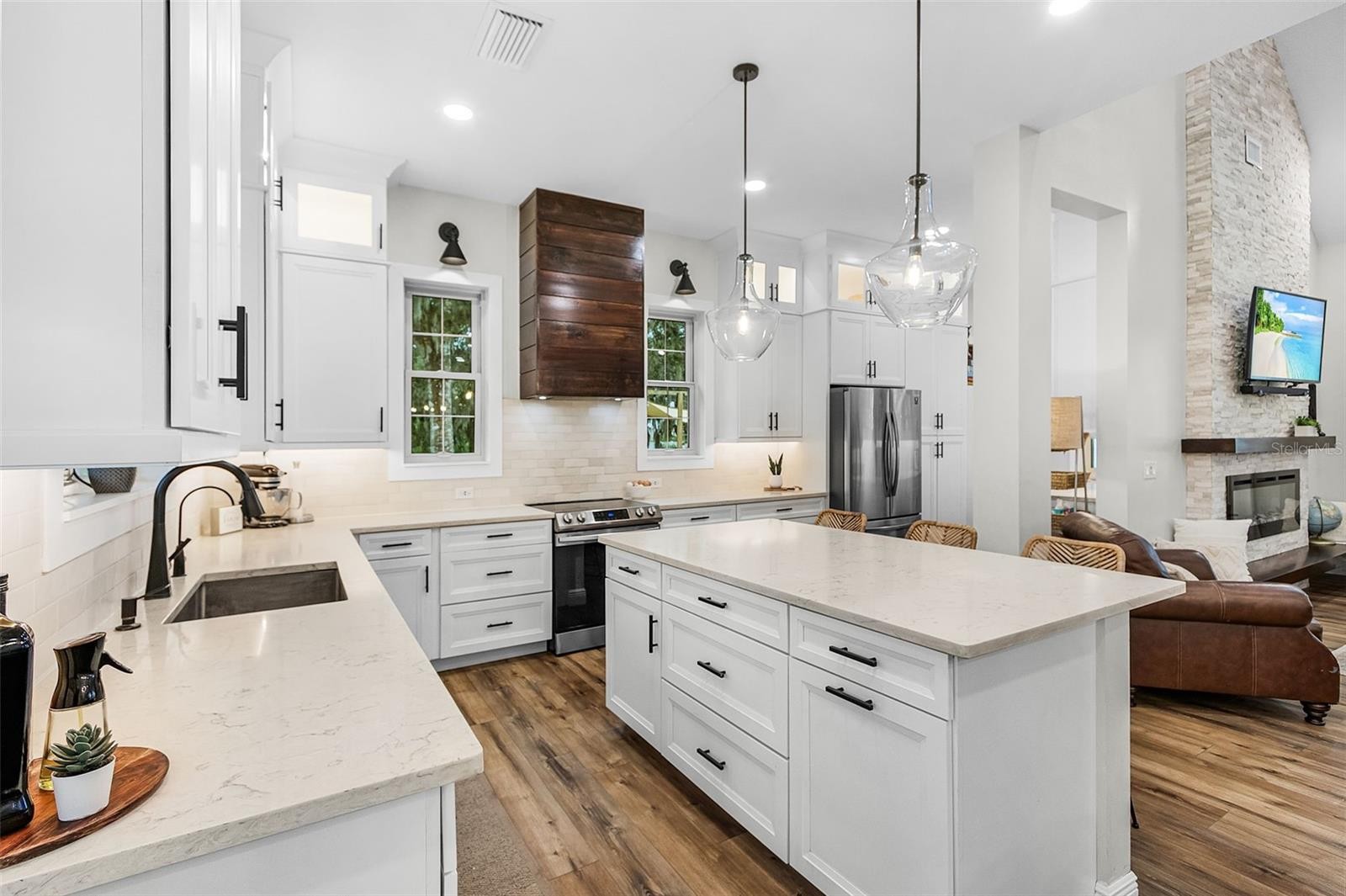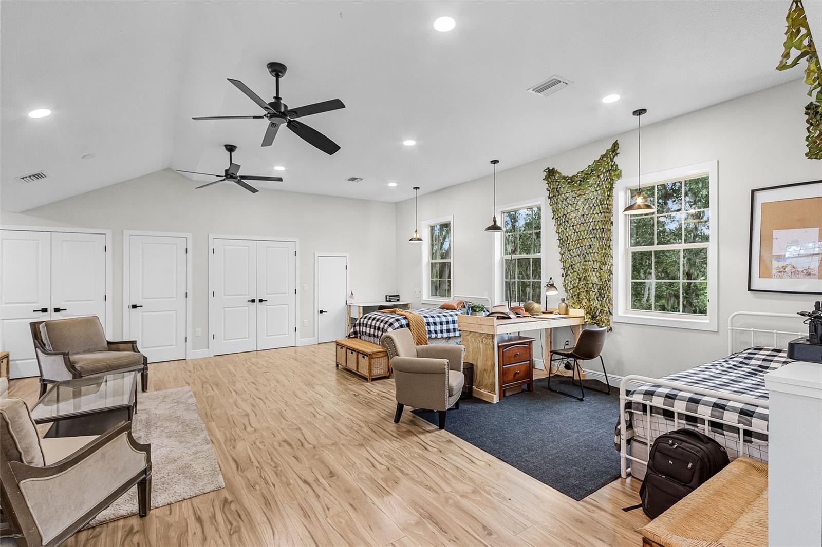 Feel welcomed by the scenic tree-lined country road where sunlight dances through the branches and horses, cows and rolling farmland invite you to a romantic, modern farmhouse with 2 stories and 2 buildings next to each other on a 4.13 acres lot filled with mature oak trees, a cute chicken farm and lots of private space. The main house has 1894 sq ft under air and the second building is an additional 1006 sq ft under air for a total of 2900 sq ft under air. You will immediately notice the open 1100 sq ft front porch, and stylish fiber cement siding that create a warm, yet polished look. Inside the main house, a 20ft ceiling grabs your attention and an open floor plan awaits featuring a spacious great room with an electric fireplace and abundant natural light. The gourmet kitchen boasts quartz counter tops, stainless steel appliances, a large center island, custom cabinetry and a secluded butler pantry with more cabinetry and counter space. The kitchen shows both cozy, practical and a touch of modern luxury. The primary suite offers a private retreat with a spa-like bathroom featuring a soaking tub, glass enclosed shower and functional vanity. The luxury powder room, a washer and dryer and lots of storage spaces sit nicely tucked away between bedroom and living room. A beautiful crafted stairwell makes a statement the moment you walk in. Upstairs you will find a spacious loft, a charming bedroom and a full bathroom offering the perfect space for a growing family. The second home, with its own separate entrance, at a few steps away, features a 974 sq ft 3 car garage for tools, lawn mowers and tractors. Upstairs you discover a full secondary 1006 under air sq ft living space with one large bedroom, a bathroom, a laundry and more storage space. Want to be creative and turn this into a mother-in-law suite, a home office or even rental potential.......this space adds incredible versatility to the property. This nearly 5-acre lot is a nature lover’s dream, featuring majestic mature oak trees that provide shade and beauty throughout the property. Expansive lawn areas comes with plenty of space for play, entertaining, or simply enjoying the outdoors. A charming chicken coop, a thriving vegetable garden and many mature fruit trees make it easy to embrace a farm-to-table lifestyle right at home. Major roads and highways within minutes, 2 Publix's only 1 mile away. Many major grocery stores like Costco and Target just 15 miunutes away. Beautiful brand new park at walking distance. Lots of shopping and restaurants only 8 minutes away. Do not miss this one!