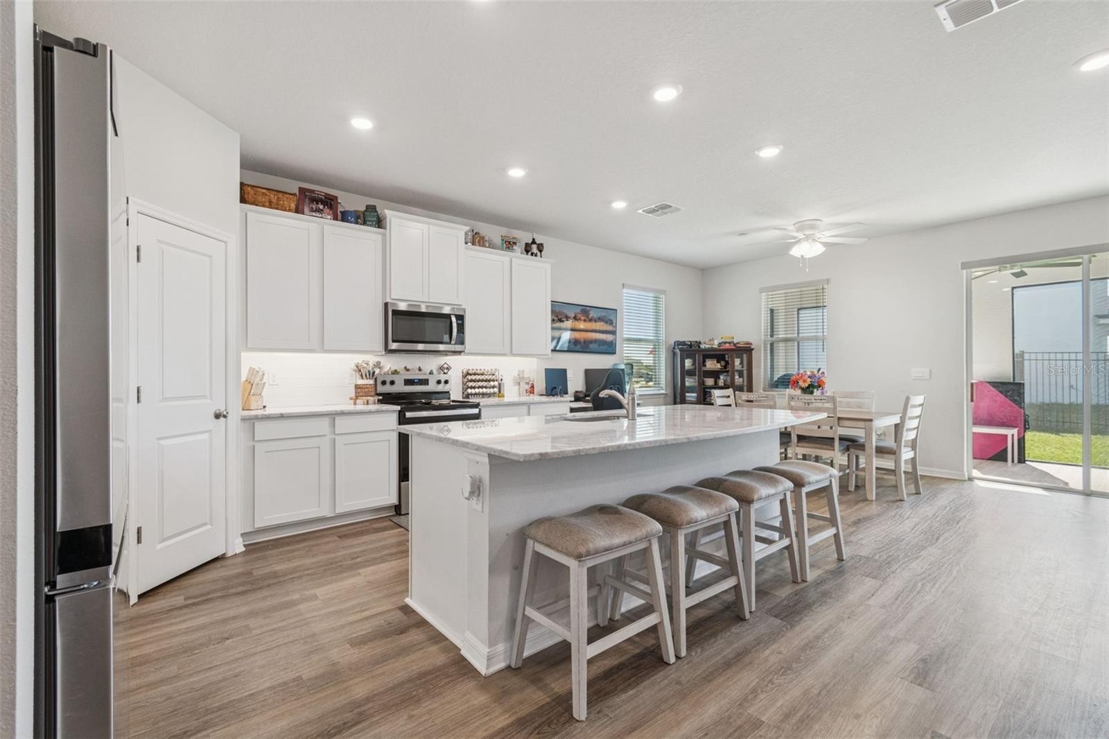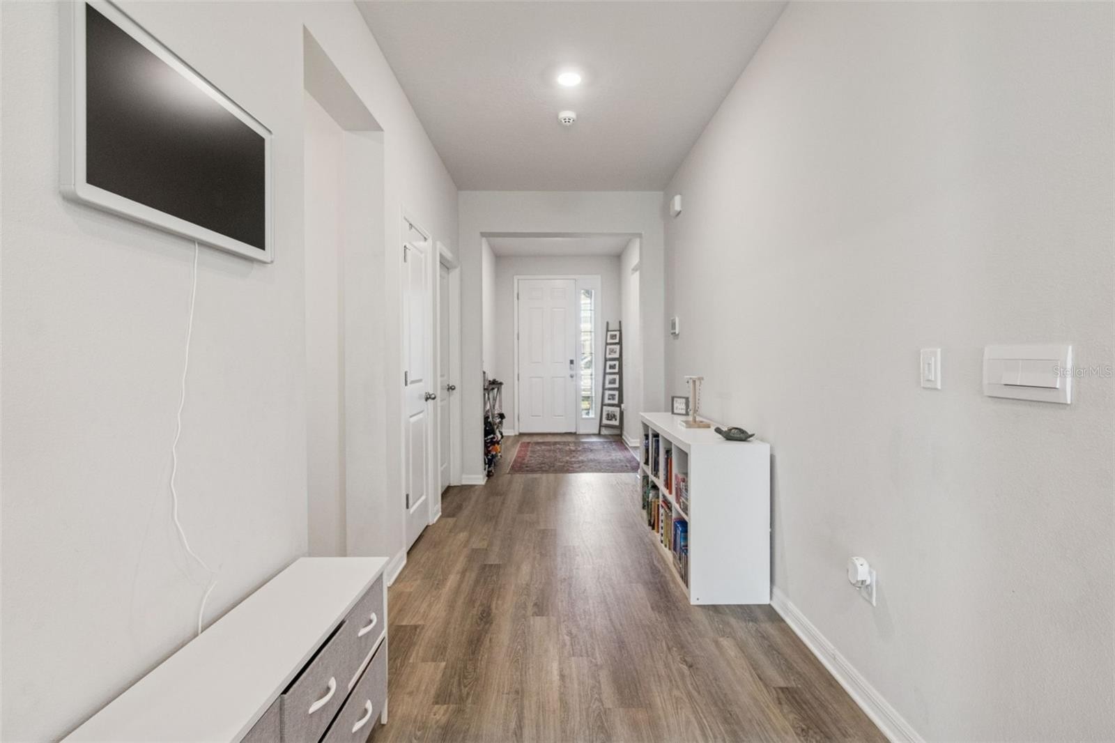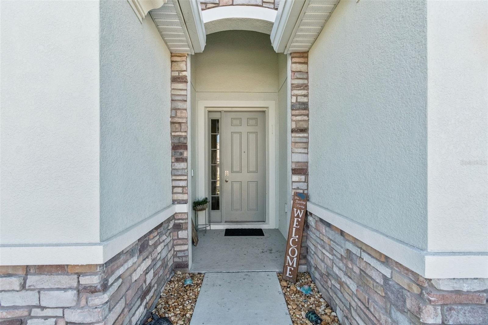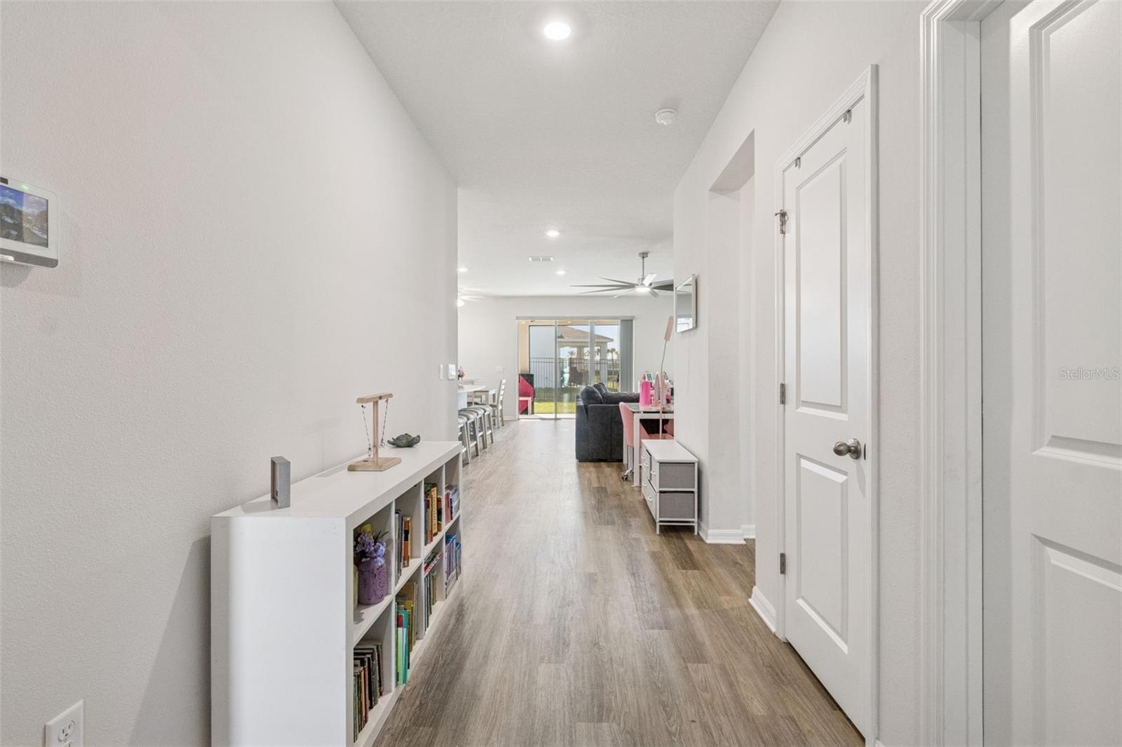 Welcome to easy Florida living in Bella Lago. This beautifully maintained one-story, all-concrete-block home offers the perfect blend of comfort and open-concept design across 2,045 sq. ft. of thoughtfully used space. Step inside to a bright, flowing layout where the open floor plan connects the living, dining, and kitchen areas—ideal for both everyday living and entertaining. The kitchen features white cabinetry, quartz countertops, and a clean, modern feel that continues into the bathrooms with matching quartz finishes. The primary suite is a true retreat with a tray ceiling, his-and-hers walk-in closets, and a spacious ensuite bath complete with dual sinks, an extra-large vanity, garden tub, separate shower, and private water closet. At the front of the home, you’ll find two secondary bedrooms sharing a full bath, offering a smart layout for guests or family. A fourth bedroom and half bath provide added flexibility for an office, nursery, or flex space. Enjoy Florida’s indoor-outdoor lifestyle with sliding glass doors that lead to a screened-in lanai overlooking peaceful pond views. Updated landscaping and palm trees enhance the curb appeal and tropical feel. Located in the highly desirable Bella Lago community, residents enjoy access to two resort-style pools, a fitness center, a playground, and a dog park. A spacious 2-car garage, quality concrete block construction, and a corner lot make this home as practical as it is beautiful. This one checks all the boxes for comfort, style, and location!