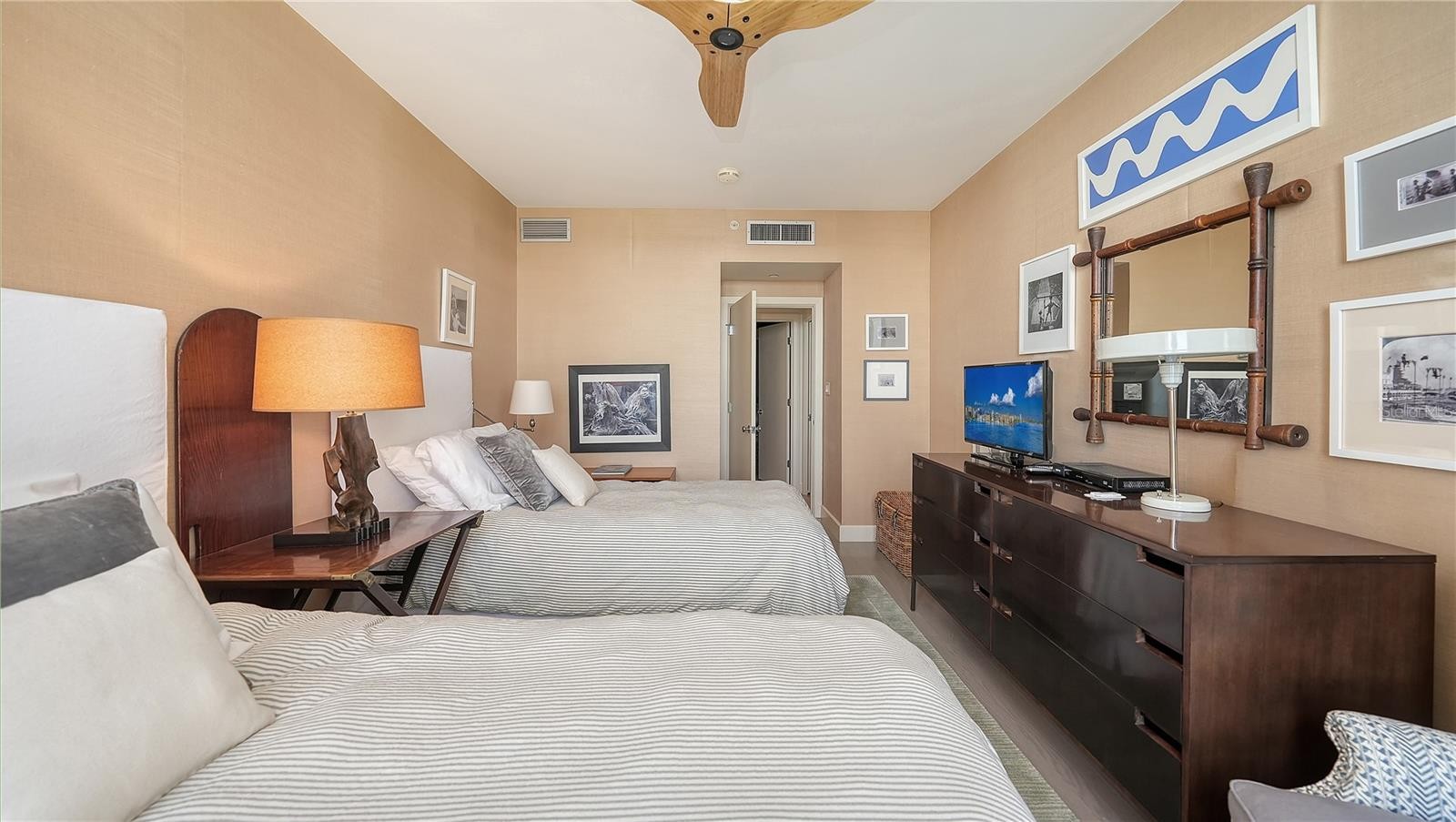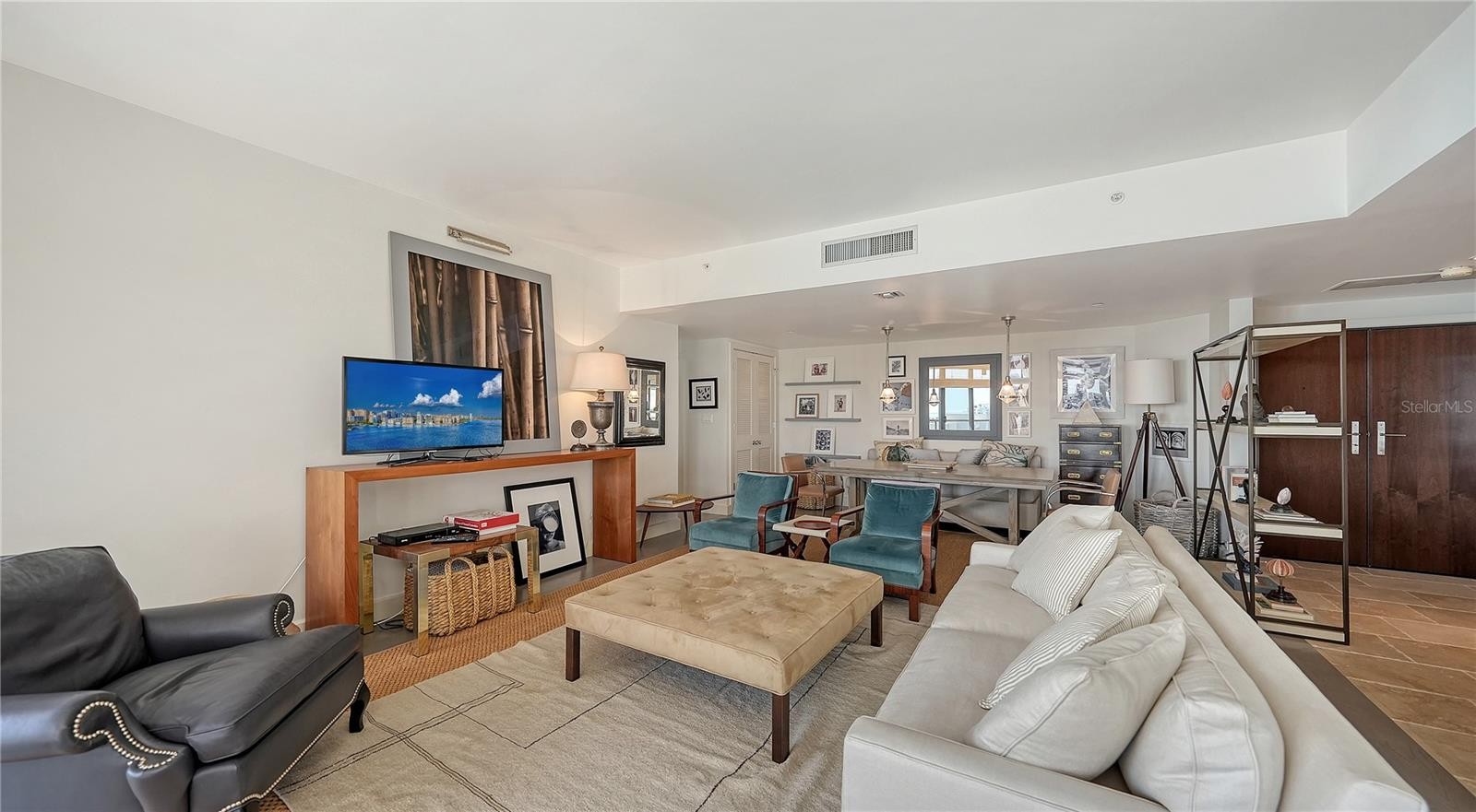 Positioned on the south side and sixth floor of The Promenade on Longboat Key, Residence #610 delivers a true move-in-ready coastal retreat with sweeping Gulf-to-bay views that unfold the moment you enter. From sunrises over Sarasota Bay to sparkling views across the Gulf of Mexico, nearly every room captures water vistas that define the island lifestyle. Offered fully furnished, this updated residence showcases a refined blend of travertine and rich wood flooring, crisp architectural lines, and an abundance of natural light pouring through expansive glass sliders. The open living and dining areas are framed by walls of glass that lead to the private terrace—an ideal vantage point for morning coffee overlooking the Gulf or evening relaxation with the shimmer of bay and downtown skyline vistas in the distance. The contemporary kitchen is thoughtfully designed with sleek surfaces, ample cabinetry, and generous counter space, flowing seamlessly into the main living areas for effortless entertaining. The bright ambiance continues into the bedrooms, where large windows highlight panoramic water and skyline views while maintaining a sense of privacy and comfort. The split-bedroom floor plan ensures privacy, with a spacious primary suite offering dual walk-in closets, terrace access, and an en-suite bath with dual sinks, soaking tub, separate shower, and private water closet. The guest suite includes a walk-in closet and its own en-suite bath, ideal for visitors or seasonal stays. Every detail reflects a residence that has been meticulously maintained and is ready for immediate enjoyment—whether as a full-time home or seasonal escape. The Promenade is a gated, Gulf-front community known for its exceptional amenities and attentive service. Residents enjoy a 24-hour manned guard gate, concierge services, on-site management, secure lobby, health club facilities for men and women, social rooms, four Har-Tru tennis courts, a Gulfside sundeck, and an oversized heated swimming pool and spa. A private boardwalk leads directly to the beach that elevate everyday coastal living. Situated on the south end of Longboat Key, The Promenade offers convenient access to the Longboat Key Club’s golf and marina facilities (access is available with separate memberships), waterfront dining, and nearby shopping. St. Armands Circle and downtown Sarasota are just minutes away, where boutiques, theaters, art galleries, and renowned restaurants define the Cultural Coast lifestyle. Promenade #610 presents a rare opportunity to enjoy turnkey beachfront living with panoramic water views, resort-style amenities, and proximity to everything that makes Longboat Key and Sarasota so desirable.