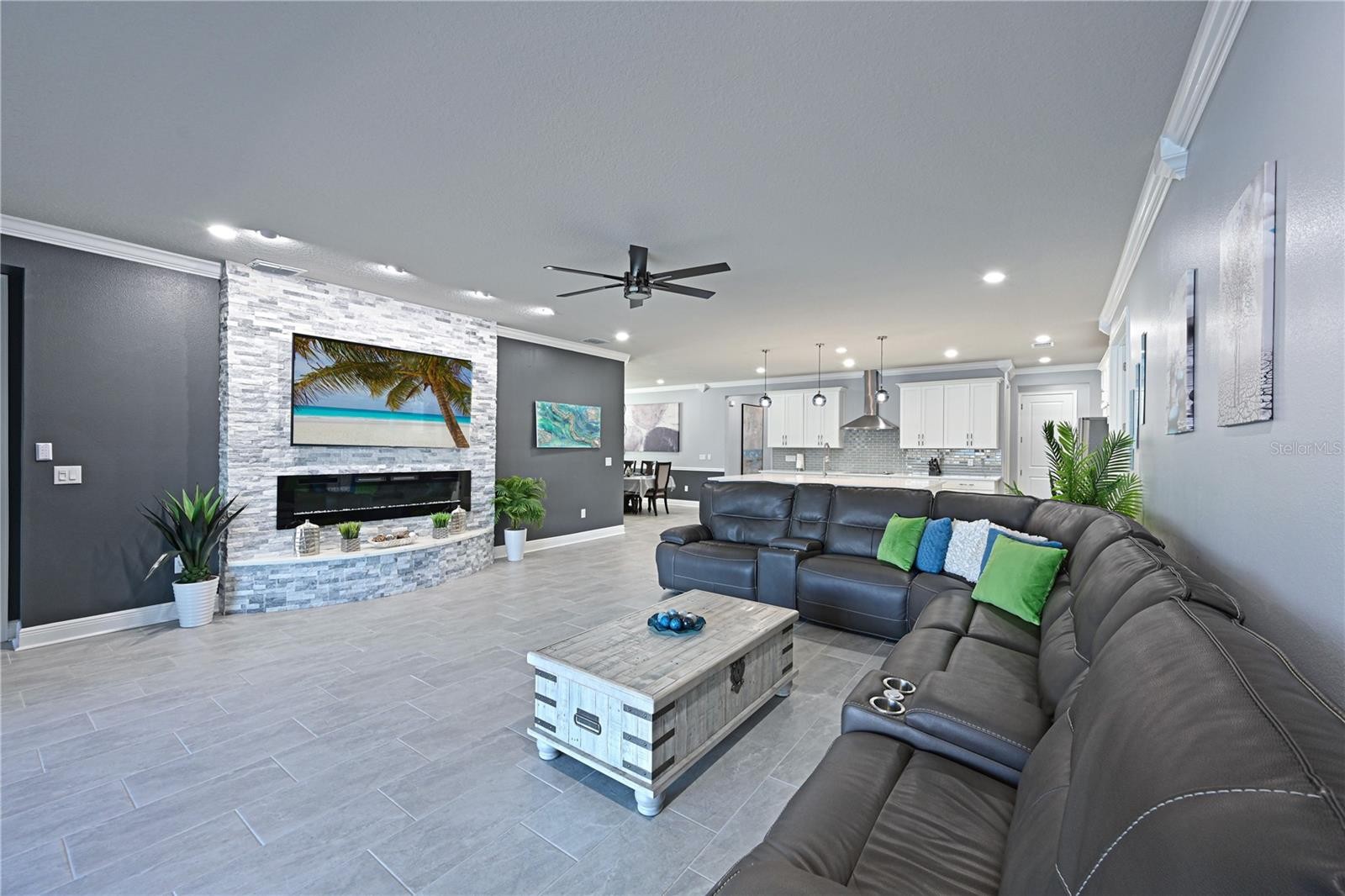 You just found your next home— where style, space, and smart upgrades come together in one exceptional home. Located inside the gated community of Windwater, this beautifully designed 4-bedroom, 3.5-bath home offers the perfect blend of functionality and Florida lifestyle. With a dedicated office/den and a spacious bonus room featuring French doors, there’s flexibility for working from home, a media room, playroom, or private guest retreat. The open-concept floor plan creates seamless flow between the living, dining, and kitchen areas — ideal for entertaining and everyday living. he kitchen is truly a standout, offering abundant countertop and cabinet space, making meal prep and storage effortless. A separate coffee bar or beverage station provides the perfect spot for morning routines or evening entertaining. The refrigerator features craft ice, adding a touch of luxury to your drinks, while the walk-in pantry ensures you’ll never run out of storage space. The spacious primary suite is designed for comfort and functionality, featuring two walk-in closets for exceptional storage. The ensuite bath offers split dual sinks, providing plenty of room to get ready with ease, and a beautifully designed walk-in shower with glass enclosure and dual shower heads. Bedroom 2 includes its own ensuite bath, great for guests or multigenerational living. Step outside to your extended paver lanai and experience true outdoor living at its finest. The panoramic screen enclosure frames peaceful views of the lake while the fully equipped outdoor kitchen — complete with flattop grill, traditional grill, two refrigerators, and a wine cooler — makes hosting effortless. With three mounted TV locations, this is the ultimate game-day and gathering space. Major upgrades in 2025 provide peace of mind for years to come, including: Brand-new roof with 50-year shingles, hurricane-impact windows and doors, gutters, and interior and exterior paint. The laundry room has added cabinets for additional storage. The three-car tandem garage offers overhead storage, and the extended driveway provides parking convenience. Windwater residents enjoy gated security, a community pool, paw park, and tot lot — all with NO CDD fees. This home truly checks every box: space, upgrades, outdoor living, and community amenities. Schedule your private showing and experience it for yourself.
