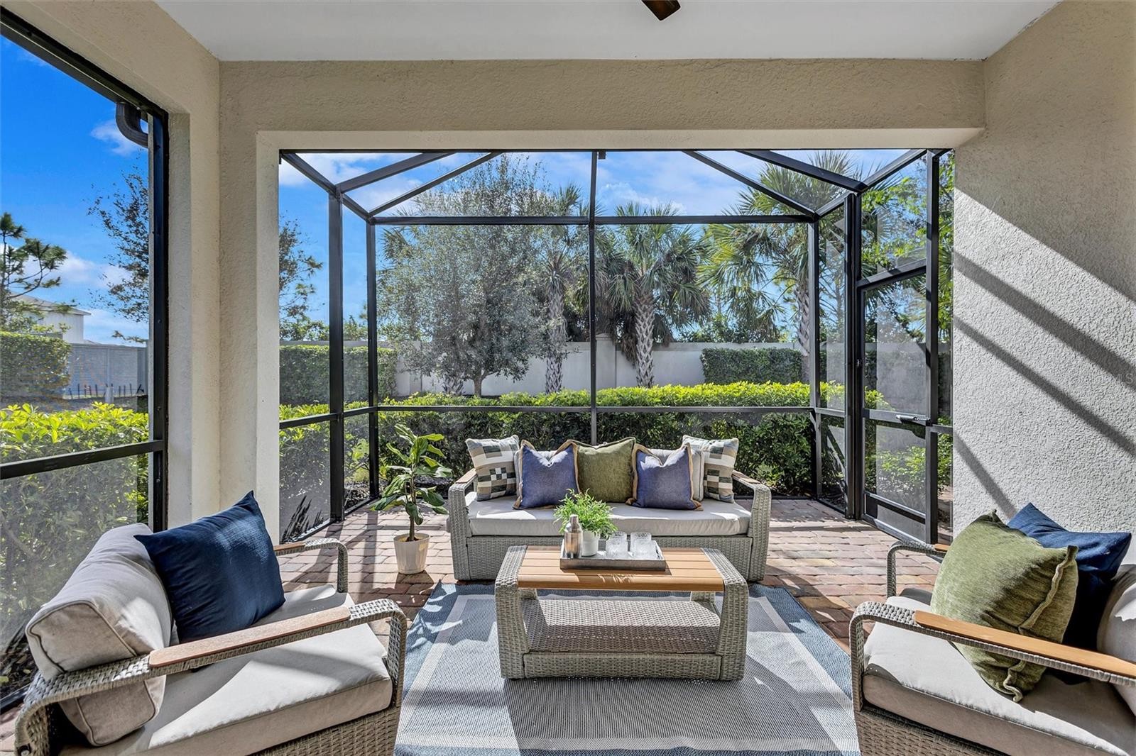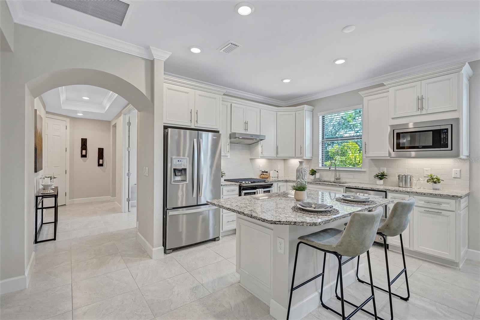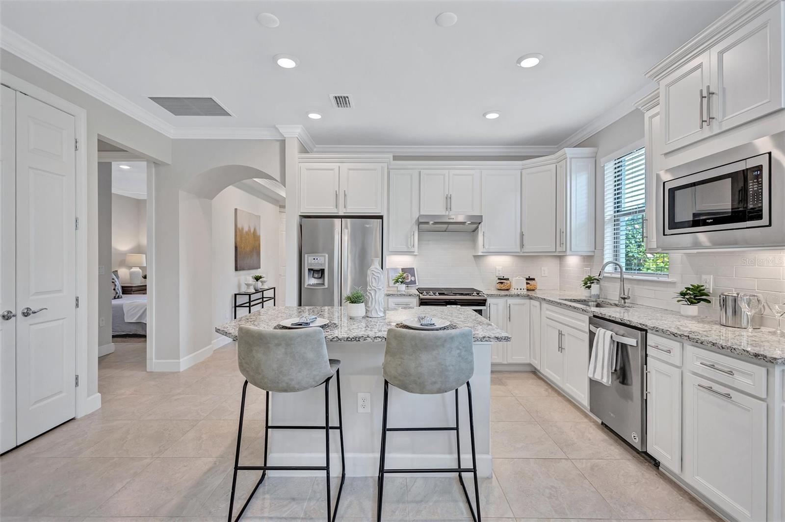 Finally – the one you have been waiting for! This stunning 2021 Cressida model offers Impact Windows & Doors, extensive upgrades inside & out, and an exceptional end-of-the-cul-de-sac location that provides rare privacy. Designed to live like a single-family home, it features a 24-ft Courtyard entry & an impressive 29-ft extended covered lanai overlooking a tranquil, natural Florida backdrop. This open, light-filled floor plan features 9-ft ceilings, 8-ft interior doors, & abundant windows only an end-unit can provide. Easy-care porcelain tile & crown molding throughout complement the coastal-inspired, light-toned finishes. At the heart of the home, the Chef’s kitchen delights with a natural gas 5-burner range, 42-inch solid-wood cabinetry with soft-close drawers & pull outs, granite countertops, upgraded stainless appliances, under-cabinet lighting, a large pantry, and an island with extra storage & breakfast bar seating – perfect for everyday living or entertaining. The gracious living area flows seamlessly through stacking sliders to the extended, pavered, covered and screened lanai for your private outdoor retreat. The luxurious primary Ensuite is a true oasis, offering comfort-height granite counters, double undermount sinks, upgraded fixtures, and enlarged walk-in shower, separate linen storage and oversized walk-in closet & a private water closet. A versatile flex room allow you to personalize the space to your lifestyle, while the separate laundry room and mud-room entry from the 2-car garage add thoughtful convenience. Located in a maintenance-free, gated community, you’ll enjoy Resort-Style Amenities including a Clubhouse, Barefoot Bar, heated Pool & Spa, fitness center, pickleball, tennis, bocce ball, fire pit, fishing pier & an on-site Property Manager. Furry family members are welcome too, with a 2-dided dog park for both large & small pups. All of this with easy access to Downtown Sarasota’s cultural attractions, charming Downtown Venice, world-famous beaches and the 20+ mile Legacy Trail. Don’t miss this special opportunity to own this move-in-ready piece of Paradise!