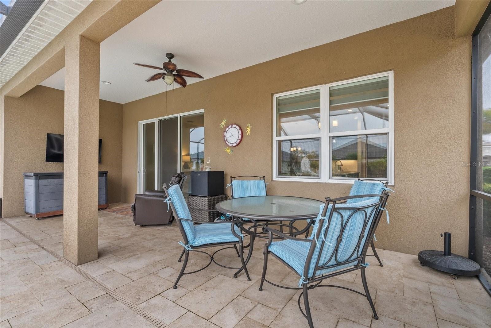 Live the Florida lifestyle you’ve been dreaming of in this upgraded pool home inside the gated community of Eagle Trace — with NO CDD fee! Designed for comfort and style, this 2-bedroom, 2-bath home PLUS a den offers 1,863 square feet of open living space and seamless indoor-outdoor flow. From the moment you enter, the home feels bright and expansive with high ceilings and tile flooring throughout, creating a clean, modern look. The open-concept great room anchors the home and connects effortlessly to the dining area and kitchen, forming the perfect space to gather and entertain. The kitchen features rich cabinetry, quartz countertops, stainless steel appliances, a gas range, subway tile backsplash, pendant lighting, and a large island ideal for casual dining. A sunlit breakfast nook overlooks the pool, bringing the outdoors in. Custom window treatments throughout, including privacy treatments on the great room glass slider, add both style and function. The split-bedroom floor plan ensures privacy, while the den with French doors offers flexible space for a home office, media room, or potential 3rd bedroom. The spacious primary suite includes a walk-in closet and an en suite bath with dual sinks and a walk-in shower, creating a peaceful retreat at the end of the day. Step outside to your private screened lanai and enjoy a heated saltwater pool with a sun shelf, framed by elegant travertine pavers. Whether hosting friends or enjoying a quiet morning coffee, this outdoor space is built for year-round enjoyment. Additional highlights include a 2-car garage, indoor laundry room, low HOA fees that include lawn maintenance, and NO CDD fee. Eagle Trace residents enjoy amenities including a community pool and spa, tennis and pickleball courts, outdoor grilling area, dog park, nearby nature trails, and access to top-rated Lakewood Ranch schools, all within a secure gated neighborhood close to shopping, dining, and Gulf Coast beaches.