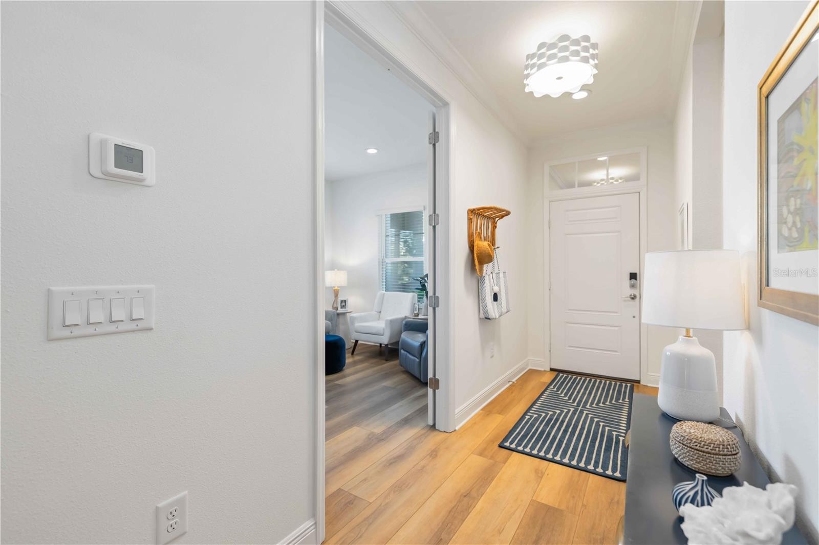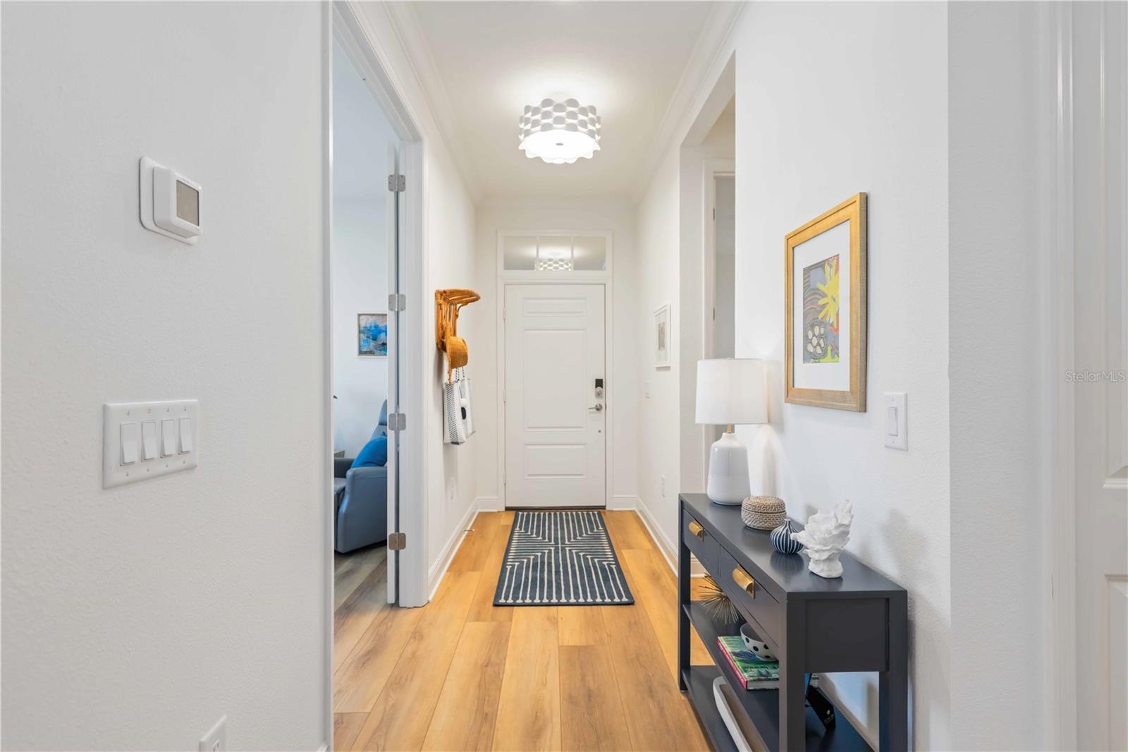 Better than the builder’s model and loaded with upgrades you won’t find in other villas, this stunning 2023-built 2-bedroom, 2 bath + flex room home in Grand Palm is the one buyer’s wait for — and they don’t last. Perfectly positioned on a large corner lot with desirable southern exposure, you’ll enjoy gorgeous sunrise views over the lake from your extended lanai, surrounded by mature landscaping for rare privacy. Inside, the difference is immediate — 8-foot doors throughout, elegant crown molding, a custom shiplap tray ceiling in the living room, and a designer accent wall create a high-end, model-like feel. Luxury vinyl plank flooring, upscale lighting, and premium window treatments — including an expensive upgraded slider treatment — elevate every space. Hurricane-impact windows and doors provide security and peace of mind. The kitchen is beautifully appointed with upgraded cabinetry featuring soft-close drawers and pull-outs, Upgraded appliance package including convection oven, RO drinking water faucet , Over-cabinet lighting, and even dedicated power in the pantry for small appliances. Thoughtful details continue with power in the front closet for a charging station; dimmer switches on the lanai and in bath two, upgraded tile in the bathrooms, and a highly desirable easy-access shower not found in other villas. A whole-house water softener, reverse osmosis drinking water system, epoxy garage flooring, and added storage shelving complete this exceptional home. This is not a standard new build — it’s a meticulously upgraded, move-in-ready villa that truly stands out. If you’ve been waiting for something special in Grand Palm, this is it. Schedule your showing before it’s gone.