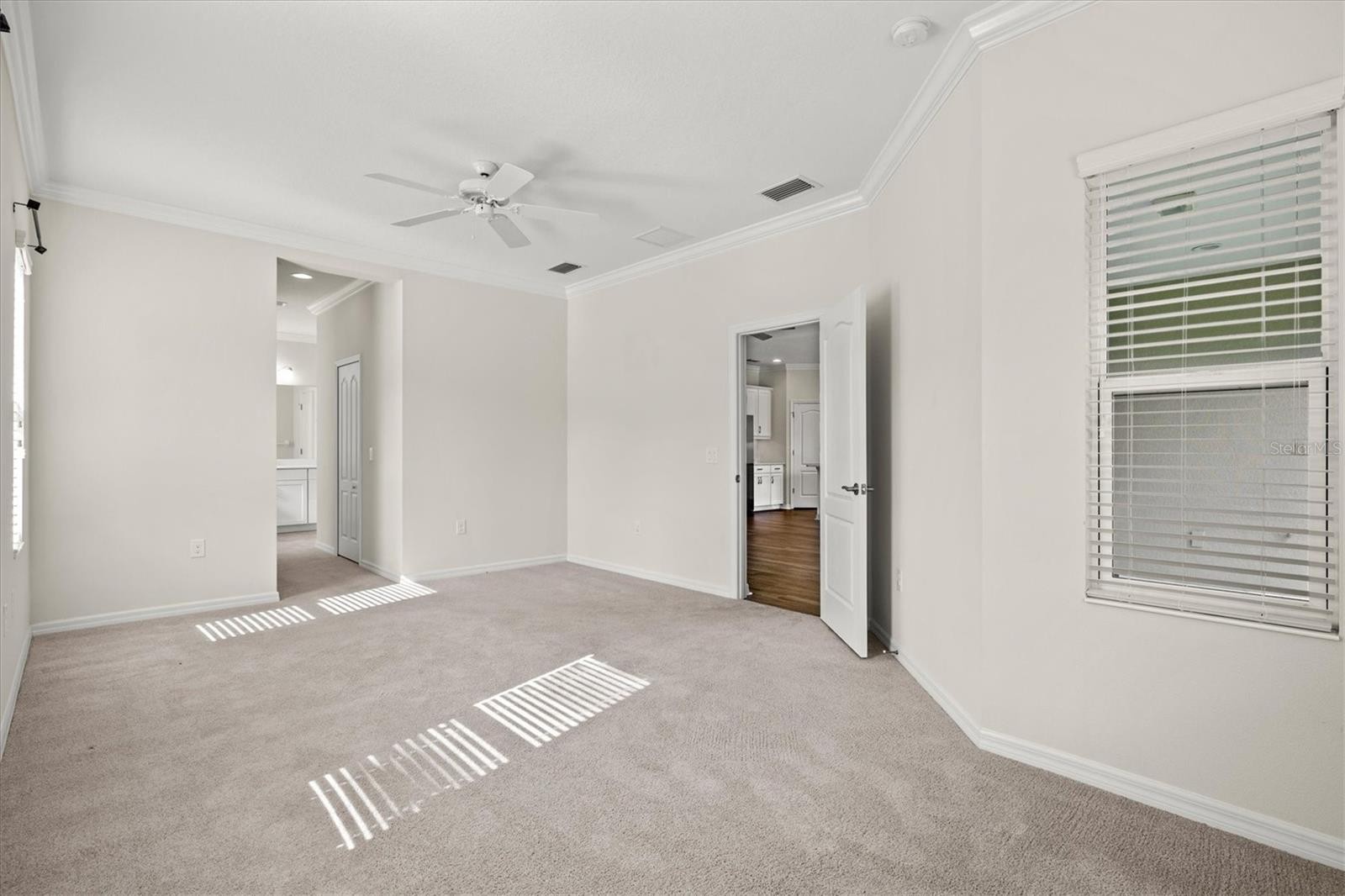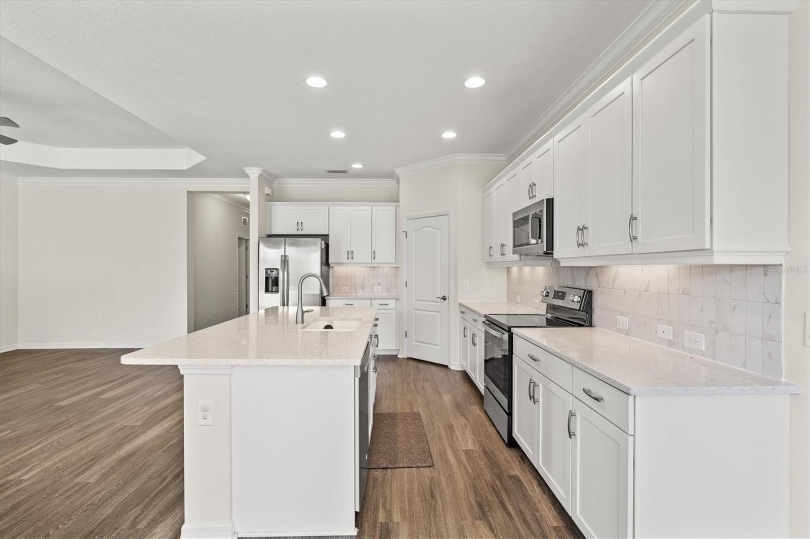Welcome to Windwood, a gated Neal Communities neighborhood. This move-in ready Applause model has been thoughtfully designed by a certified interior designer with elegant touches throughout, including crown molding, tray ceilings, premium tile floors, plush bedroom carpeting, and designer lighting. The kitchen offers exceptional style and function with quartz countertops, stainless steel appliances, white shaker cabinets, and a premium vertical set backsplash—all complemented by a timeless neutral palette. Enjoy peaceful pond and nature views from both the living room and primary suite with no homes behind you for added privacy. Natural gas connections are already in place for a dryer, range, lanai grill, and water heater, adding to the home’s everyday conveniences. Perfectly situated, this home is just minutes to I-75, 5 miles from Nokomis Beach, and only 4 miles from the shops and restaurants on Venice Island—offering the best of Florida living right at your doorstep. This model-perfect residence is the ideal blend of comfort, privacy, and location—ready for you to call home!