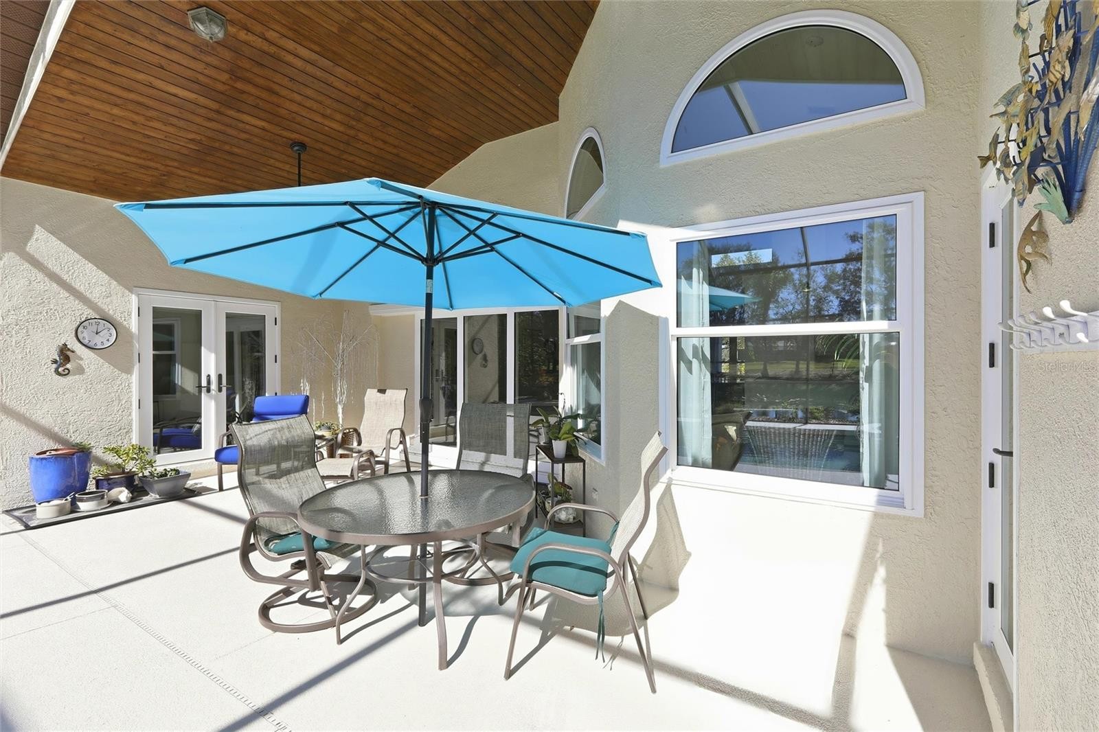 - Open Living Area: The great room features 13’ vaulted ceilings, a wood-burning fireplace, and a media center with a 55-inch LG TV. Expansive 10’ sliding glass doors offer views of the lanai and pool. - Hurricane Prepared: Features hurricane-rated windows and doors, including Lexan panels for the front door. These upgrades earned an 80% insurance discount with the wind mitigation study. Insurance declaration is available for review. - Custom Kitchen: Equipped with custom birch plywood cabinetry, hardwood doors, and Silestone countertops. Premium features include a Franke SS sink, Kohler faucets, a Bosch 800 series quiet dishwasher, and a large pantry with slide-out shelves. - Primary Suite: Includes a sloped ceiling, French doors to the lanai, and a remodeled bathroom. The bath features sapele mahogany wood, a 5’ x 10’ beach-entry shower with dual showerheads, and Kohler brushed brass fixtures. - Additional Bedrooms: Two guest rooms with bamboo flooring and a fourth bedroom/office with vaulted ceilings. - Outdoor Living: A 39’ x 14’ heated pool and 6-person hot tub with Wi-Fi-connected Pentair controls. The lanai features a stained cedar T&G ceiling and a pool cage designed for 140 mph winds. - Garage & Utilities: A three-car garage with finished floors, insulated hurricane-rated doors, and upgraded attic access. Includes a Rheem heat pump water heater, water softener, and whole-house carbon filter. - Security & Tech: Ring security system with three outdoor cameras, Kichler LED path lighting, and a Wi-Fi-accessible Rainbird irrigation controller for the landscaped lot.