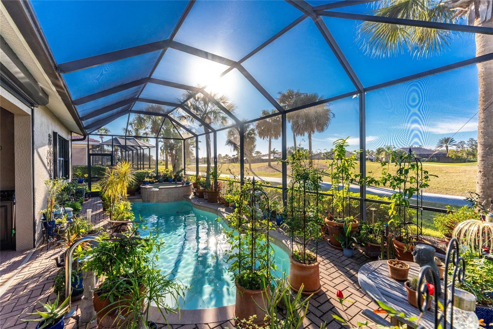 Lush Fairways Views and Your Own Private Poolside Oasis! SPECTACULAR WCI built Florencia MAINTENANCE FREE model with SALTWATER POOL & SPA on a PREMIUM GOLF COURSE LOT! The home is anchored by a large, sun-drenched great room featuring elegant tray ceilings, creating an airy and sophisticated atmosphere for both relaxation and entertaining. This central living space opens through expansive sliding glass doors that blend the indoors with a magnificent screened lanai, where a shimmering pool and integrated spa serve as your private sanctuary. From this vantage point, you can enjoy breathtaking views of the western sunsets, the rolling greens of the golf course, and the tranquil, shimmering water. An open kitchen make this home great to entertain in with granite counters, lots of counter space, a breakfast bar, lovely cabinetry and a cafe style dining area plus you have a formal dining area. This meticulously maintained residence offers three spacious bedrooms with brand-new flooring for a fresh look and a two-car garage. The split-bedroom layout ensures maximum privacy, especially in the primary suite, which boasts a custom-designed closet and a beautifully remodeled shower. Fortified with hurricane accordion shutters this home prioritizes both luxury and peace of mind. Life is effortless here, as the HOA-covered social membership grants you access to resort-style dining, fitness centers, 2 pools including a pool side Tiki bar, tennis, pickle ball and a scenic Myakka River boardwalk—all just minutes from the historic charm of Venice Island and the white sands of Nokomis Beach plus easy access to medical facilities, shopping and Sarasota.