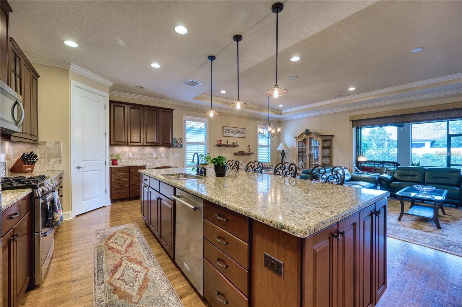 Discover effortless luxury in this beautifully maintained Piceno model located in the sought-after, resort-style community of Esplanade at Lakewood Ranch. This exceptional 2-bedroom, 2-bath home also features a versatile den—perfect as a third bedroom, home office, or flex space to fit your lifestyle. Step inside to an open-concept living area designed for both comfort and style. The gourmet kitchen impresses with solid wood cabinetry, granite countertops, stainless steel appliances, a walk-in pantry, and a built-in desk—ideal for staying organized. Tray ceilings with crown molding, luxury vinyl flooring, and plantation shutters elevate the home’s sophisticated appeal. The spacious primary suite is a private sanctuary, complete with a bay window sitting area, dual walk-in closets, and a spa-inspired bathroom featuring split vanities, a walk-in shower, and a private water closet. A well-appointed laundry room with extra storage and counter space adds convenience. Enjoy Florida living at its finest on the screened lanai, perfect for relaxing or entertaining, with your own outdoor kitchen ready for grilling. Additional upgrades include seamless gutters, an epoxy-coated garage floor, and a paver driveway for stunning curb appeal. Living in Esplanade means every day feels like a vacation. This premier 18-hole golf community offers world-class amenities: two clubhouses, resort-style pools, a resistance pool, tennis and pickleball courts, a state-of-the-art fitness center, and onsite dining at the Barrel House Bistro Bar and the poolside Bahama Bar. Pamper yourself at the Koquina Salon, offering everything from hair services to massages and facials. Located in Lakewood Ranch—the nation’s #1 multi-generational master-planned community—this home offers an unmatched blend of luxury, convenience, and lifestyle. Enjoy low-maintenance living surrounded by lush landscaping and just minutes from top-tier shopping, dining, and entertainment in Lakewood Ranch and Sarasota. Don’t miss your chance to experience resort-style living in one of Florida’s most vibrant communities.