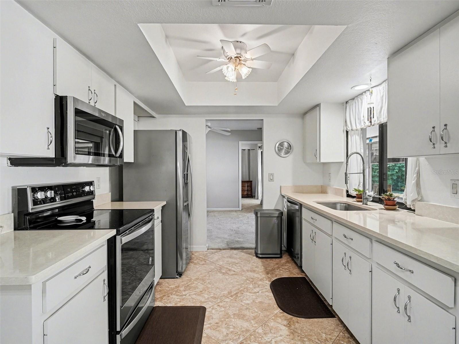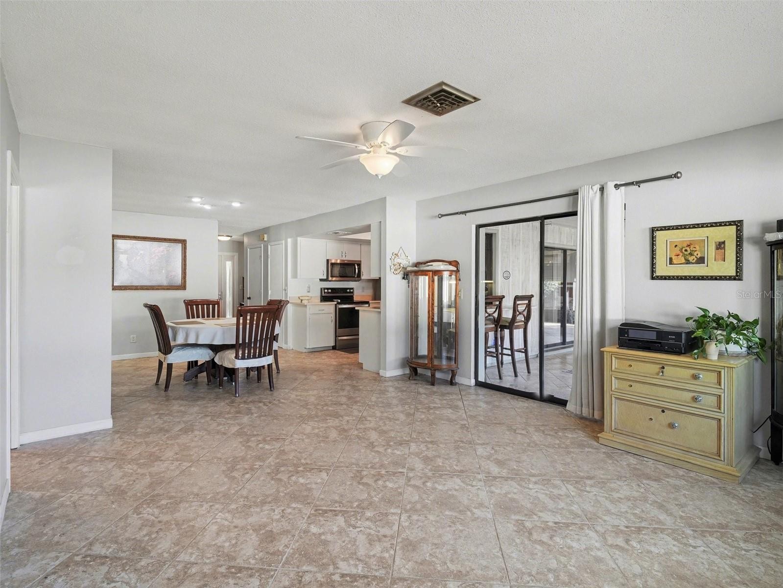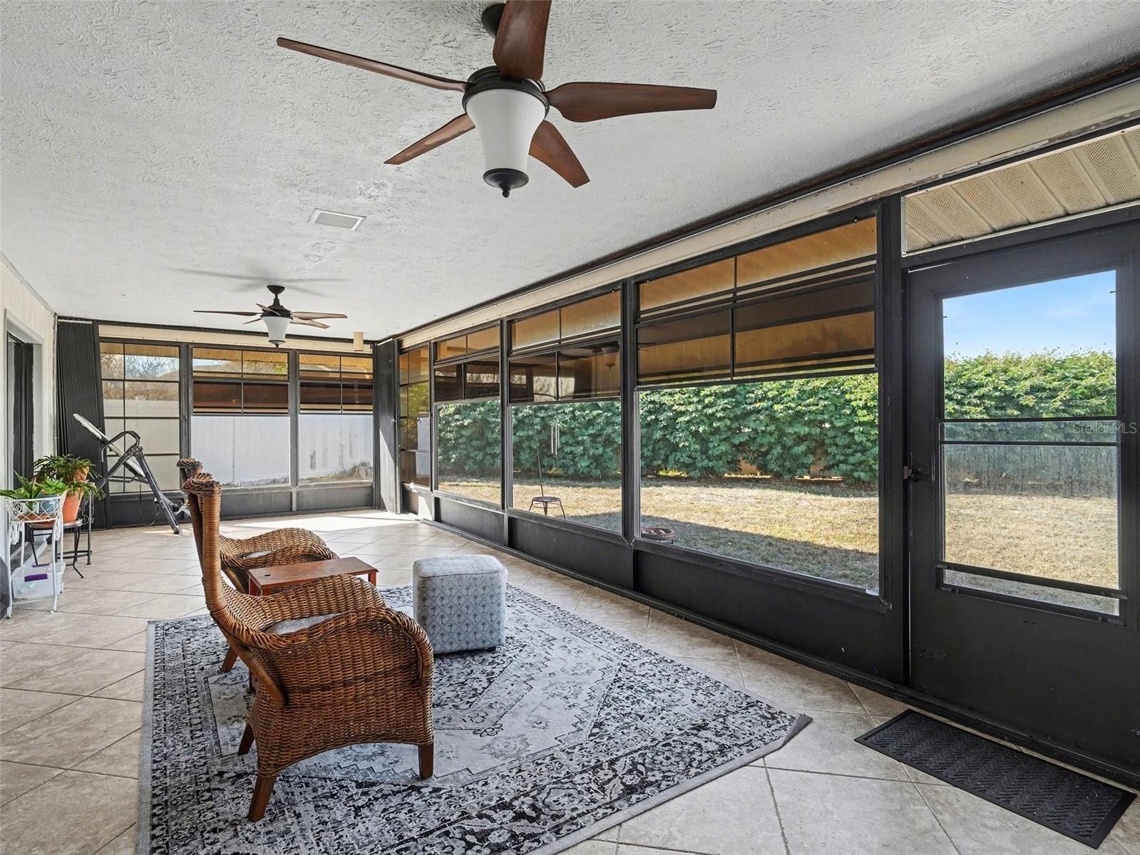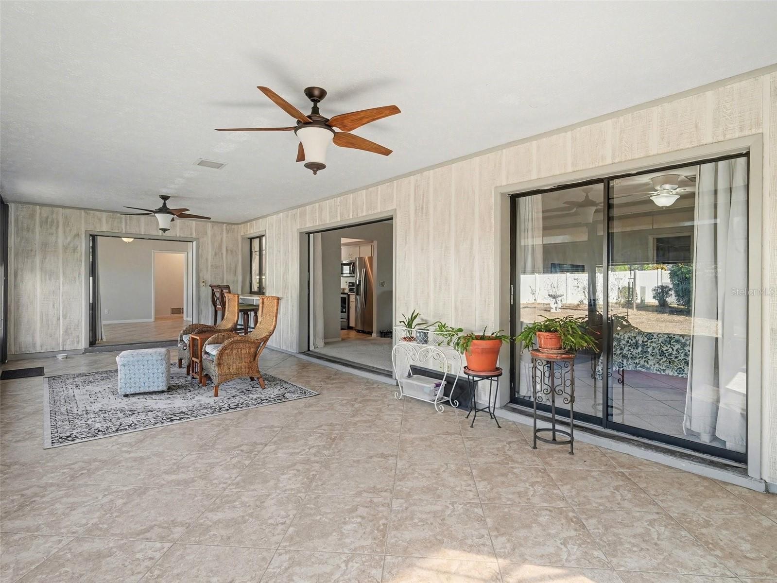 Charming VERY LARGE 2 bedroom home in Pinebrook South. Fenced back yard. Extra large lanai with Vinyl sliders. Hurricane Protection for windows, doors. Kitchen is centrally located. Home is off the beaten path, on quiet cul-de-sac. Newer Barrel Metal Roof 2020, water heater 2024, furnace 2020, Porcelain Tile throughout, Quartz counter top. Built in desk in the dining. Carpet in living and bedrooms. Needs your decorating ideas Connection 220 for outside hot tub. This is a must See!