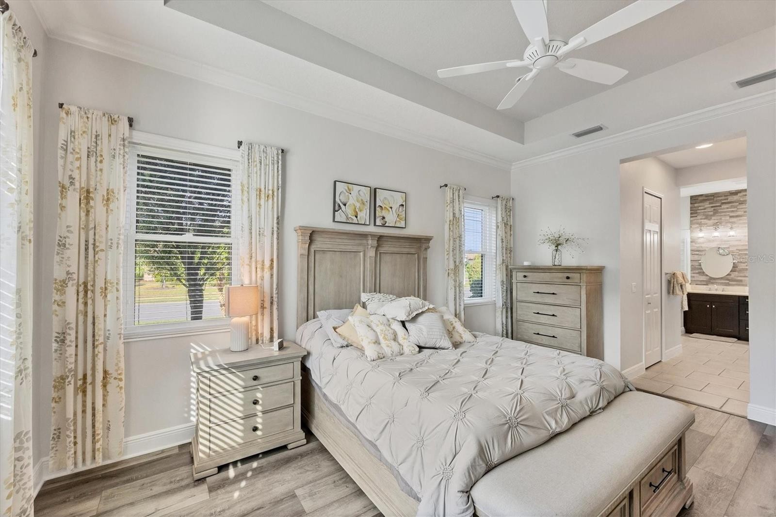 Looking for that one special home that has it all WITH a reduced CDD fee? This model like ''Daybreak'' floorplan saltwater POOL home with its 4 bedrooms, 3 full bathrooms, 3-car garage on a large corner lot is a RARE one! Your new home is built strong and safe with its HURRICANE IMPACT rated windows, motorized HURRICANE shade in lanai, cinder block construction, concrete tile roof and is located in the desirable ''X'' floodzone! Rest assured you won't be left using flashlights with this 24Kw standby ''Generac'' generator! If the power goes out, you can run the entire home, it's business as usual for you! With fresh exterior paint AND professionally installed landscaping, this home looks as good outside as it does inside. Throughout the interior you can expect freshly painted walls, 8' foot doors, 5 1/4 deco baseboards, ceiling fans throughout, luxury crown molding, designer light fixtures, multiple trey ceilings, custom built-ins, tasteful shiplap accent walls and much more! Your new kitchen has brand new stainless steel appliances, reverse osmosis water filtration at the sink, a one off oversized island, custom herringbone laid porcelain backsplash, premium shakor cabinetry with slide out shelving and LED lighting underneath that complements the high level quartz countertops, 5 burner countertop gas stove with stainless exhaust hood, built-in convection oven and microwave! This amazing family room has a designer trey ceiling and custom built in entertainment center with an electric fireplace which makes this centerpoint of the home the perfect interior gathering area. The primary bedroom has a tray ceiling, two walk-in closets and the en-suite bath has a large walk-in shower, custom stone accent wall, dual sinks with high level quartz counter and linen closet. On the other wing of the home there are two bedrooms that share a full bath. There is a separate laundry room with a utility sink, built-in folding table and upper cabinets. The 4th bedroom is on its own with a full bathroom that also functions as a CABANA POOL BATHROOM leading outside to the lanai. Step outside to the paver rich lanai and you will adore the custom ceiling, professionally installed lighting on the pool cage, premium kitchenette with stainless steel gas grill with matching fridge and saltwater pool! You can also expect incredible landscaping which gives ideal privacy and a great view of the water. Indigo is an active community that features a full time on-site manager as well as a full time activities director that manages an extensive calendar of activities for all ages. A-Rated Gullett Elementary AND Mona Jain Middle School are right outside our gates too! You can also expect sidewalks on both sides of the street, resort style heated community pool/spa at the clubhouse where you will find 5 cabanas with an abundance of seating, 4 pickleball courts, 2 bocce ball courts, 24-hour exercise gym, meeting room/banquet room and playground. Indigo is not only a community that takes care of all ground maintenance to include mowing, fertilizing, irrigation and shrubs but is right around the corner to a plethora of dining, banking, entertainment, public transportation and MORE!