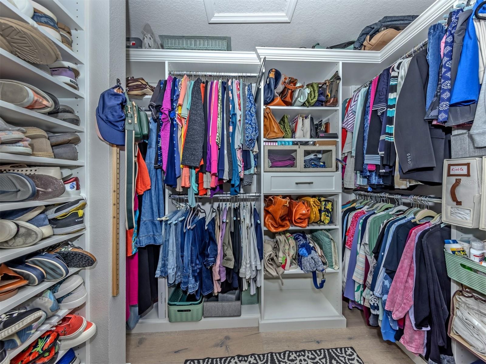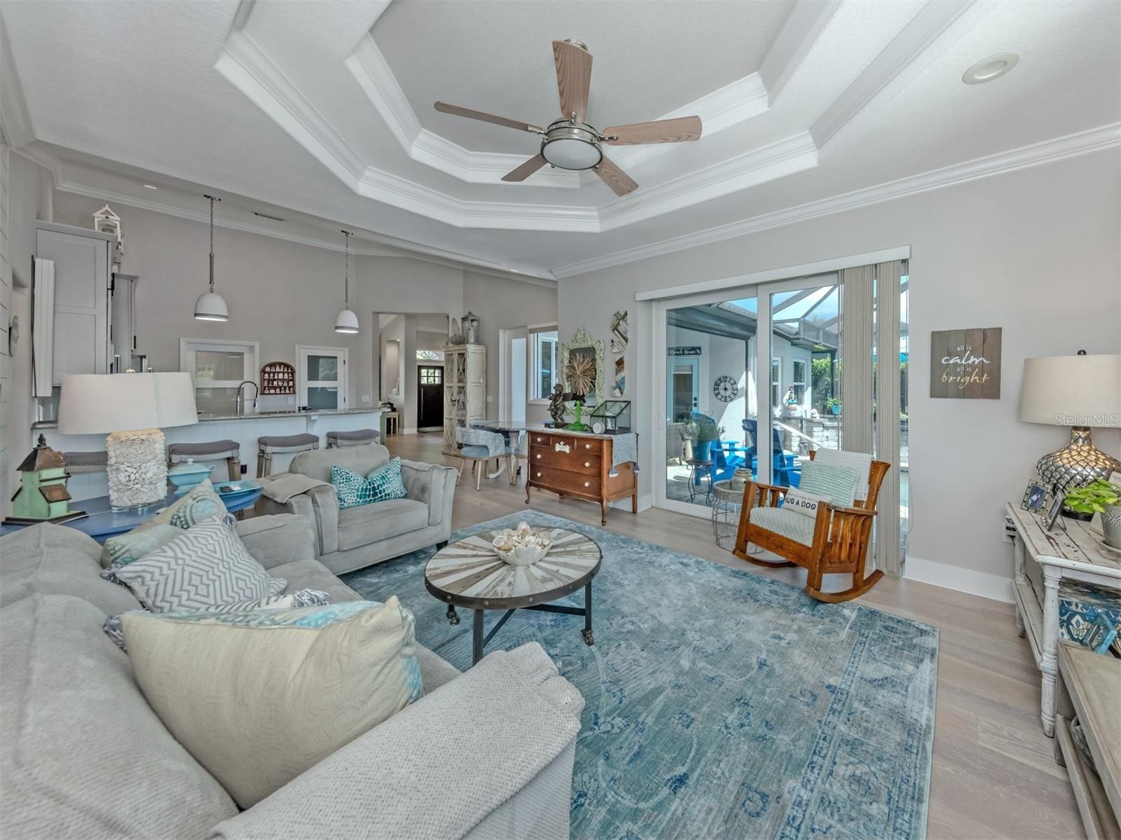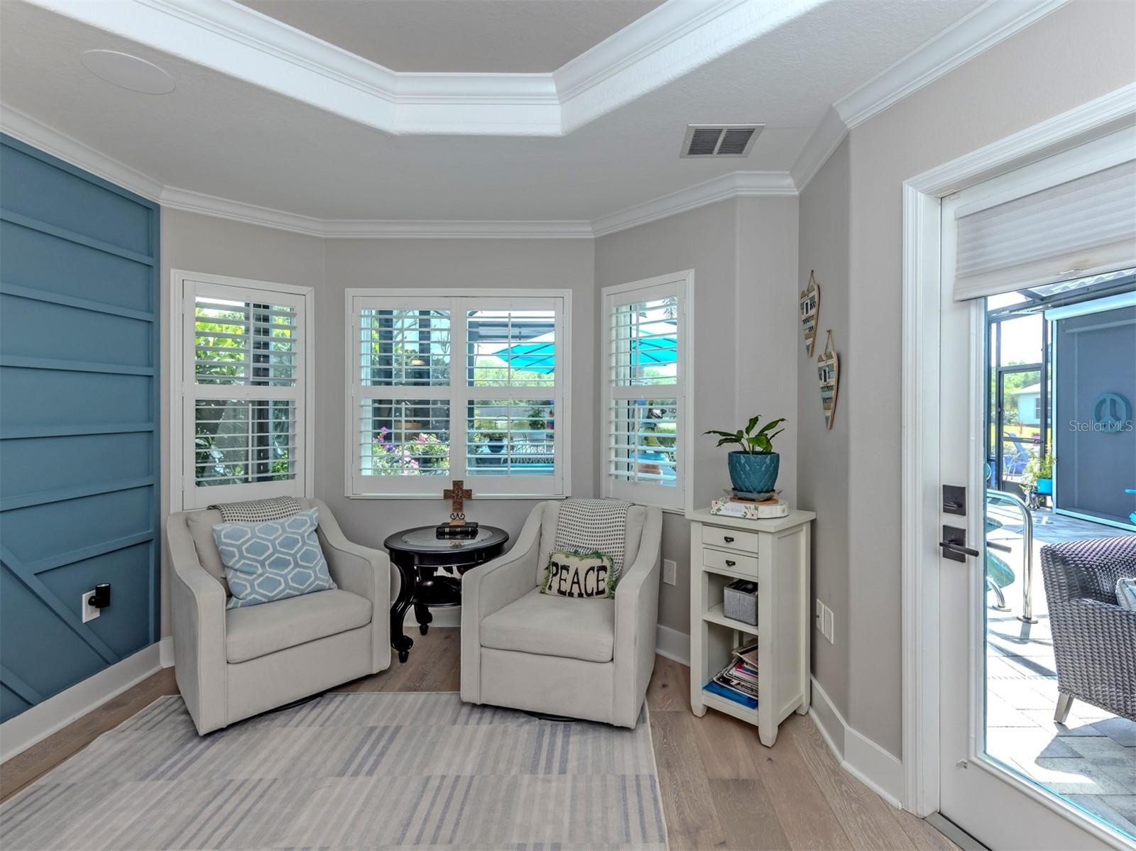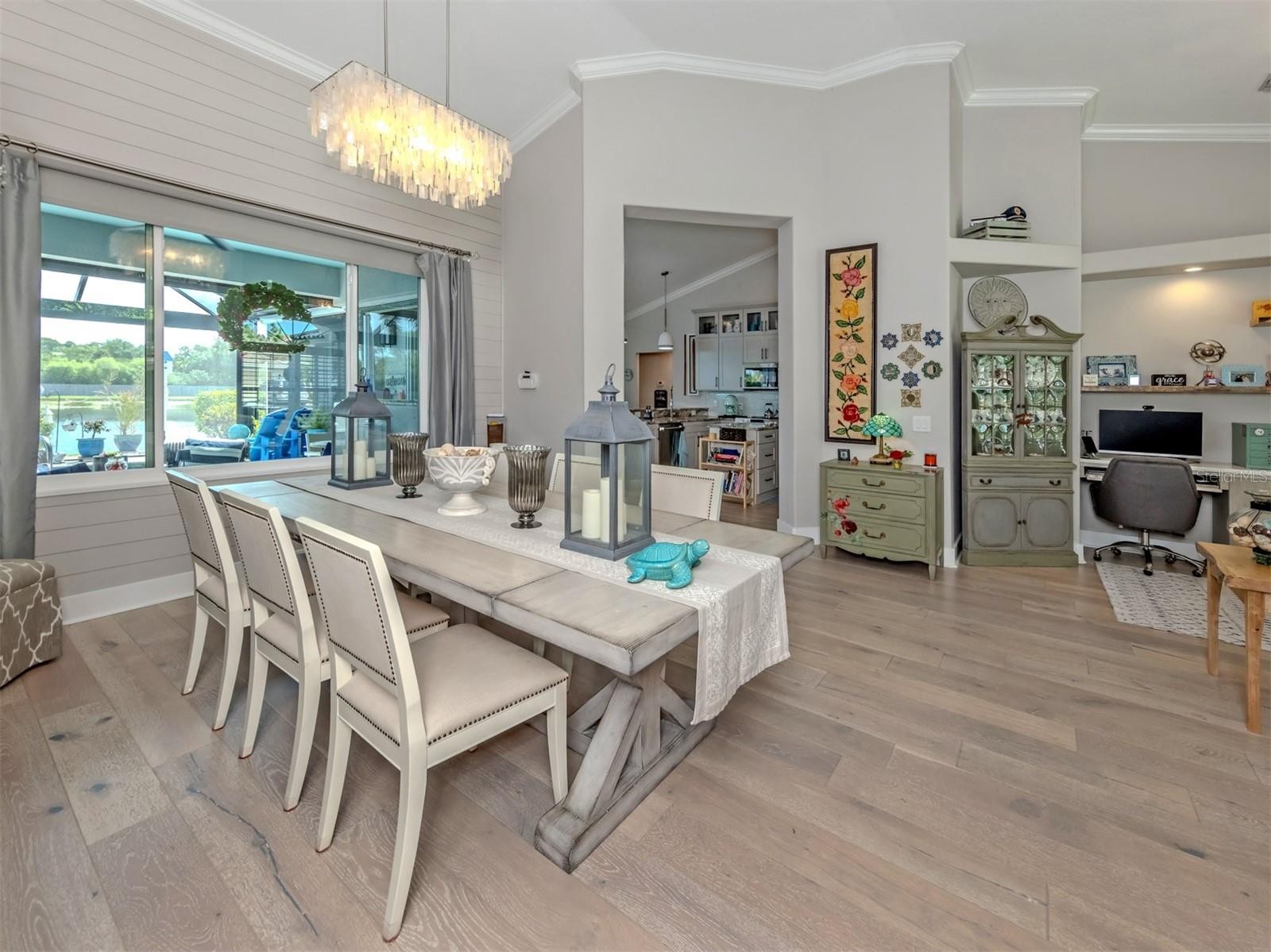 In the intimate enclave of Blue Heron Pond, this beautiful custom three-bedroom, two-bath pool residence with a two-car garage offers refined Florida living just minutes from the beautiful beaches of Venice. No stone has been left unturned in this meticulously upgraded home. Inside, you'll find rich hardwood floors flowing throughout complemented by solid wood interior doors, crown molding throughout and detailed millwork enhancing the main suite, dining room and family room. Custom cabinetry is featured throughout the home along with a built-in dual workspace ideal for modern living. Plantation shutters add privacy and charm to every window. This home is as functional as it is elegant, with custom closets for optimal organization and an epoxy garage floor. Major upgrades provide peace of mind, including new hurricane-impact windows throughout, a whole-house generator and a three-year-old air-conditioning system. Go outside to enjoy a thoughtfully designed lanai featuring a clear view screen enclosure and a Kevlar hurricane screen, creating a seamless indoor outdoor experience. The space is enhanced by landscape lighting and a Pentair pool heater, ideal for year round enjoyment. A unique dog park area on the lanai adds a rare and practical touch for dog owners. Additional premium features include a Sonos whole-home speaker system, a stylish new metal roof, low-maintenance living with low HOA fees, no CDD fees and no flood insurance required. This small private community offers tranquility while remaining close to beaches, fine dining, medical facilities, Sarasota Memorial Hospital, A-rated schools and all Venice has to offer, making this home a rare blend of luxury, comfort and convenience.