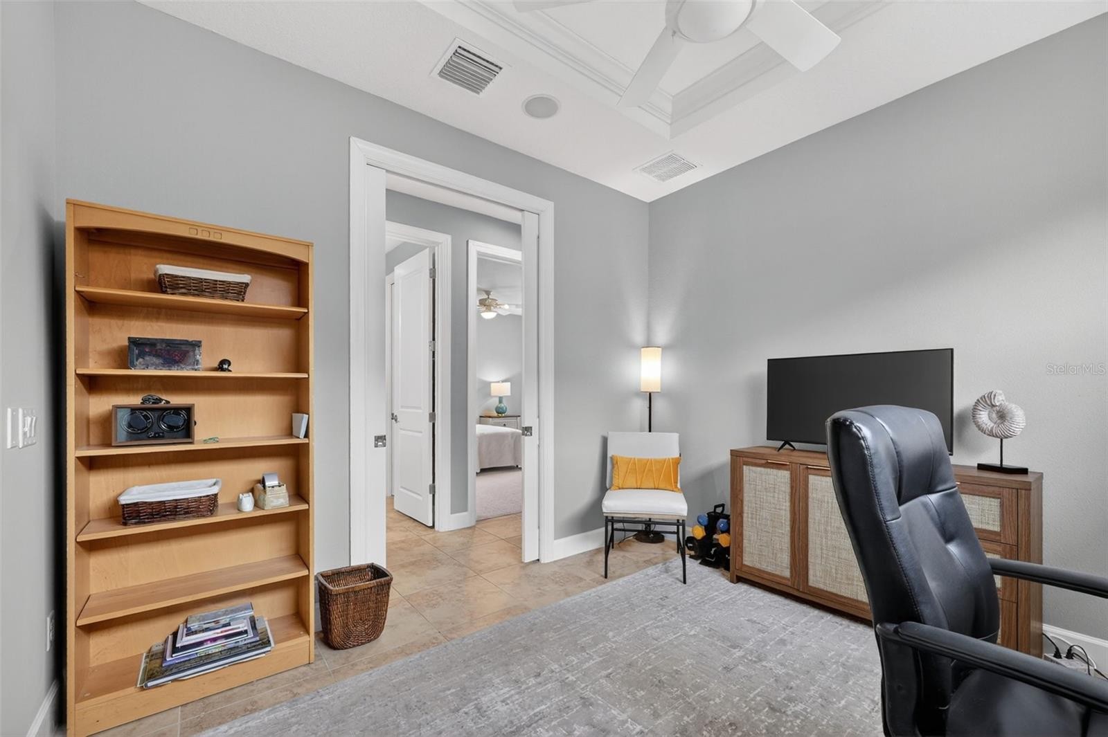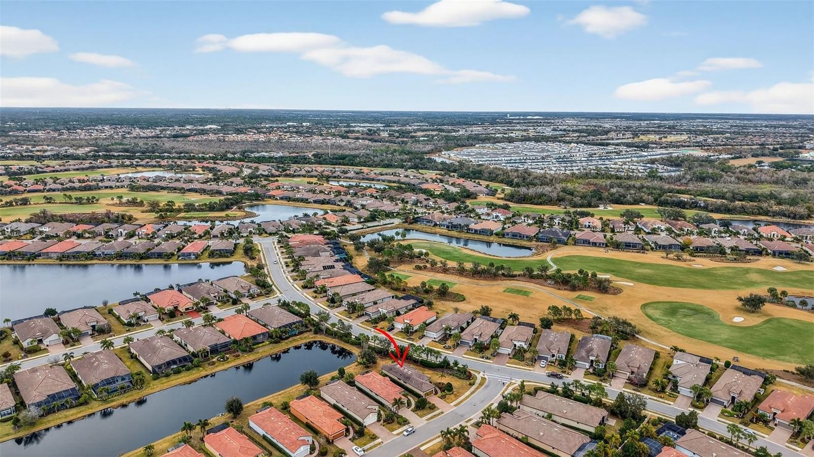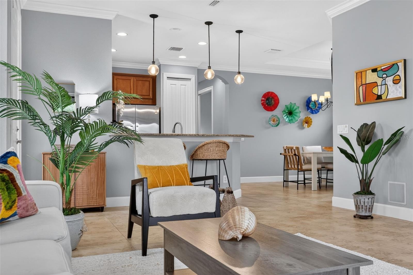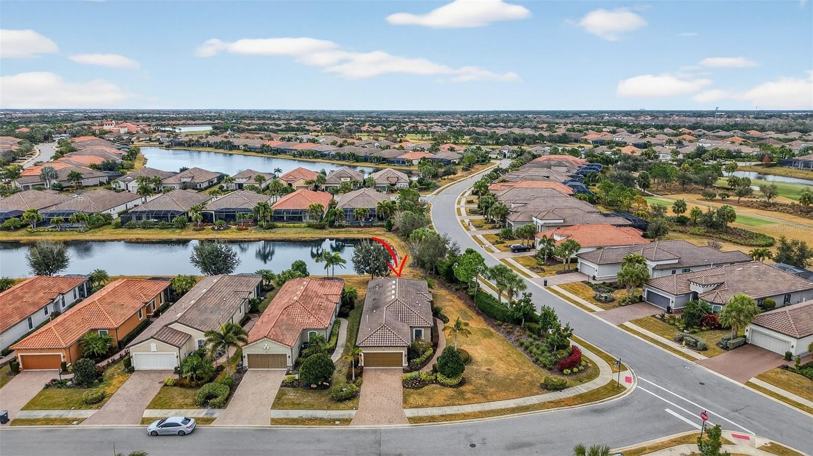 MAINTENANCE-FREE ELEGANCE WITH POND VIEWS! Welcome to your peaceful retreat in the prestigious gated community of Esplanade Golf and Country Club at Lakewood Ranch. This 2-bedroom, 2-bath home with a den is a shining example of timeless style and modern convenience, perfectly situated on a premium oversized corner lot offering tranquil lake views. As you step inside, you’re welcomed by soaring 8-foot doors, elegant tray ceilings, crown molding, and arched doorways that add architectural charm throughout. The main living areas feature tile flooring for effortless maintenance, while the bedrooms are carpeted for added comfort. The chef’s kitchen is both functional and stylish, showcasing stainless steel appliances, pull-out drawers, a spacious layout, and beautiful pendant lighting above the bar—ideal for entertaining. Impact-filmed window treatments and ceiling fans throughout provide year-round efficiency and comfort. Recent updates enhance the home's value and include attic insulation replaced in 2024 by Hughes Pest Control, a new garbage disposal installed in 2025, and a freshly painted exterior in 2025. The home is also plumbed for a future summer kitchen, and the lanai has expansion potential. Functional upgrades like gutters and recessed lighting complete the package. The spacious primary suite offers dual sinks, a walk-in closet, and a luxurious ensuite bath. The second bedroom also includes a walk-in closet, making it perfect for guests or extended stays. Residents of Esplanade enjoy access to world-class amenities including pools, fitness center, tennis, pickleball, clubhouse, and more—all within one of Lakewood Ranch’s most desirable lifestyle communities and is located in the heart of Lakewood Ranch, close to I-75, Lakewood Ranch Main St., University Town Center, Sarasota Polo Club, shopping, dining, entertainment, hospitals, cultural attractions, boating, parks and Florida's famous sandy beaches. This is a Club Home where you can pay to play golf. Glass décor in dining room and grill DO NOT CONVEY.