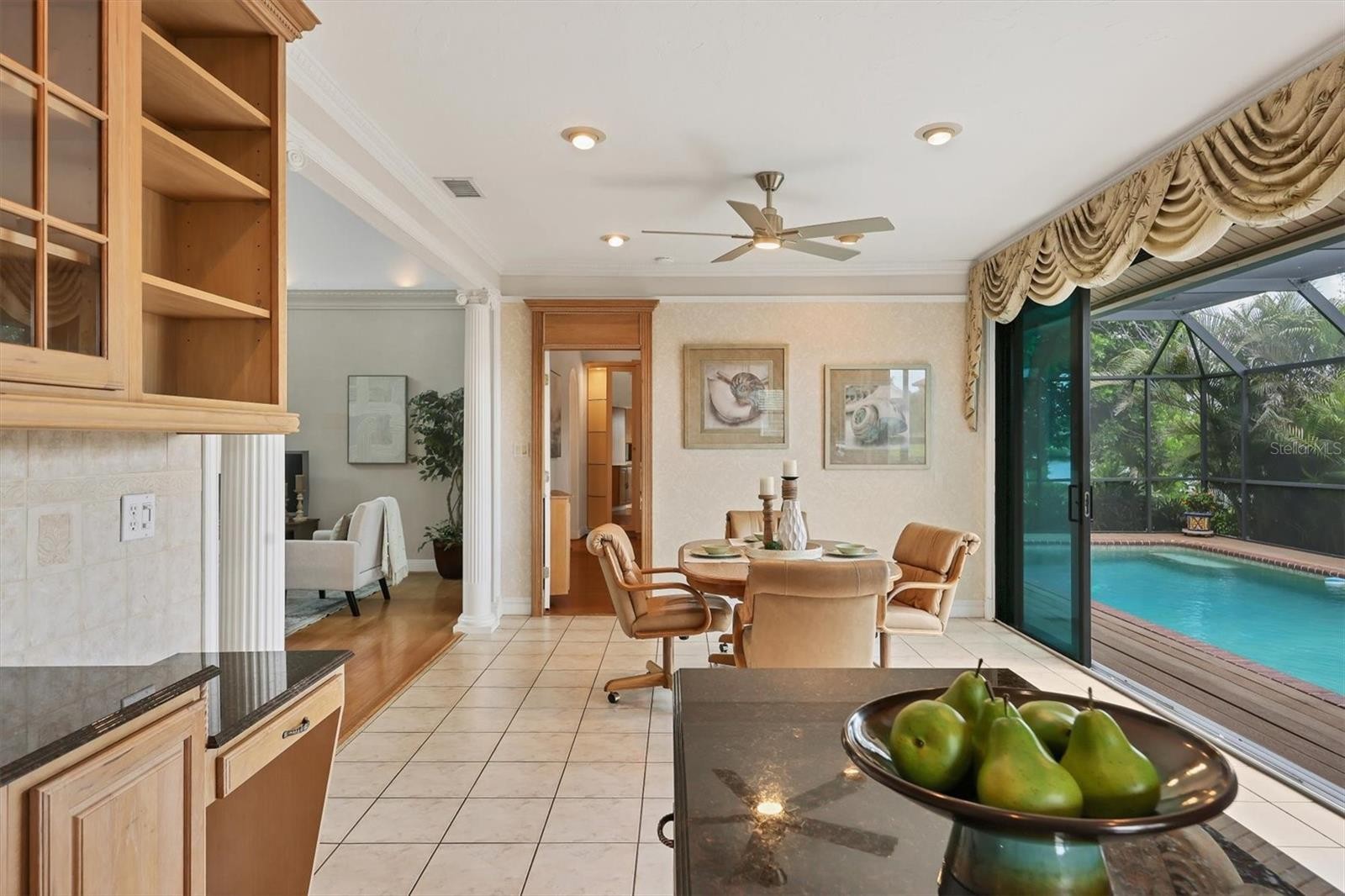 Incredible opportunity to own this spacious WATERFRONT POOL home in the gated community of The Inlets in Nokomis—just one mile from Nokomis Beach! This 3-bedroom, 3-bath home offers an open floor plan with volume ceilings, clerestory windows, and abundant natural light. From the moment you enter, you’re greeted with direct views of the sparkling pool and saltwater canal through a wall of sliding glass doors. The main living area is versatile and can be configured to suit your lifestyle, while the loft-style third bedroom with private bath provides additional flexibility. The kitchen is a chef’s dream with wood cabinetry, a large island, a huge walk-through pantry with second refrigerator, and a corner sink that overlooks the water. The primary suite features both a walk-in closet and a built-in wall closet, along with a spacious bath offering dual sinks, vanity, jetted tub, and separate shower. The second bedroom includes a full wall of built-ins for excellent storage. Step outside to the pool and lanai with composite decking, perfect for al fresco dining or relaxing with sunrise views over the canal. From here, stairs lead down to your private dock—bring your boat and start living the waterfront lifestyle! The Inlets offers resort-style amenities including tennis and pickleball courts, heated pool and spa, fitness center, bocce, and more. Ideally located near shopping, dining, the new Sarasota Memorial Hospital, and just minutes to downtown Venice. Don’t miss your chance to own this waterfront oasis in one of Nokomis’ best-kept secrets—schedule your showing today!