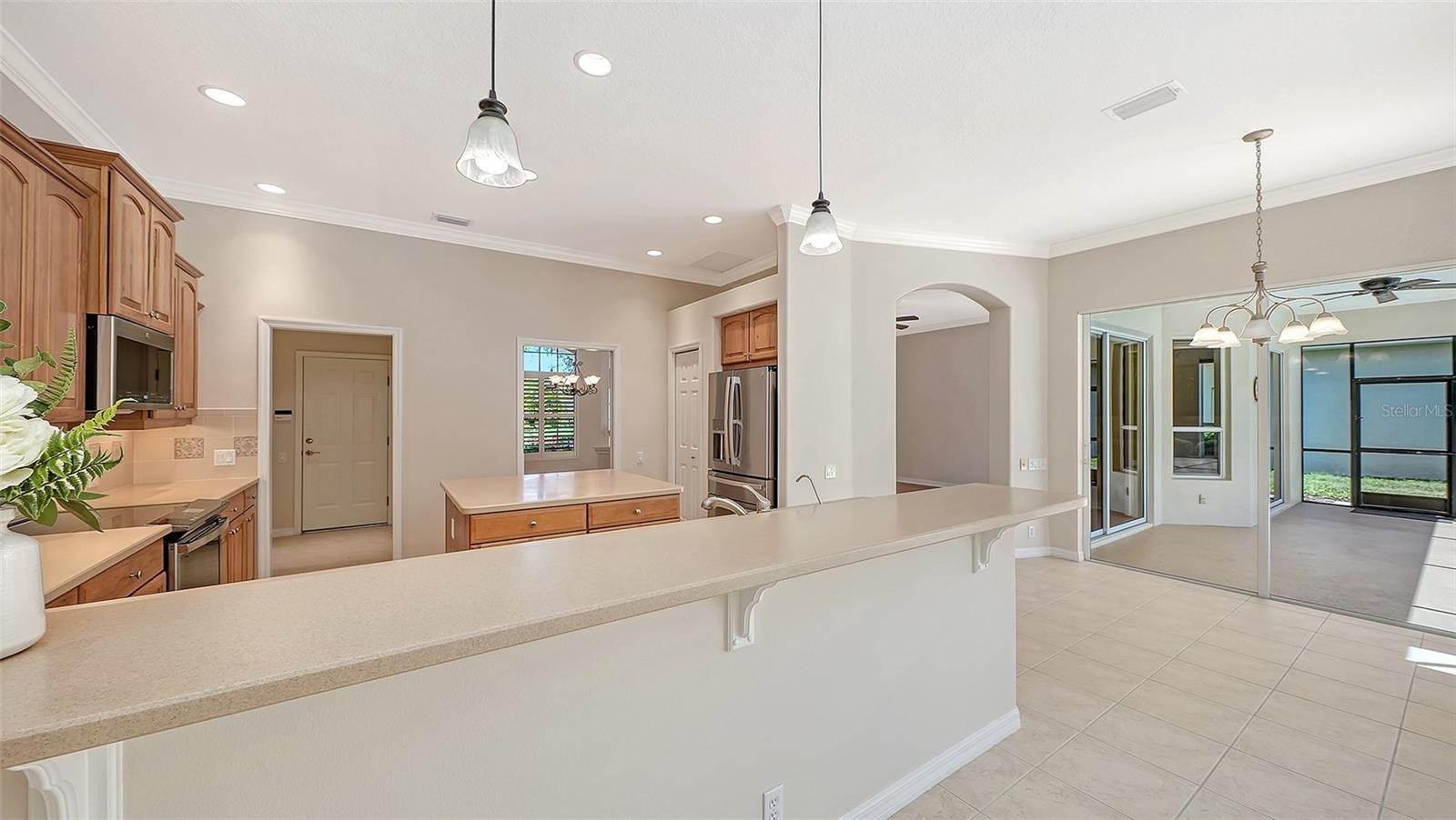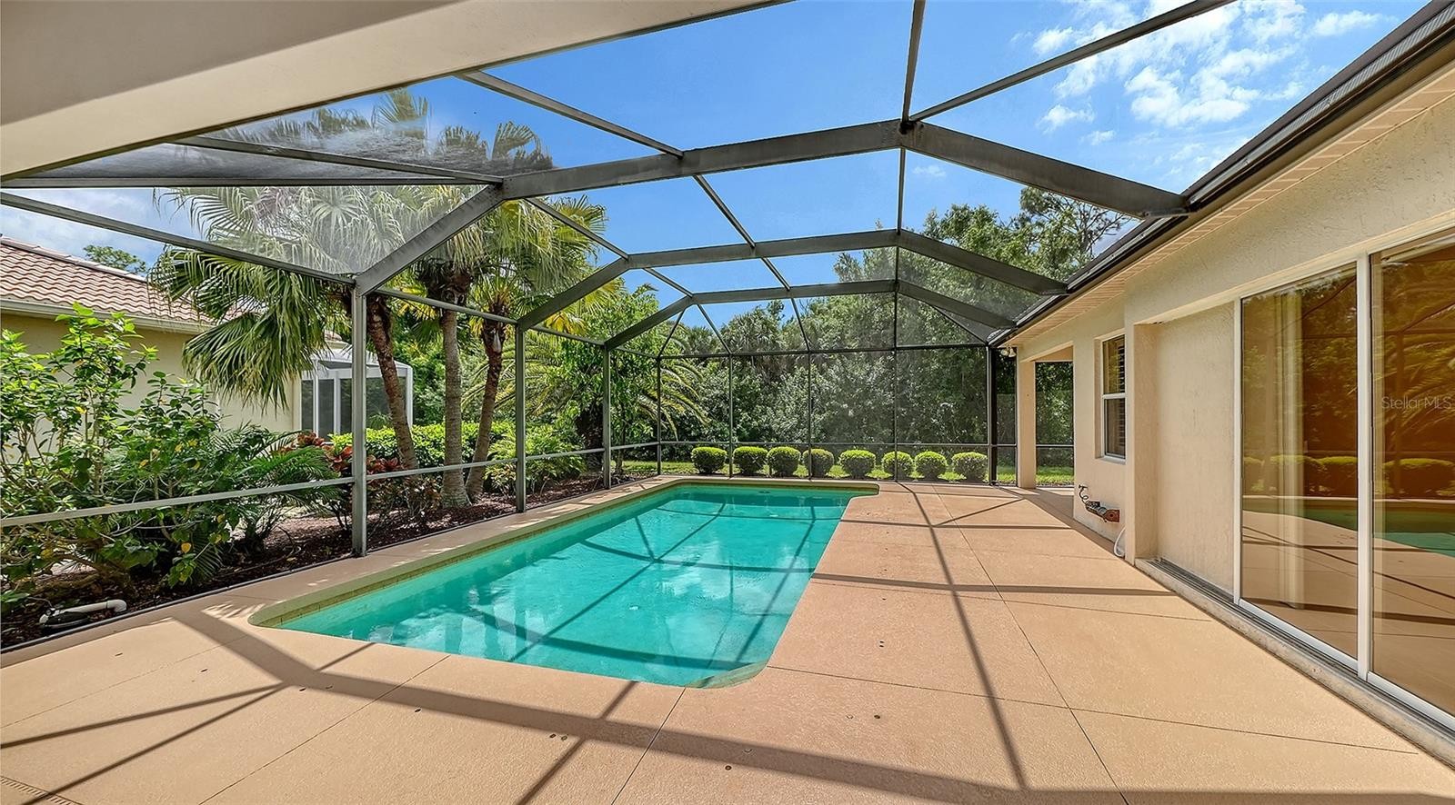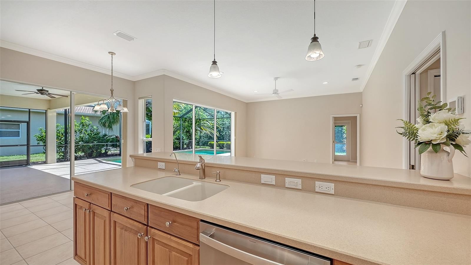 Set on a quiet cul-de-sac within the award-winning community of Pelican Pointe Golf & Country Club, this customized Arthur Rutenberg home offers 3,227 square feet of living space. Designed for both comfort and entertaining, this residence features 3 bedrooms, 3 bathrooms, a dedicated office, and a versatile bonus room that can also serve as a fourth bedroom or guest retreat. Recent updates include a NEW ROOF (April 2026), DUAL ZONE A/C SYSTEM (2025), POOL HEATER (2024) and PUMP (2025), and NEW KITCHEN APPLIANCES (April 2026). Additional features include a whole-house water softener system, crown molding, easy-to-clean floors with tile and just installed high-quality and durable laminate flooring, and a spacious 3-CAR GARAGE. From the moment you arrive, the welcoming covered entryway and lush surroundings set the tone. Inside, the office is positioned at the front of the home, complete with glass-pane French doors and three large windows that fill the space with natural light. The open and inviting floor plan flows seamlessly into the main living areas, where the kitchen serves as the heart of the home—featuring a generous prep island, dining bar, and ample space for gathering with family and friends. The primary suite offers a peaceful retreat, while the guest suite ensures comfort and privacy for visitors. The bonus room stands out with sliding glass doors that lead to a covered lanai area and large windows overlooking the preserve, creating a bright and flexible living space. Step outside to your private outdoor oasis, where a heated pool, sun deck, and two shaded cabanas invite you to relax and enjoy the Florida lifestyle year-round. Residents of Pelican Pointe enjoy access to an array of amenities, including a clubhouse with restaurant and bar, Junior Olympic size heated pool, tennis and pickleball courts, Pro Shop, work-out room, plus a vibrant calendar of social activities. Optional golf memberships available for the 27-hole championship course. The HOA fee includes lawn care, cable TV, internet, guardhouse security, and social membership privileges. Located just minutes from Gulf beaches, shopping, dining, and Venice’s charming historic downtown, this home offers the perfect blend of luxury, convenience, and Florida living at its finest.