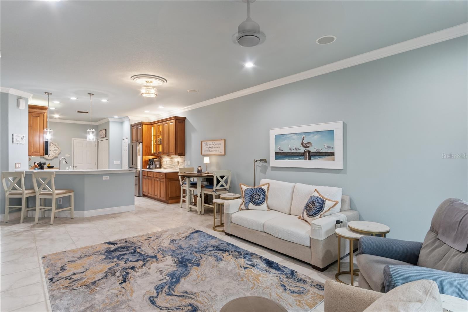 Under contract-accepting backup offers. Experience a refined standard of living within the highly coveted 55+ enclave of Cypress Falls at The Woodlands. Perfectly positioned on a quiet cul-de-sac, this impeccably curated two-bedroom, two-bath + den, villa exudes effortless sophistication, offering a luminous, open-concept design that harmoniously blends comfort with timeless elegance. Surrounded by a serene natural backdrop, the residence welcomes you with an immediate sense of tranquility. Impeccably manicured grounds, sculpted greenery, and graceful swaying palms frame the home in classic Florida beauty, enhancing its striking curb appeal. A screened entryway leads to an inviting interior, where a breathtaking etched leaded-glass door reveals soaring ceilings and 18x18 ceramic tile that flows seamlessly throughout the main living spaces. A soft, neutral palette envelops the home in a calming ambiance reminiscent of a private retreat. The kitchen blends style and practicality, catering to those passionate about cooking. With expansive quartz countertops, elegant 42-inch wood cabinets (one set with glass doors) topped with crown molding, and modern stainless-steel appliances, it offers a polished aesthetic. Recessed lighting and upper/under cabinet lighting cast a warm glow, while a stylish backsplash and spacious pantry enhance both beauty and practicality. The breakfast bar effortlessly connects the kitchen to the dining and living areas, creating an elegant setting ideal for both intimate gatherings and lively entertaining. Thoughtfully designed for privacy, the bedrooms are situated on opposite sides of the home. The primary suite serves as a serene sanctuary, featuring crown molding, plantation shutters, a spacious walk-in closet with custom built-ins, and picturesque views of a private preserve—an idyllic scene to begin each day. The en-suite bath rivals a spa experience, complete with a single vanity and an extended granite countertop, making it the perfect space for a chair and makeup area. All of the fixtures have been upgraded, custom wood cabinetry, and a half glass-enclosed walk-in shower complemented with elegant tilework. The guest bedroom is comfortably sized with a ceiling fan, large closet, built-in, pull-down Murphy bed, and a built-in wall unit with shelves on the adjacent wall. The nearby guest bathroom includes quartz countertops, wood cabinets, and a shower/tub combination w/ tiled walls. Additional enhancements—including crown molding throughout, plantation shutters on every window, designer lighting, an integrated sound system, further elevate the home’s appeal. Sliding glass doors open to a private, enclosed lanai, where tranquil views and the absence of rear neighbors create an oasis of peace. Not only does this home have all brand-new high efficiency Andersen windows/slider but it also has Hurricane Armor screens for each window, providing peace of mind. Del Webb spares no expense for the resort-style community amenities! The clubhouse features a resort-style pool, meeting rooms, ballroom, billiards room, library, card room, heated resistance pool, heated walk-in pool, tennis, horseshoes, shuffleboard, horse shoes, pickle ball, bocce ball, fitness room covered grill area with seating, dog park, hot tub, internet café, full-time activities director & even a community garden! This is maintenance free Florida living at its best…WELCOME HOME! **Please see attached list of upgrades** Interior pictures coming soon!