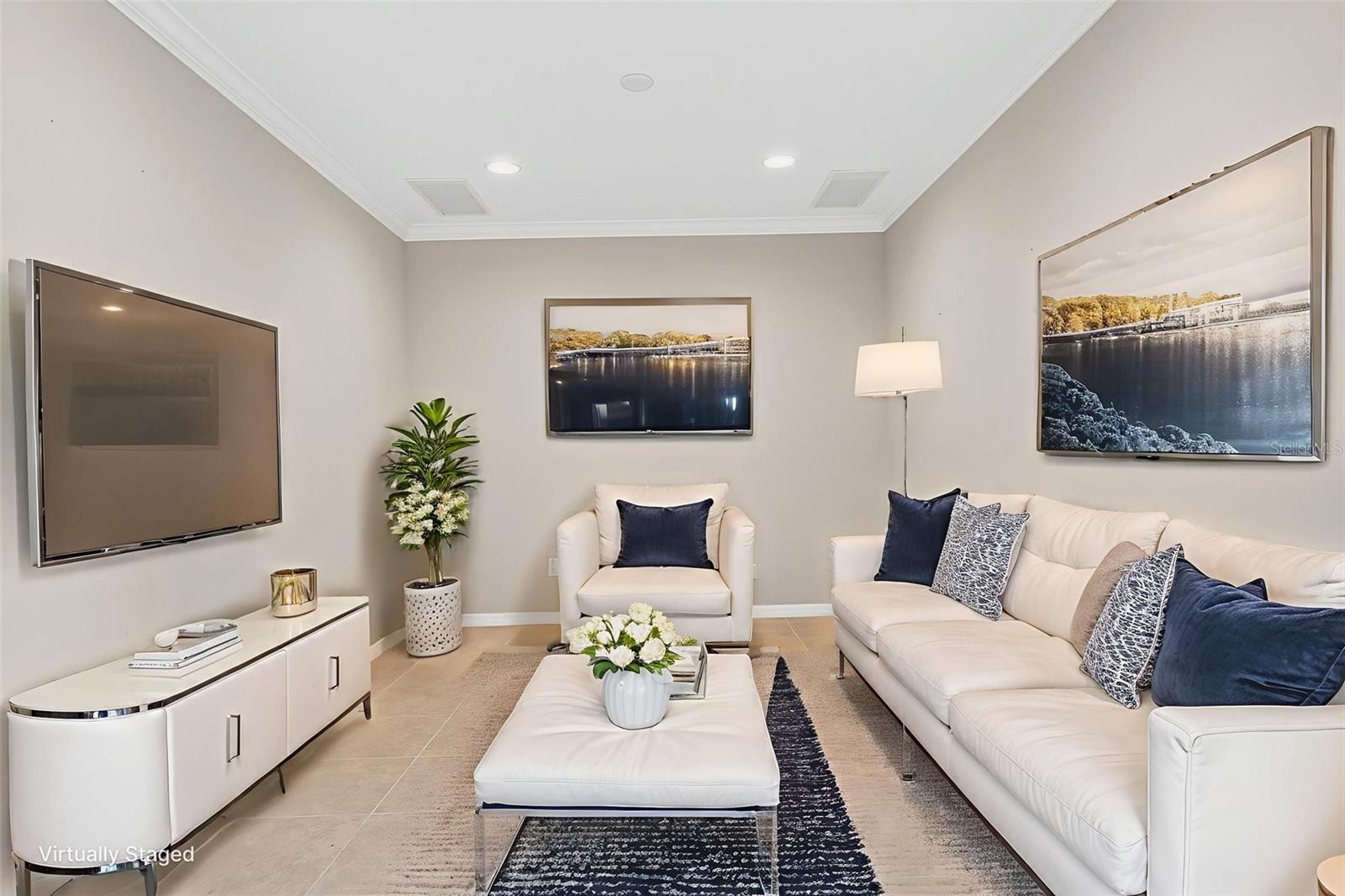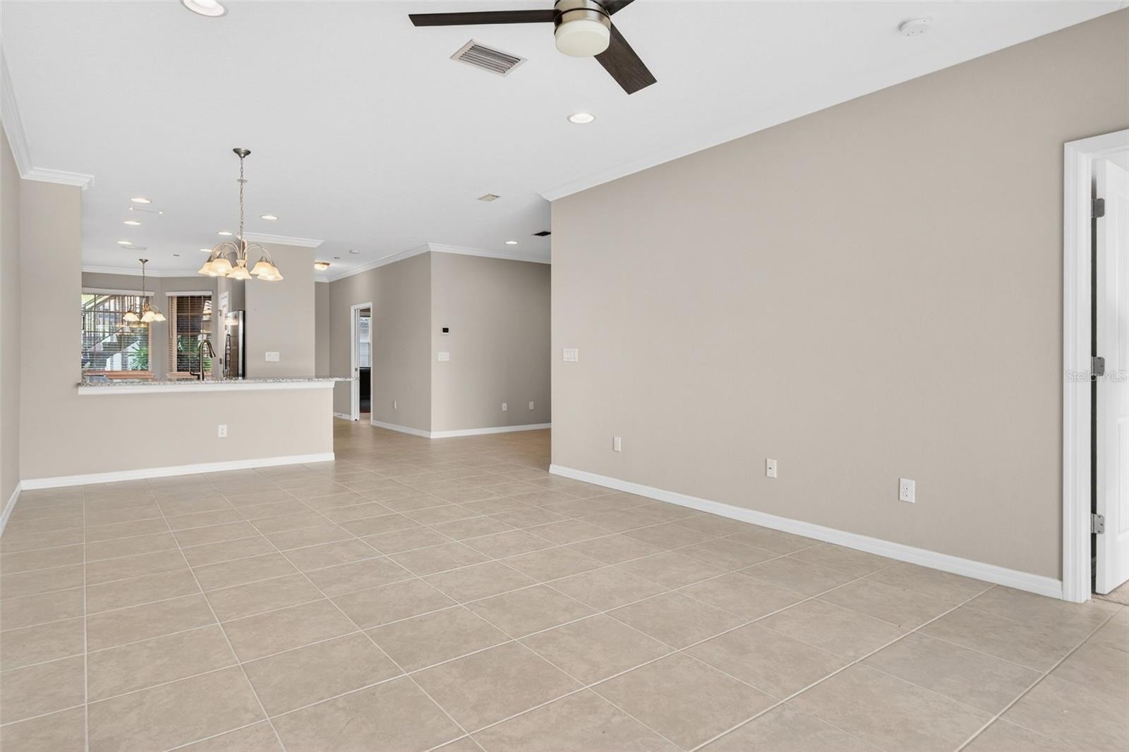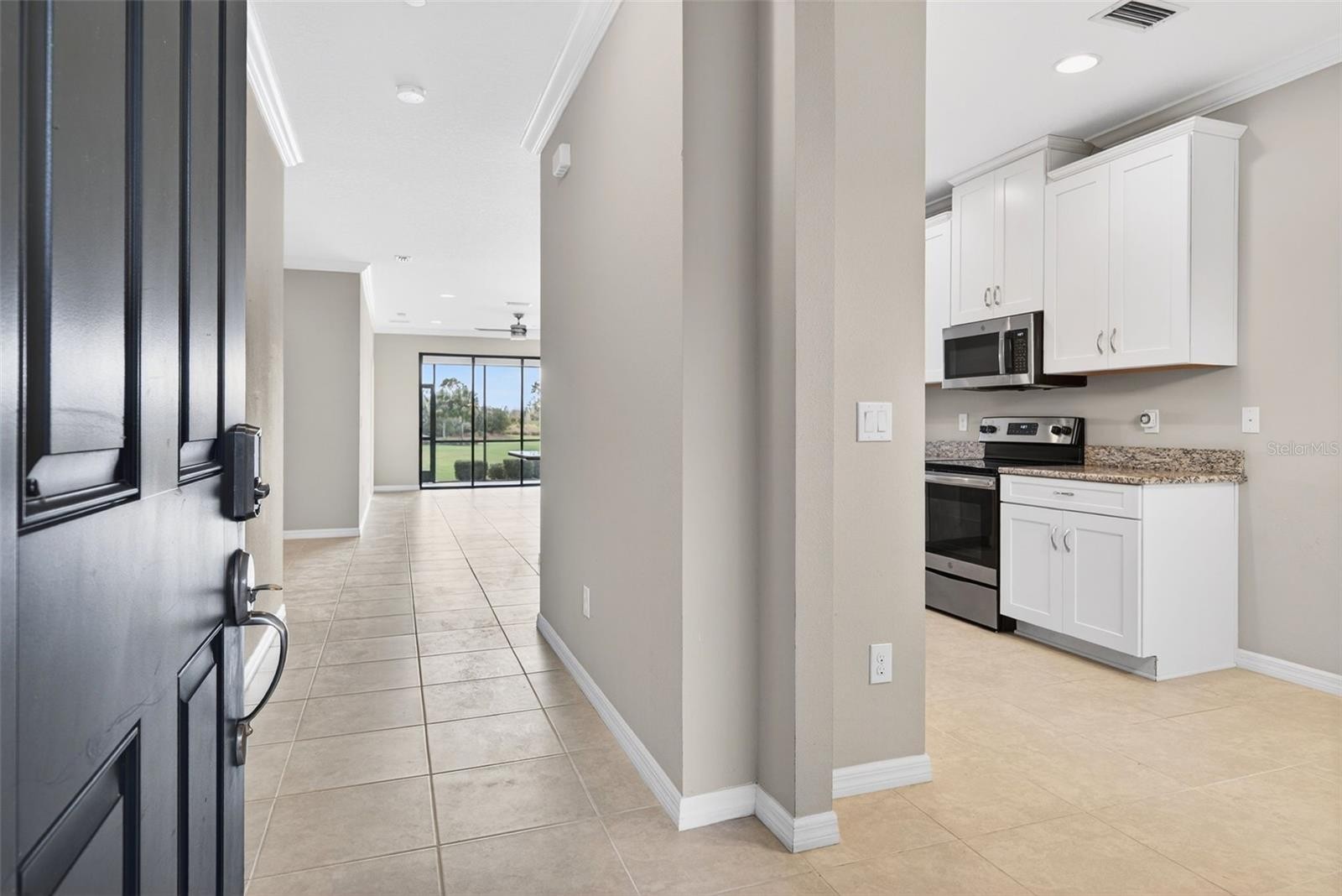 Sophisticated, serene, and completely move-in ready—this vacant first-floor residence offers refined golf-course living without the wait. Welcome to 13738 Messina Loop, Unit #103, an impeccably maintained golf-deeded condominium set within the prestigious Esplanade Golf & Country Club, where luxury meets effortless Florida living. Designed for privacy and tranquility, this residence is ideally positioned away from traffic and showcases peaceful lake and golf course views complemented by sun-filled southern exposure. The 2-bedroom plus den, 2-bath layout is thoughtfully designed for both comfort and flexibility—perfect as a full-time residence, seasonal escape, or refined lock-and-leave lifestyle. Inside, the home impresses with soaring ceilings, abundant natural light, crown molding, and tile flooring throughout the main living areas, creating a bright and airy ambiance. The expansive kitchen anchors the space with white shaker-style cabinetry, granite countertops, stainless steel appliances, a pantry, and generous storage, offering both elegance and functionality. A versatile adjacent area easily accommodates casual dining or a stylish home workspace. The living area flows seamlessly to the screened lanai, where calming water views, open fairways, and native wildlife provide a picturesque backdrop for morning coffee or evening relaxation. The primary suite is a private retreat featuring two walk-in closets and a spacious ensuite bath, while the guest bedroom and full bath are thoughtfully positioned to create a separate guest wing. A conveniently located laundry room with pocket-door enclosure enhances privacy and everyday ease. Additional highlights include a covered front entry, window treatments, ample storage throughout, and a private one-car garage just steps from the front door. The residence is vacant and move-in ready, offering a blank canvas to personalize and make your own—no staging, no furnishings, just clean lines and immediate availability. Life at Esplanade is defined by world-class amenities, including championship golf, resort-style pools, tennis and pickleball courts, a full-service spa and salon, state-of-the-art fitness centers, and multiple on-site dining venues, all supported by a vibrant social calendar. Located in Lakewood Ranch, you’re moments from University Town Center, Waterside Place, scenic trails, polo events, farmers markets, and the renowned beaches of the Gulf Coast, with convenient access to SRQ and TPA airports. Vacant, polished, and perfectly positioned—this is golf-deeded living elevated to its finest form.