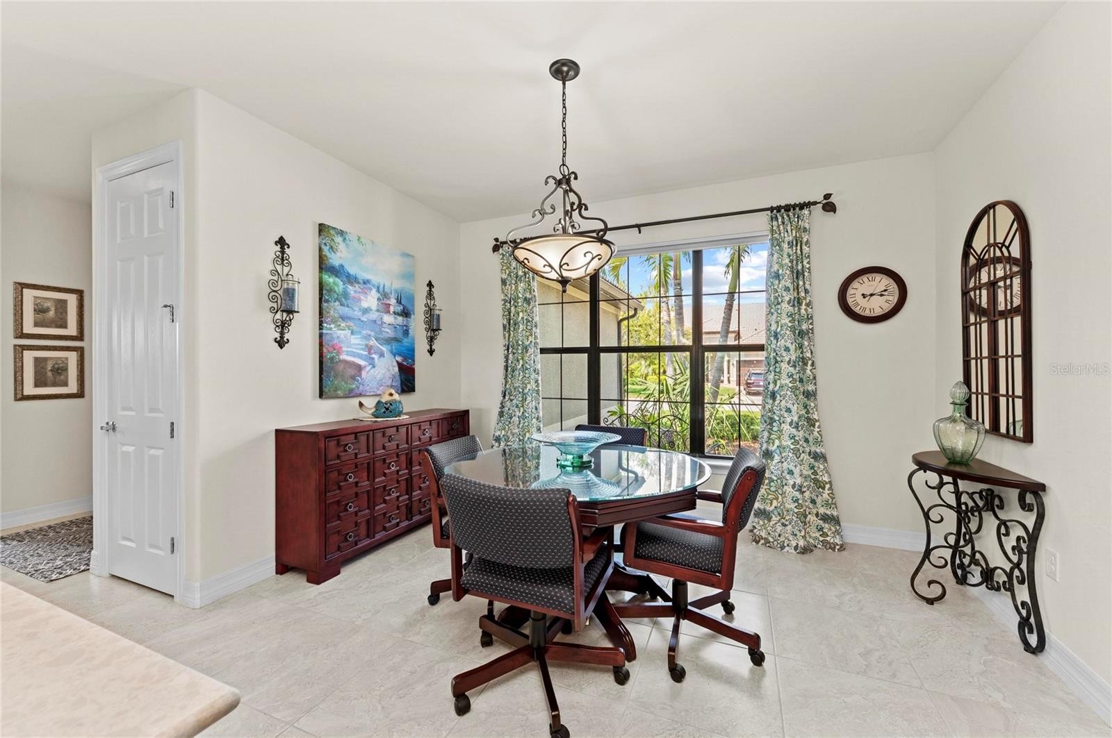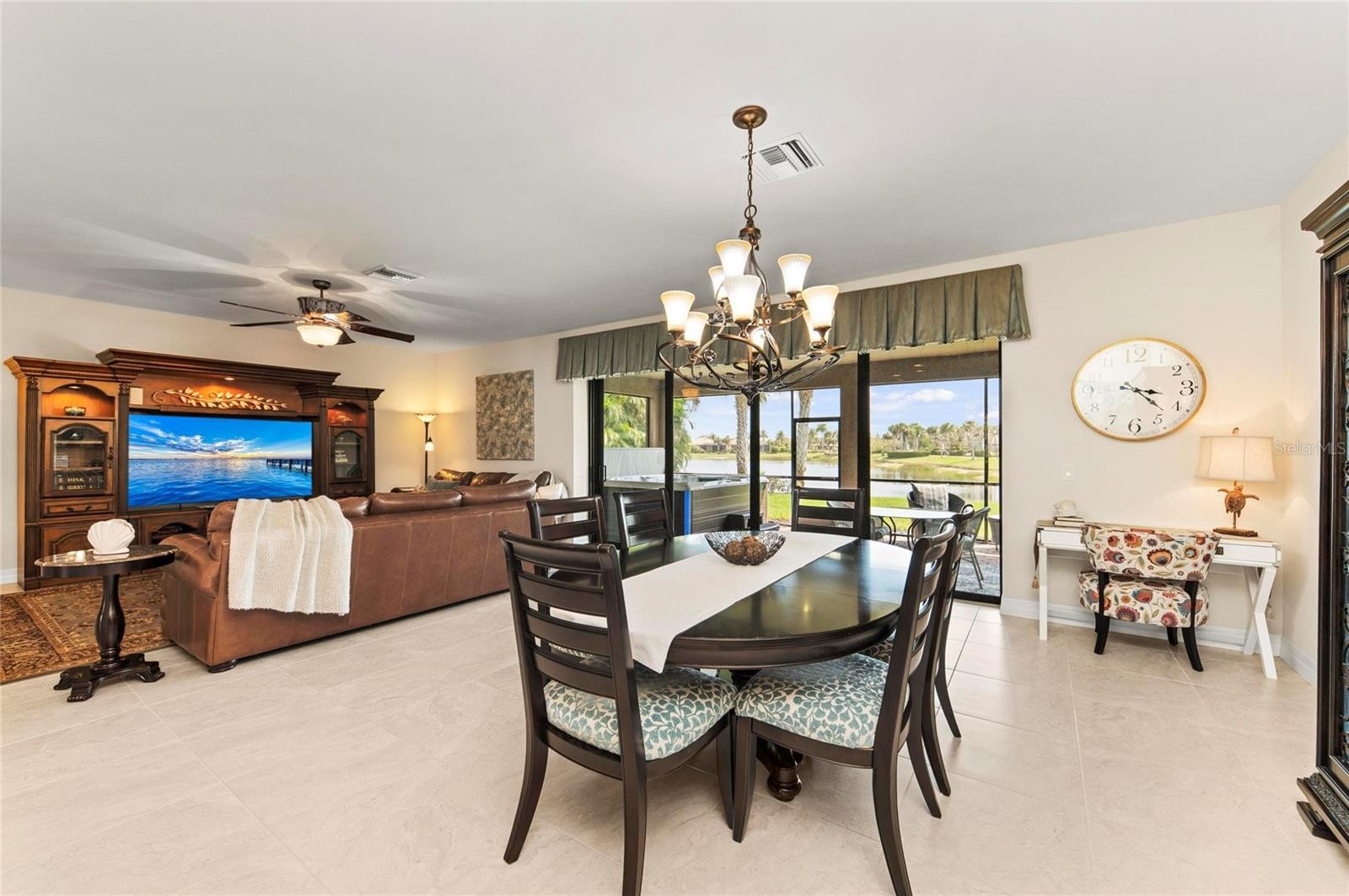 This rare Tangerly Oak model offers an exceptional opportunity to own a thoughtfully upgraded and lightly lived-in home that truly stands apart. With 2,757 square feet of living space - larger than the typical one-story Pinnacle model—this residence delivers both added space and enhanced functionality. Unlike most Pinnacle layouts, this home features four generously sized bedrooms, including a desirable second bedroom with its own private en suite bath and a large walk-in closet, perfect for guests or multi generational living. From the moment you enter, you’ll notice upscale design elements throughout, including 8-foot interior doors, higher baseboards, and tile flooring that flows seamlessly throughout the entire home. The spacious eat-in kitchen is designed for both everyday living and entertaining, offering abundant cabinetry, ample storage, and plenty of room to gather. A true highlight of the home is the one-of-a-kind wall of four sliding glass doors spanning over 15 feet, opening completely to the extended lanai for seamless indoor-outdoor living. The oversized corner lot provides exceptional privacy along with expansive, long water views, all with a sought-after southern exposure that fills the home with natural light—especially during the winter months. Step outside to your own private retreat, featuring a premium Hot Spring Prism seven-person hot tub installed in 2020. Designed for a full-body hydrotherapy experience, it includes 73 jets powered by three pumps, a deeply relaxing lounger seat, a powerful footwell jet, a freshwater salt system, multi color lighting, and a backlit waterfall for added ambiance—all offering luxury without the maintenance of a full pool. Set on an expansive 9,788 square foot executive homesite, the property also benefits from a large berm that enhances privacy and tranquility. Additional features include hurricane impact glass windows and doors throughout, including the quadruple sliders, a four-foot extended garage, and a large laundry room with plenty of space for storage and functionality. Lovingly maintained by its original owners and used only seasonally for approximately two months per year, this home has never been rented and remains in exceptional condition. Ideally located just a short walk from the impressive 14,000 square foot Resort Center, 11,000 square foot Event Center, multiple pools, and an array of world-class amenities, this home offers the perfect blend of luxury, comfort, and convenience.