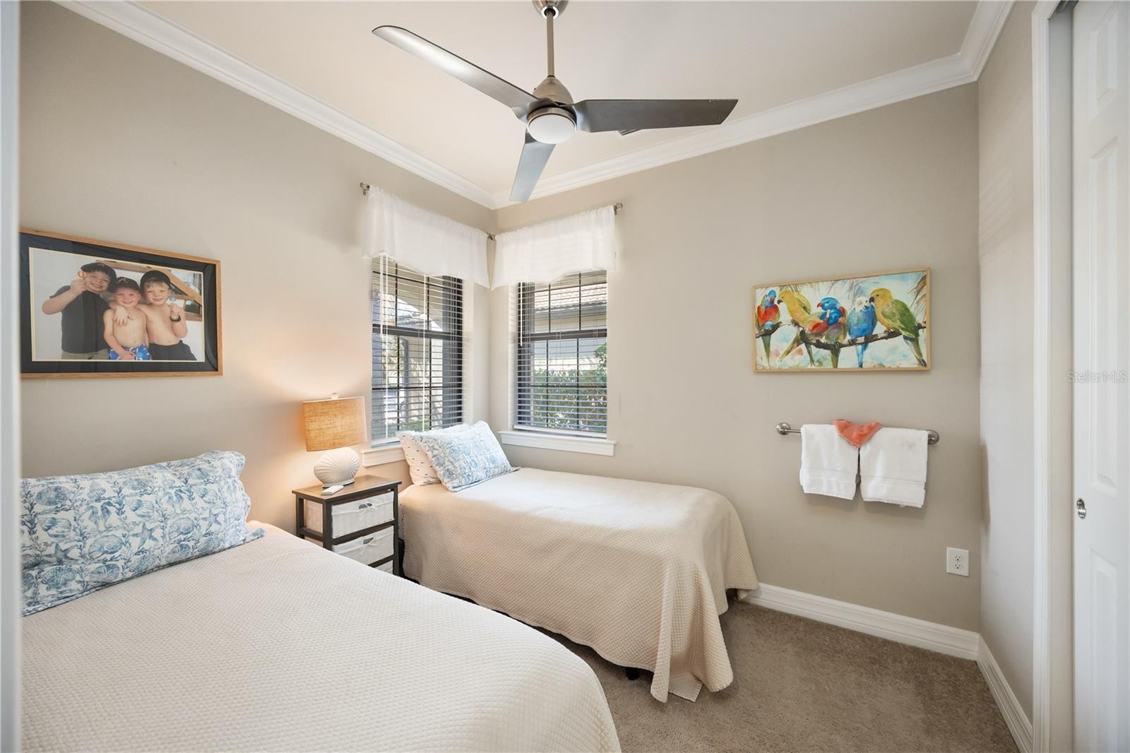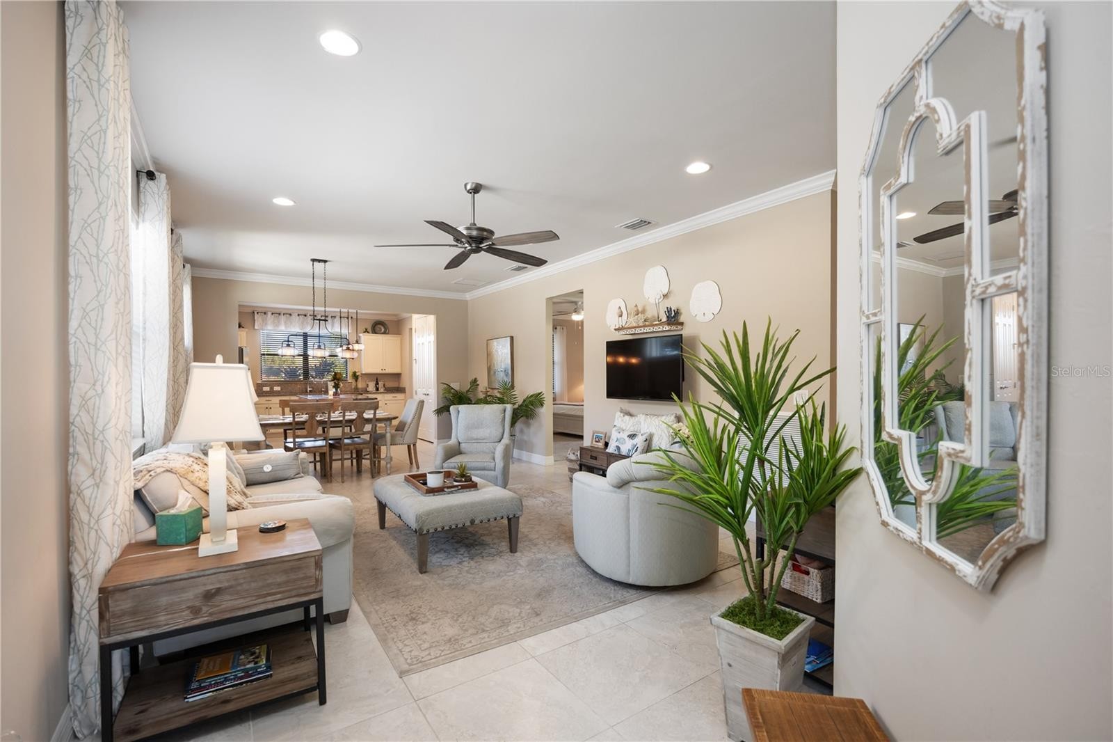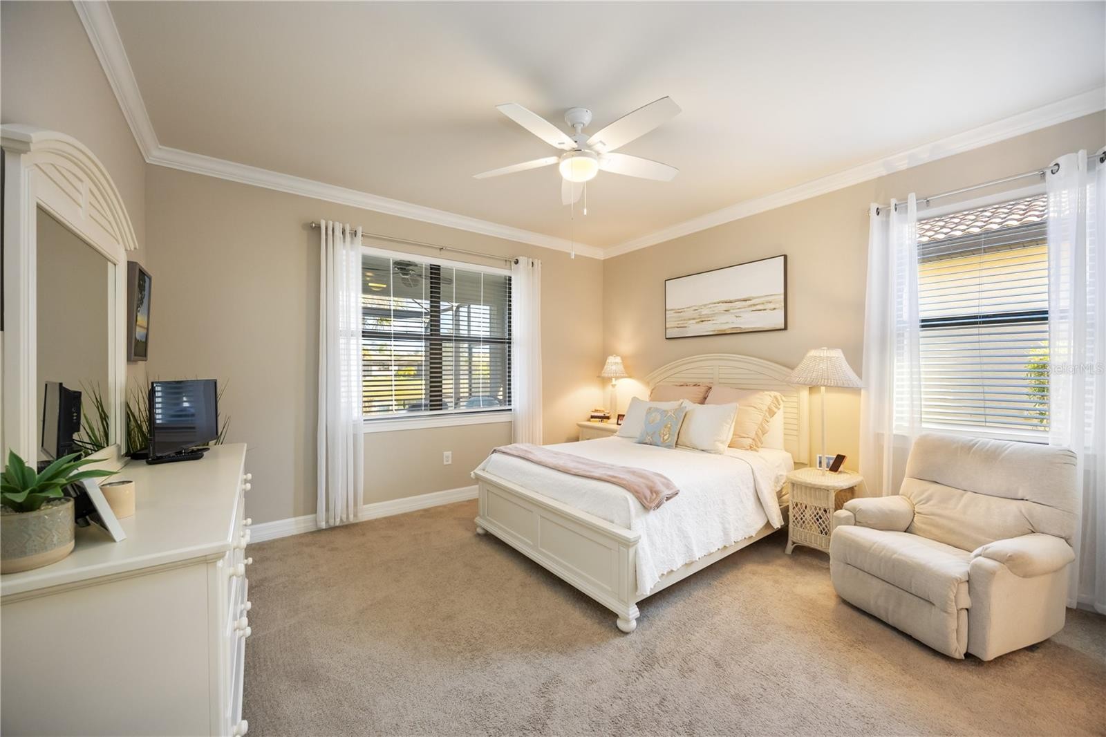 Welcome to effortless Florida living in the sought-after community of IslandWalk. This beautifully maintained 3-bedroom, 2-bath home offers a light-filled, open floor plan designed for both comfort and everyday living. The spacious layout flows seamlessly into a well-appointed kitchen that overlooks the main living areas, creating an inviting space for entertaining or relaxing at home. Pride of ownership shines throughout with elegant crown molding, tall baseboard trim, eight foot doors, and abundant natural light that enhances the home’s airy feel. The split bedroom design provides privacy, while both guest bedrooms feature custom-designed dresser systems within the closets, maximizing storage and functionality. Additional highlights include a 4-foot garage extension, utility sink in the garage, and a whole-house water softener. Accordion hurricane shutters add peace of mind, and the home has been meticulously cared for, making it truly move-in ready. Enjoy the comfort, quality, and thoughtful upgrades this IslandWalk home offers, all within a vibrant, amenity-rich community known for its beautiful surroundings and active lifestyle.