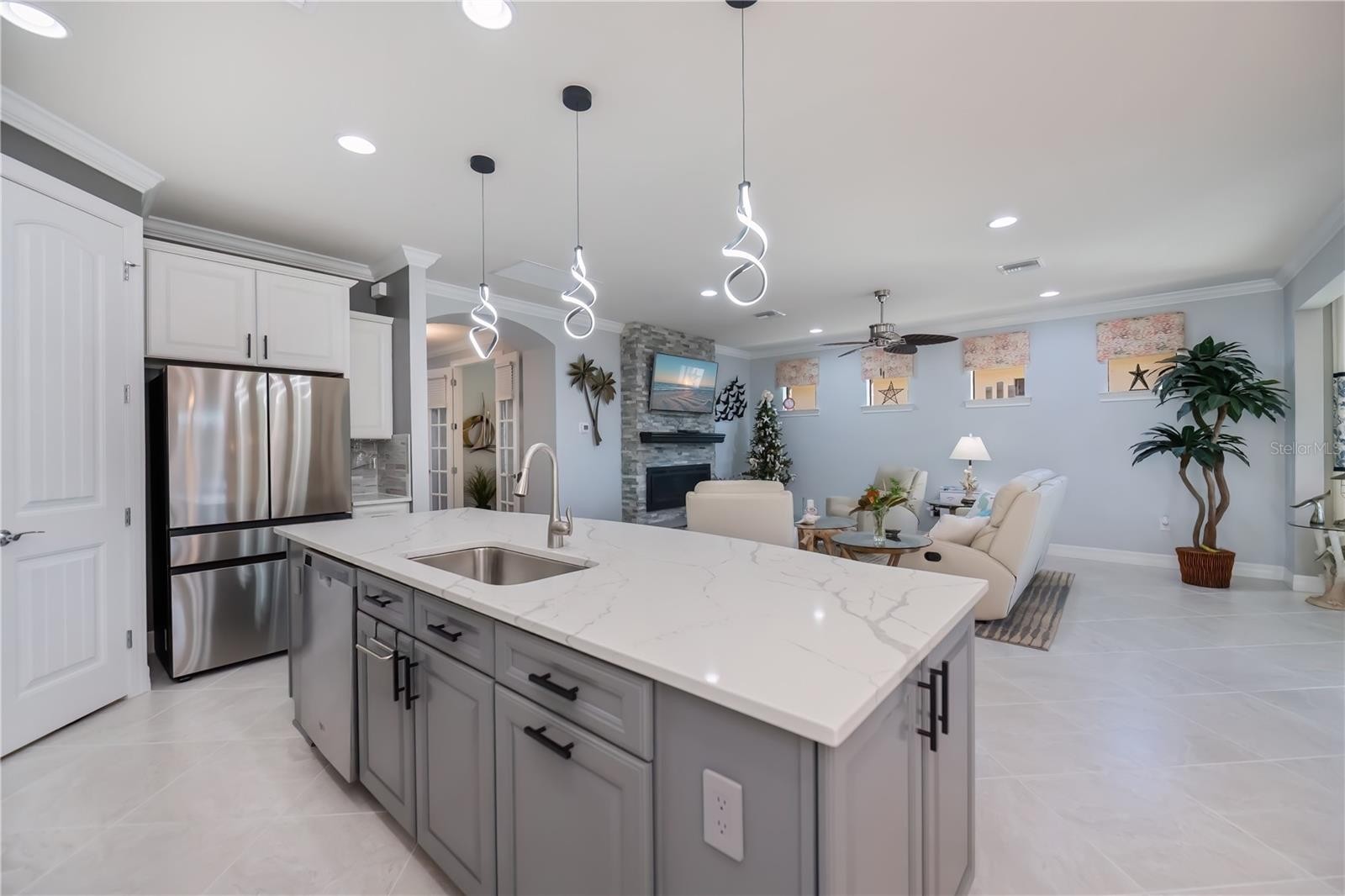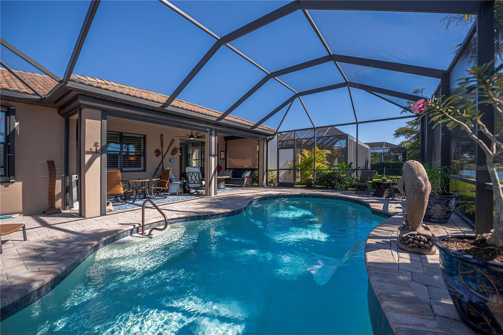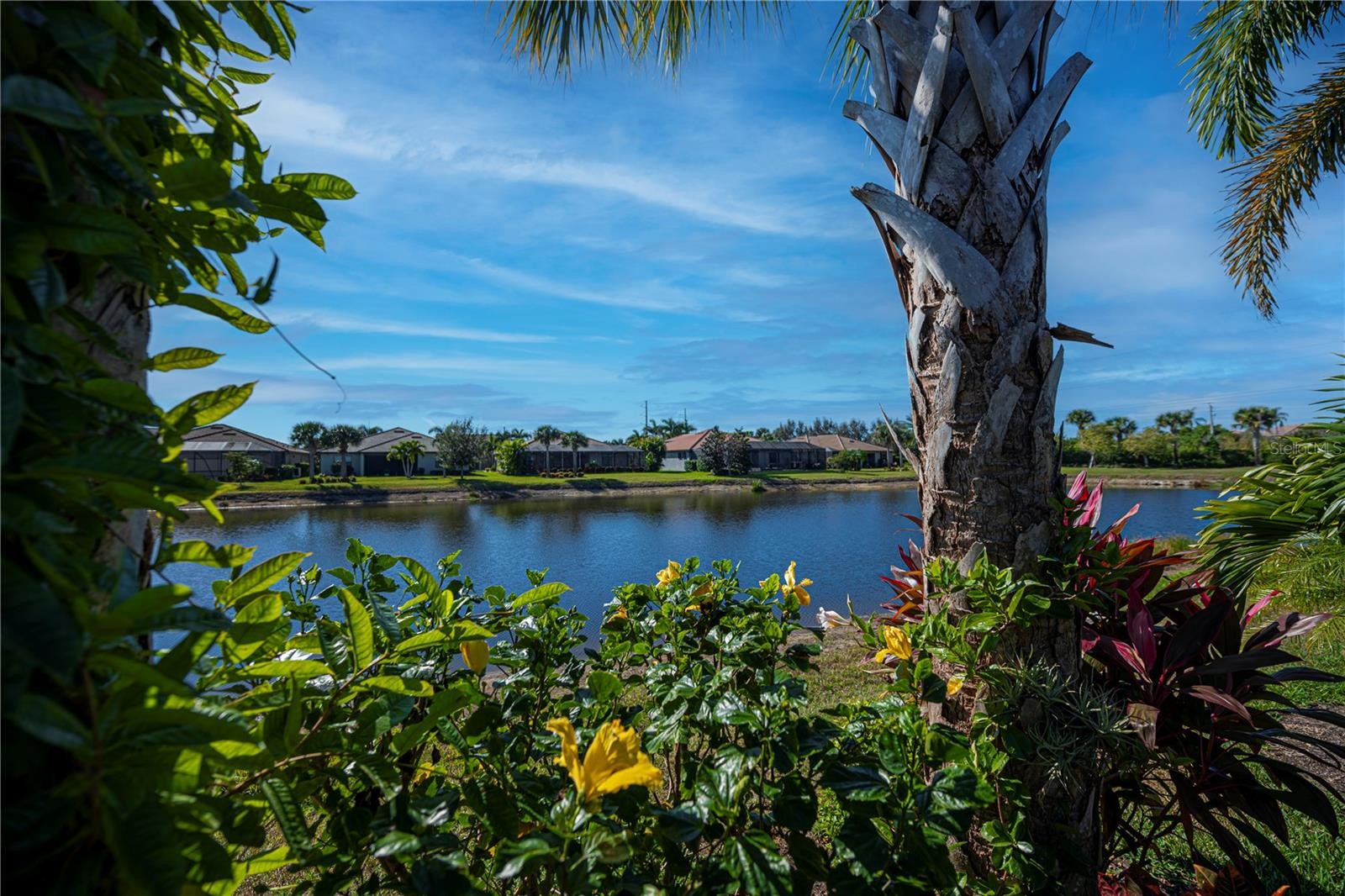 Welcome to Your Floridian Retreat--discover this beautifully maintained Summerwood model in the highly sought-after and amenity-rich community of IslandWalk—this home is thoughtfully updated and finished with exceptional quality throughout. From the moment you arrive, the paver driveway and walkway lead you to a striking glass front door, offering a preview of the elegance inside. Step into freshly repainted interior with crisp walls and baseboards as well as high ceilings that create a bright, inviting atmosphere. The open floor plan flows effortlessly, beginning with a spacious living room anchored by an electric fireplace—a true showpiece. The chef’s kitchen is the heart of the home, featuring a large quartz-topped island and newer appliances including a stove, microwave, and refrigerator. Just off the kitchen, the sunroom provides a cheerful space to enjoy morning coffee or unwind with a good book. The primary suite offers comfort and sophistication with engineered hardwood floors and a custom walk-in closet. The ensuite bath includes dual sinks, granite countertops, a garden tub, and a separate shower. A versatile den with Murphy bed adds flexibility—perfect for a home office, creative studio, or occasional guest room. Step outside to your private oasis: a large covered porch (measuring 9'x25') and screened lanai (measuring 32'x40') overlooking peaceful lake views, complete with a sparkling saltwater pool (with recently replaced salt cell) and a tranquil waterfall feature. Storm Smart power screens and accordion shutters provide added peace of mind. Additional highlights of the home include an extended 20x30 tandem garage with epoxy floors and built-in storage room, as well as a thoughtfully-designed laundry room featuring extensive custom cabinetry and a two-year-old washer and dryer. The home also comes with a current and transferrable Home Choice warranty for added peace of mind. With ceramic tile and engineered hardwood throughout—no carpet in sight!--maintaining this home is a breeze. IslandWalk offers true resort-style living with two geothermal pools, a lap pool, fitness center, pickleball and tennis courts, dog park, and more. This home blends luxury, functionality, and comfort—ready for you to move right in and embrace the Florida lifestyle.