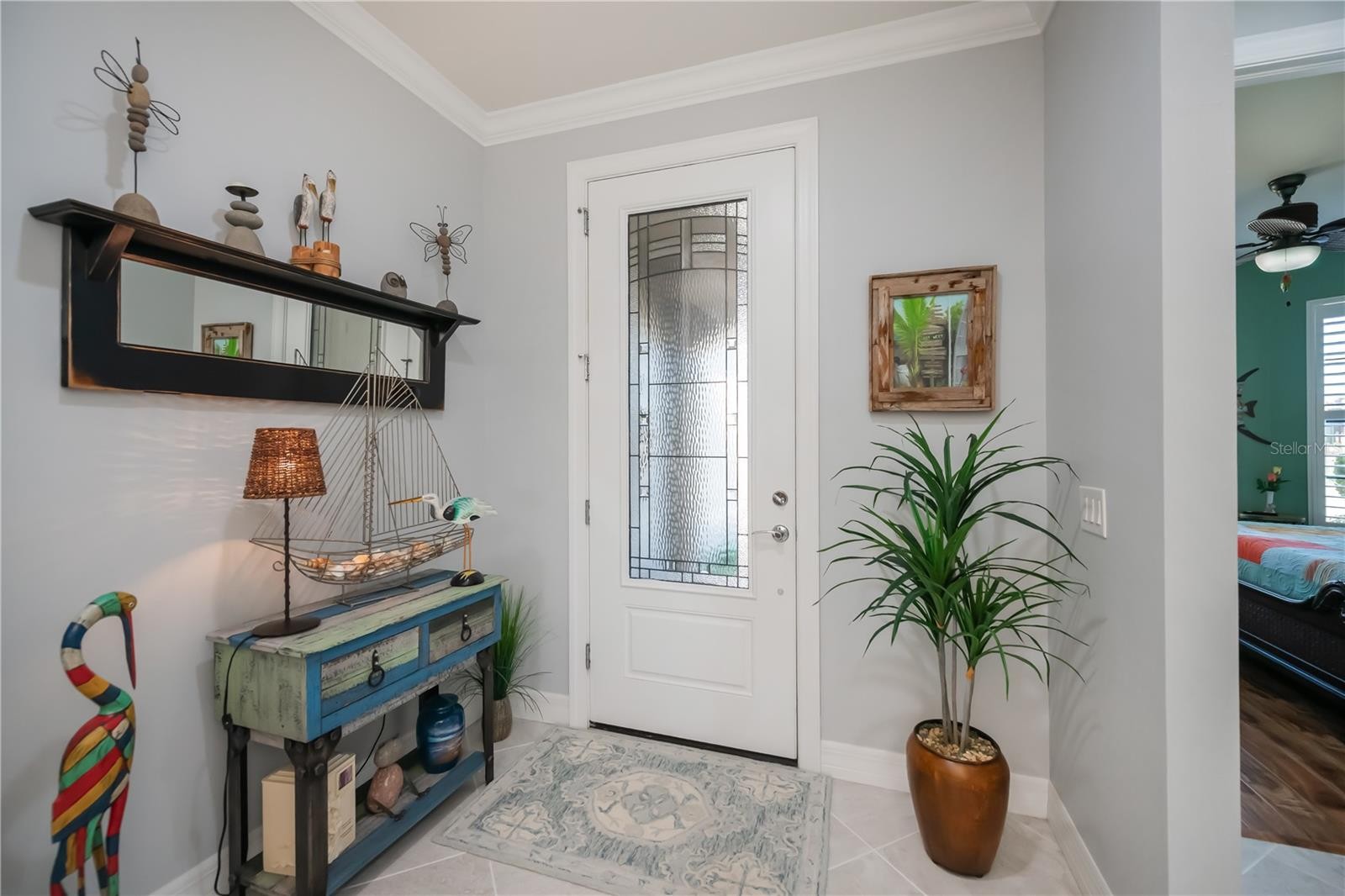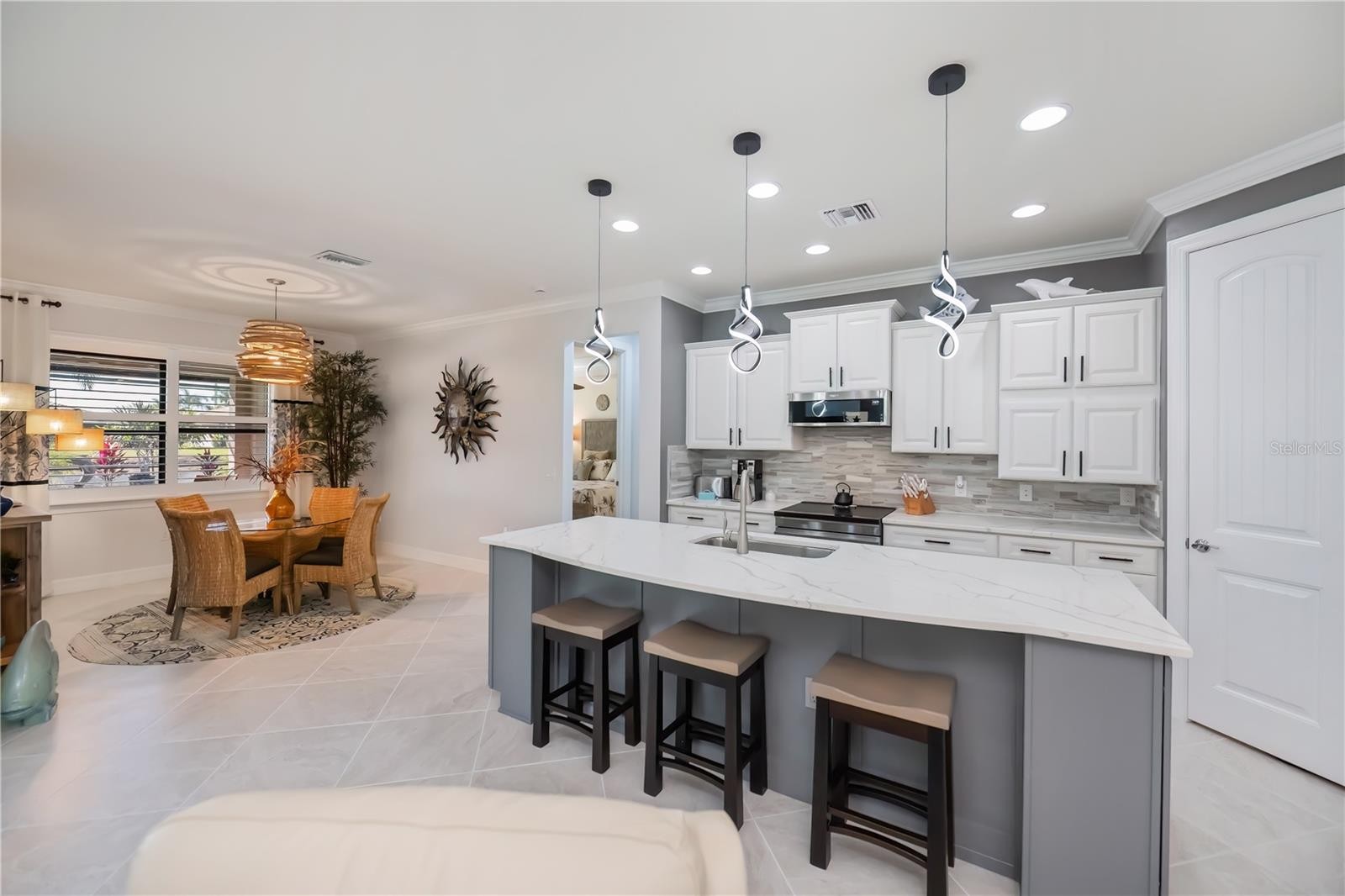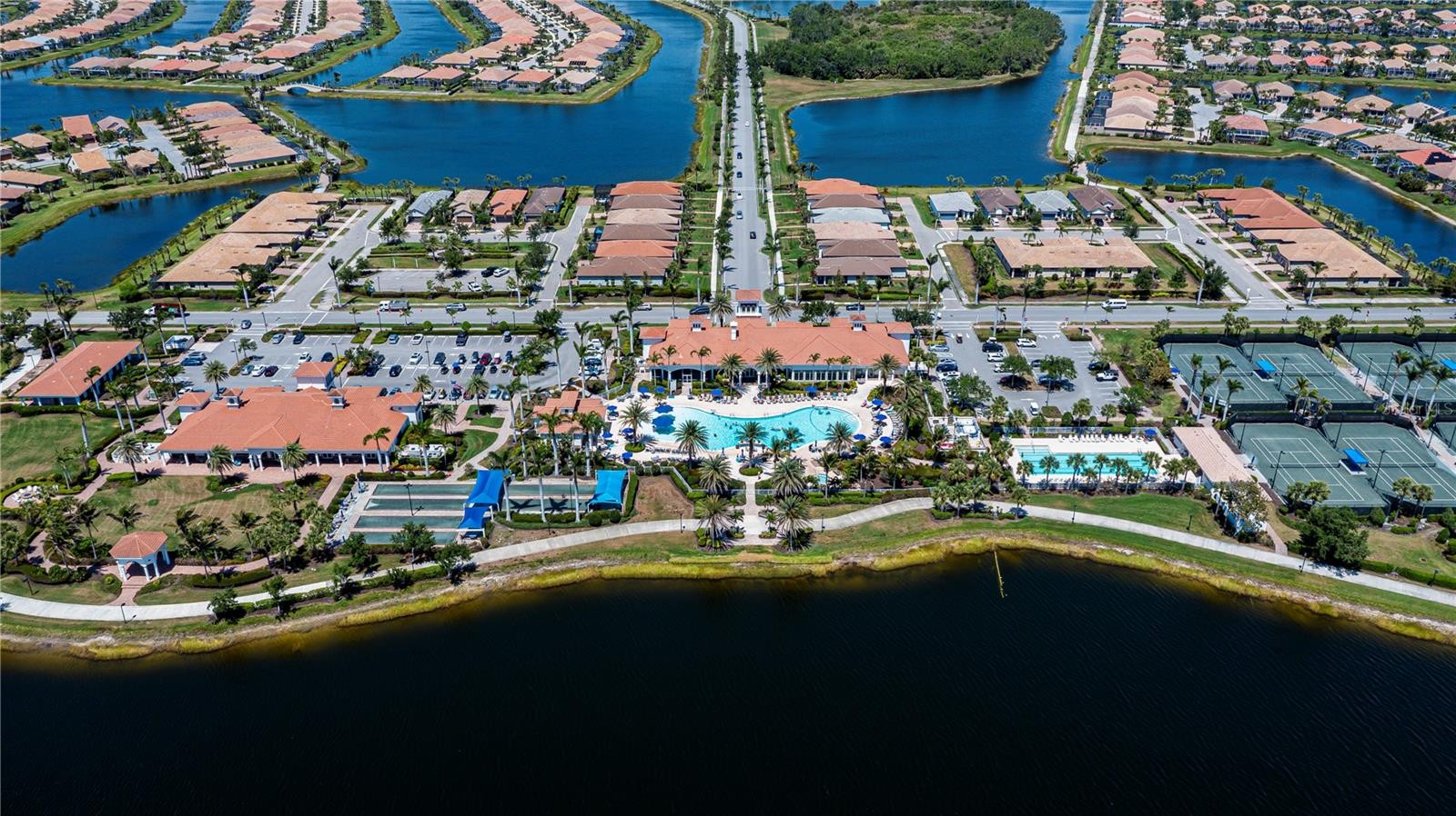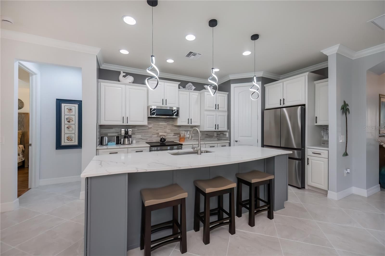 Welcome to Your Floridian Retreat--discover this beautifully maintained Summerwood model in the highly sought-after and amenity-rich community of IslandWalk—this home is thoughtfully updated and finished with exceptional quality throughout. From the moment you arrive, the paver driveway and walkway lead you to a striking glass front door, offering a preview of the elegance inside. Step into freshly repainted interior with crisp walls and baseboards as well as high ceilings that create a bright, inviting atmosphere. The open floor plan flows effortlessly, beginning with a spacious living room anchored by an electric fireplace—a true showpiece. The chef’s kitchen is the heart of the home, featuring a large quartz-topped island and newer appliances including a stove, microwave, and refrigerator. Just off the kitchen, the sunroom provides a cheerful space to enjoy morning coffee or unwind with a good book. The primary suite offers comfort and sophistication with engineered hardwood floors and a custom walk-in closet. The ensuite bath includes dual sinks, granite countertops, a garden tub, and a separate shower. A versatile den with Murphy bed adds flexibility—perfect for a home office, creative studio, or occasional guest room. Step outside to your private oasis: a large covered porch (measuring 9'x25') and screened lanai (measuring 32'x40') overlooking peaceful lake views, complete with a sparkling saltwater pool (with recently replaced salt cell) and a tranquil waterfall feature. Storm Smart power screens and accordion shutters provide added peace of mind. Additional highlights of the home include an extended 20x30 tandem garage with epoxy floors and built-in storage room, as well as a thoughtfully-designed laundry room featuring extensive custom cabinetry and a two-year-old washer and dryer. The home also comes with a current and transferrable Home Choice warranty for added peace of mind. With ceramic tile and engineered hardwood throughout—no carpet in sight!--maintaining this home is a breeze. IslandWalk offers true resort-style living with two geothermal pools, a lap pool, fitness center, pickleball and tennis courts, dog park, and more. This home blends luxury, functionality, and comfort—ready for you to move right in and embrace the Florida lifestyle.