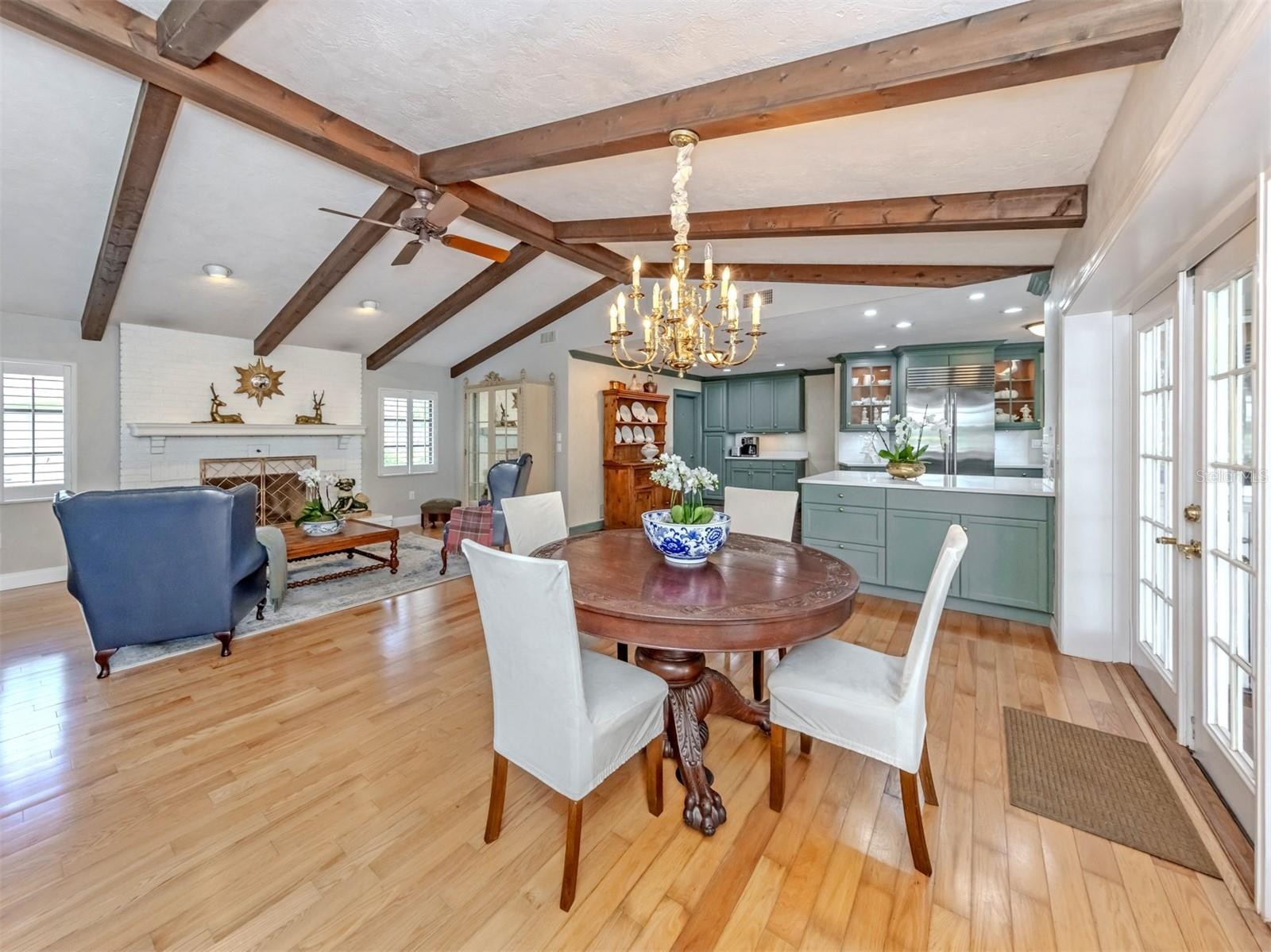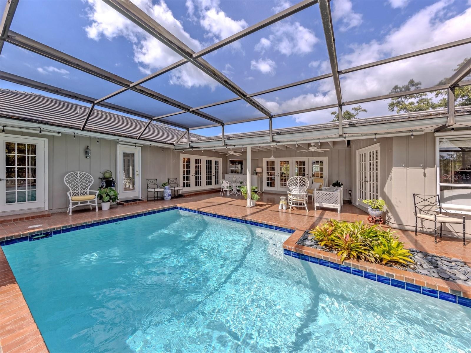 Tucked away on over a third of an acre in the sought after community of Sorrento Woods, this beautifully maintained residence blends privacy, space, and serene pond views with a sense of tropical elegance throughout. The custom-designed landscape creates a lush, garden-like setting that feels both peaceful and inviting, offering water views that can be enjoyed from many rooms. With 2,799 square feet under air and a thoughtfully designed split floor plan, the home offers both comfort and functionality. Engineered wood flooring flows through the main living areas, complemented by plantation shutters and custom details that add warmth and character throughout. The spacious foyer opens to a formal living room featuring two sets of French doors leading to the pool area, filling the space with natural light and creating seamless indoor-outdoor living. The formal dining room is highlighted by a beautiful picture window and elegant chandelier. At the heart of the home is the updated custom kitchen designed for both everyday living and entertaining, featuring a Viking eight-burner gas stove, Sub Zero refrigerator, Dacor dishwasher, abundant counter space, a walk-in pantry with custom-built shelving and display areas, and a dedicated coffee bar. The adjoining family room offers a cozy gas fireplace, while the generous casual dining area is spacious enough to accommodate larger gatherings and includes two sets of French doors opening to the pool. The primary suite offers a true retreat with hardwood floors extending into a charming sitting room/library complete with built-in desk and shelving and direct access to the pool. Dual closets feature custom closet systems. The ensuite bath includes marble flooring, a Roman shower with built-in bench, double vanities and a standalone soaking tub positioned beside a picture window overlooking a private walled garden. Guest bedrooms are equally inviting, offering hardwood floors and walk-in closets. The expansive pool area provides ample room for entertaining or relaxing while enjoying tranquil pond views and the surrounding natural beauty. The setting captures the essence of tropical Florida living at its finest. Residents of Sorrento Woods enjoy a private boat launch and fishing pier, as well as a playground, horseshoes, and bocce ball courts. Conveniently located near shopping, dining, Gulf beaches and all that Nokomis has to offer.