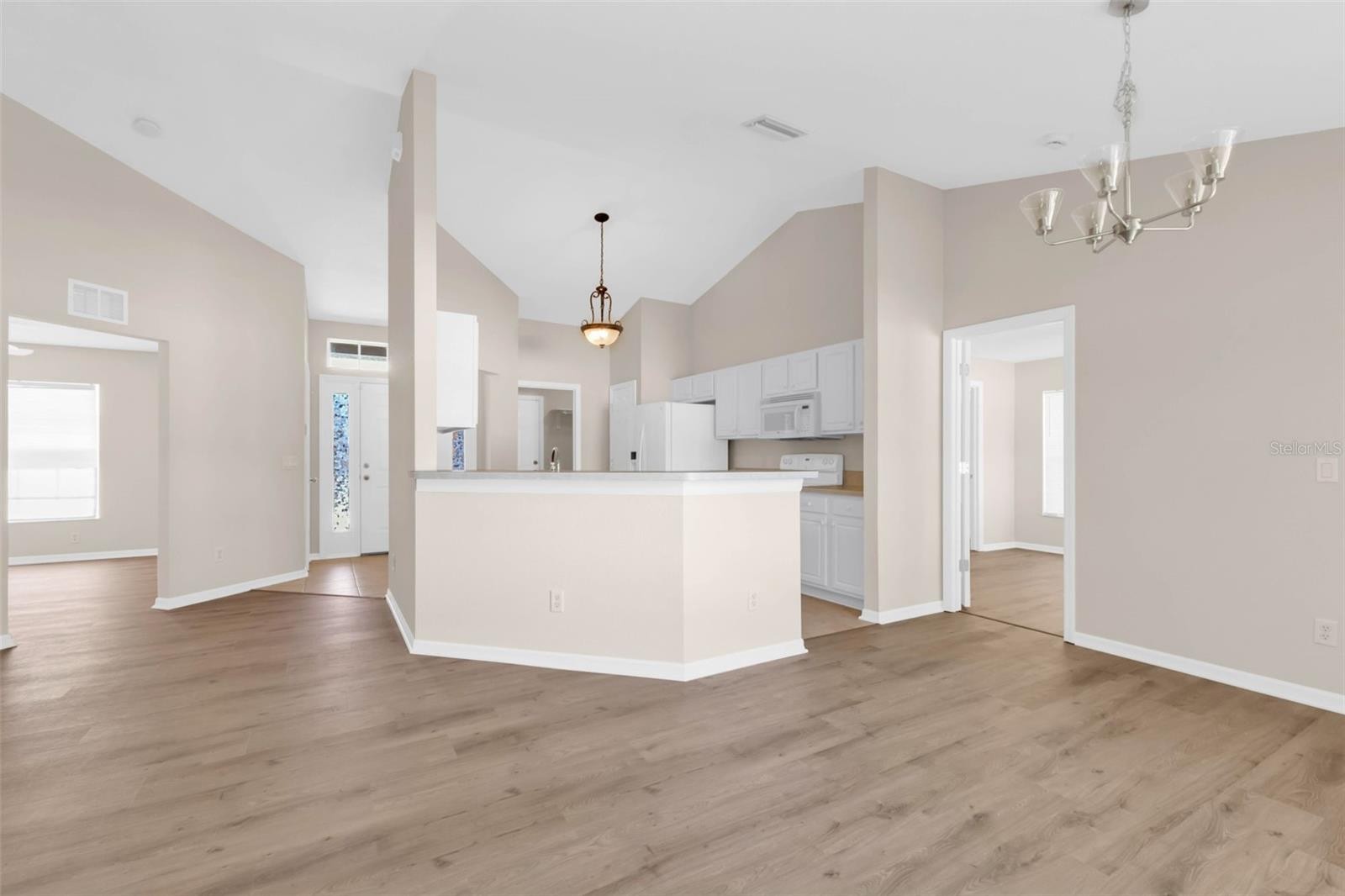 Meticulously maintained 3-bedroom + den, 2-bath home with a 2-car garage, ideally located in North Port. Major updates include a 2022 roof and A/C system, 2024 gutters and hot water heater, and 2025 well pump for peace of mind. This thoughtfully designed split-bedroom floor plan features fresh interior paint, window blinds, and new water-resistant LVP flooring throughout the main living areas and bedrooms, complemented by ceramic tile in the kitchen and bathrooms. Vaulted ceilings enhance the main living spaces, creating a bright, open, and airy atmosphere. The kitchen is perfect for entertaining, offering a convenient breakfast bar-style island and ample space for gathering. The spacious primary suite includes a large walk-in closet, dual sink vanities, a tub/shower combination, and a private water closet. Additional highlights include an indoor laundry room, FENCED in backyard, and a screened-in patio—ideal for relaxing or enjoying Florida living year-round. Conveniently situated just minutes from major highways, grocery stores, shopping, dining, parks, and everyday essentials. Seller financing available; 5-year balloon term.