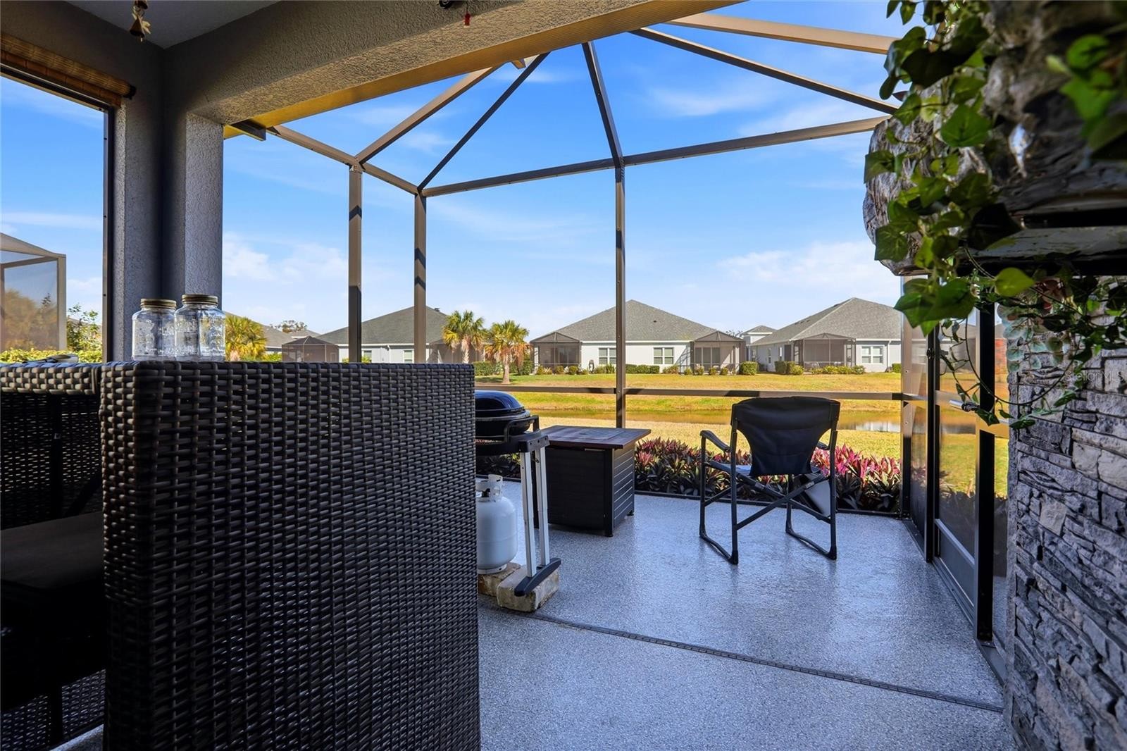 Immaculate Villa with water view. 2 bedroom, 2 bath, plus Den/3rd bedroom. Only 5 years new, built by Neal Communities. NO CDD. Maintenance Free Community, HOA mows and trims your lawn and shrubs The epoxy coated porch floor and beautiful glass insert front door give you an idea of the special touches added to this home. This model is light and airy with ceiling fans in every room. The perfect cooks kitchen, offering a gas oven/range, premium Westinghouse appliances, granite counter tops, wood cabinets, easy/quiet close drawers, oversized kitchen island perfect for easy dining or entertaining. Beautiful faux brick wall in family room, recessed lighting and tray ceilings, tile flooring and a great view of the pond and backyard,. The master bedroom has ceiling fan, carpet flooring, 2 closets. The master bathroom offers a walk-in shower, dual vanities and tile flooring. The 2nd bedroom has carpet flooring, ceiling fan and murphy bed. The den/3rd bedroom is light and airy with front window overlooking the front yard, ceiling fan and carpet flooring. Relax in your extended screen Lanai is13 ft X 16 ft. offers epoxy coated floor and a faux brick wall with water fountain. The garage is cooled with its own mini split AC unit, has colorful epoxy floor, commercial grade metal cabinets and shelves, work bench, insulated attic and garage door, this is the perfect workshop. The Villas have a Pool, spa and outdoor kitchen a short walk down the street. If you prefer a larger pool and more amenities, as a Canoe Creek resident you have access across the street to all the other resort-style amenities, including private heated pool and spa, clubhouse with kitchen, Fitness center, year-round social events, 4 pickleball courts, dog park. All furniture in the house are available for purchase outside of closing.