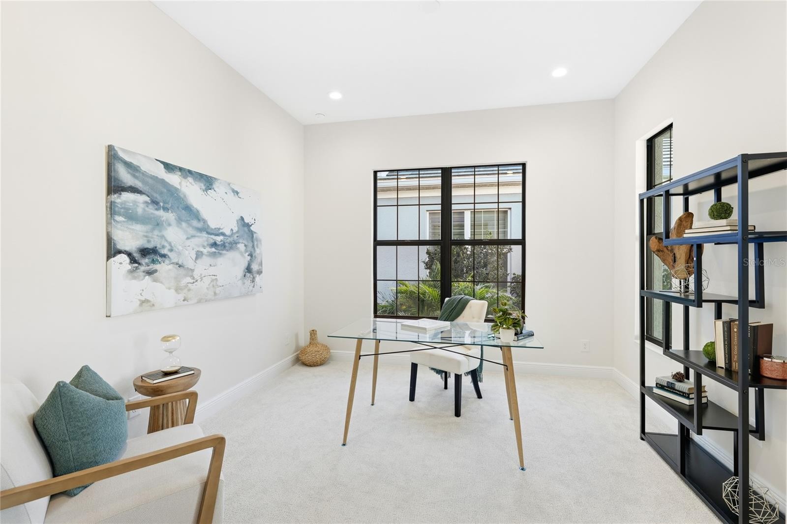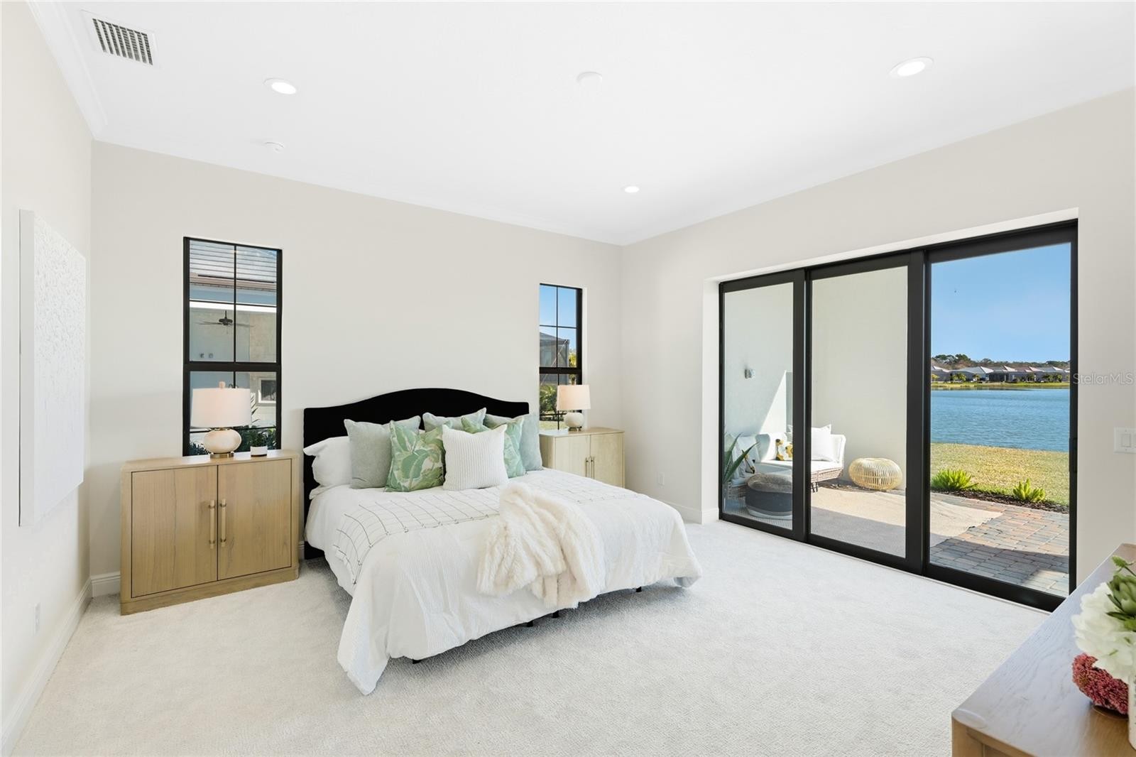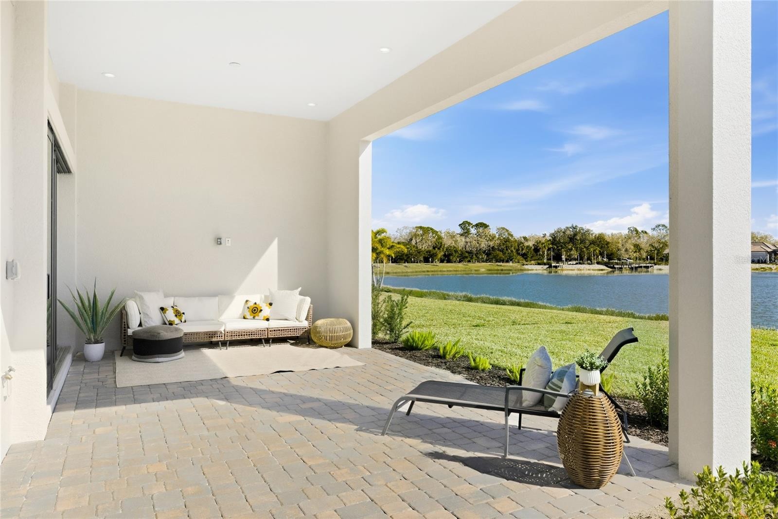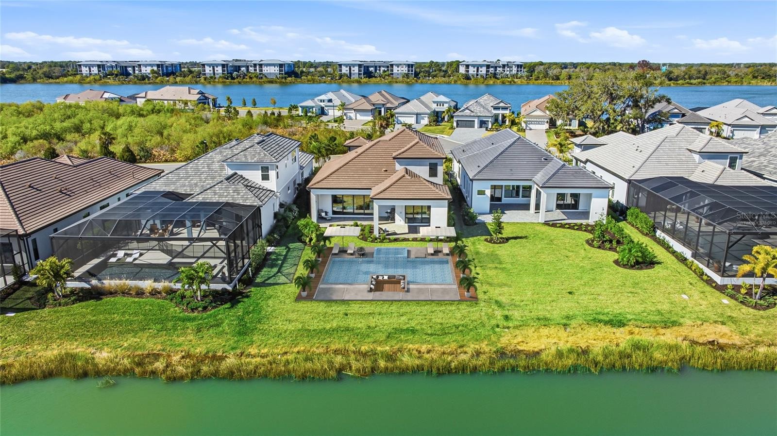 One or more photo(s) has been virtually staged. Welcome to the stunning 1504 Corfu Place perfectly tucked away on a cul-de-sac street and positioned on a premier lot valued at $254,000 at the time of purchase. This home features a 8 foot, 3-car garage extension, 4 large bedrooms, 4 full bathrooms, plus a Den/Office, second floor Bonus Room with the 4th bedroom ensuite, first floor third bedroom with custom ensuite and a extended Lanai that has unobstructed panoramic views of the scenic Blue Heron Lake. Notable structural upgrades include whole-house impact resistant glass windows and doors, impact resistant pocket sliders off the great room and primary bedroom suite, added foam insulation in exterior block, outdoor kitchen rough-in and venting, 400 amp service upgrade for future solar/generator power, tankless gas water heater with recirculate system, smart home package, epoxy garage flooring, water loop for a future filtration system and ceiling fan prewiring in multiple rooms. Designed with both immediate enjoyment and future flexibility in mind, the home does not currently include a pool allowing the next owner to enjoy lower maintenance costs while having the freedom to design and build a fully customized pool tailored to their lifestyle. The expansive extended lanai is already plumbed, wired, and prepped for a future outdoor kitchen and custom pool, including gas heater stub-out, making installation seamless while preserving the full value of the oversized lot and lake views. Inside, guests are welcomed by a foyer with two, 13-foot tray ceilings showcasing abundant natural light. The open-concept floor plan centers around a Gourmet Kitchen with an expansive quartz island, stainless steel appliances, a 36” hood and gas cooktop, wall oven/microwave combo, double-stacked cabinetry with crown molding, soft close drawers, and a hide-away, custom walk-in pantry with wood shelving and privacy door. The Great Room also boasts a 13-foot tray ceiling, recessed lighting and abundant natural light from pocket sliders with transom windows leading to the large double lanai space. Adjacent to the great room is the dining room, which is wrapped in windows with a modern chandelier, offering a beautiful setting for both daily and formal entertaining. The split floor plan home provides privacy, placing the Primary Suite at the rear of the home. The primary suite features pocket slider doors opening up to an extended L-Shaped Lanai for ultimate privacy from neighbors, two custom walk-in closets, and a luxurious ensuite bathroom with upgraded Bianco Covelano porcelain flooring, dual sinks, 56" high vanity mirror and vanity lights, walk-in shower, and custom vented wood shelving in all closets. Two guest bedrooms at the front of the home share a unique, custom walk-through closet area under the stairs. One guest bedroom has an ensuite bathroom with walk-in shower, while the other guest bedroom shares a hallway bathroom with walk-in shower, ideally positioned to serve both daily use and guests. The Alcove is an exclusive boutique community of just 47 homes offering a private and serene lifestyle while being minutes from Waterside Place and Waterside Park, farmers markets, wellness paths, volleyball courts, UTC, Downtown Sarasota, St. Armands Circle, and the Gulf Beaches of Siesta Key, Longboat Key, Lido Beach, and Anna Maria Island. Please view the Matterport Tour link to walk-through this beautiful home The only photo that has been virtually staged is the pool.