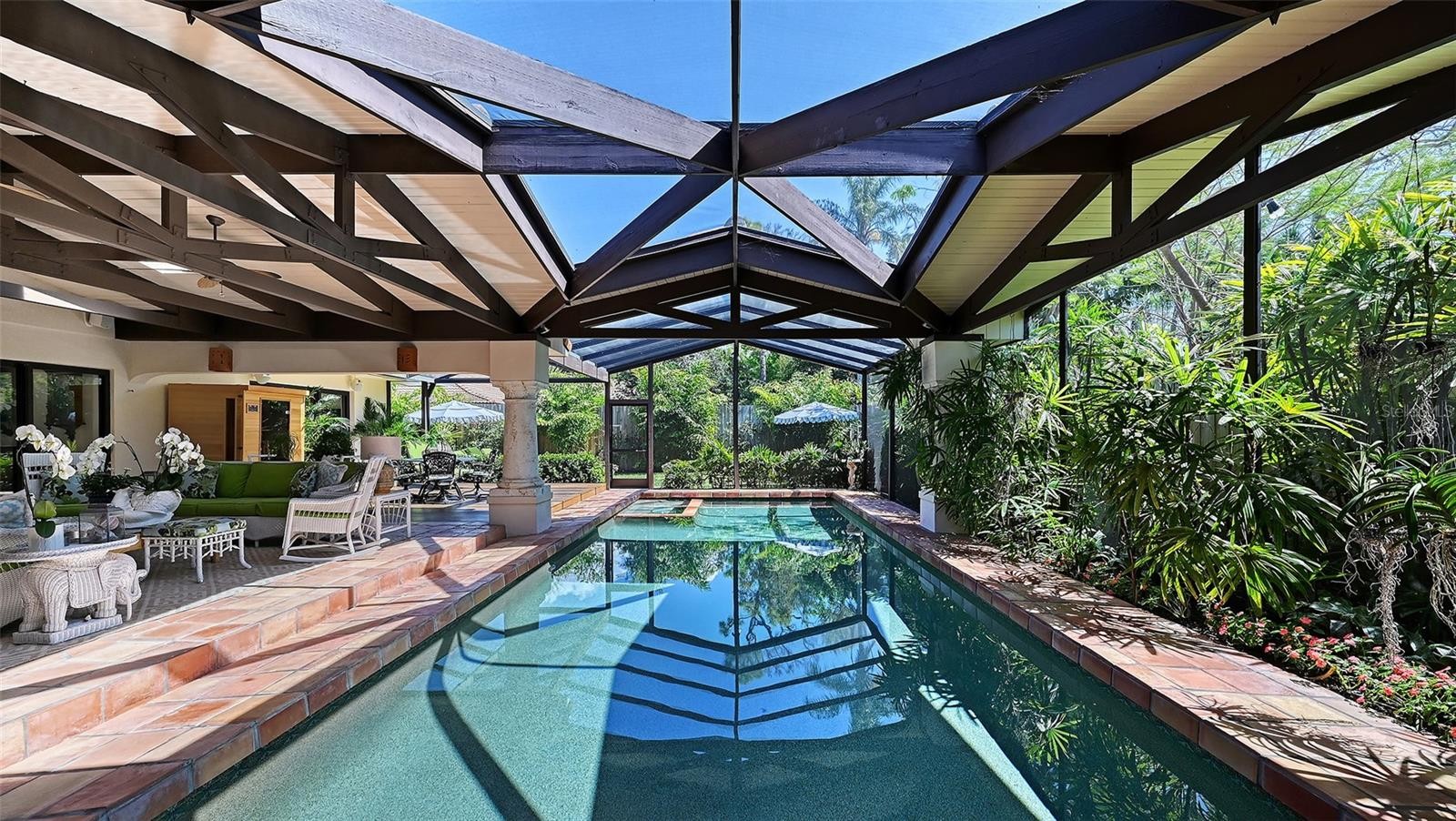 Located in the sought-after West of Trail neighborhood of Oyster Bay Estates, this beautifully updated residence sits on nearly one-third of an acre just around the corner from the historic Field Club. The home blends timeless architectural character with extensive recent improvements, creating a refined yet relaxed retreat close to Sarasota’s most desirable destinations. A beautifully landscaped yard and newly added covered front porch with brick pavers create inviting curb appeal and lead to a charming courtyard entry. Inside, the home showcases distinctive craftsmanship and warm architectural details, including Mexican tile floors, natural wood cabinetry and baseboards, exposed ceiling beams, plantation shutters, and hand-crafted clay sconces and pendant lighting. Fresh interior and exterior paint, updated trim, solid-core doors, and impact-rated windows and doors complement the home’s original character while adding modern comfort. The main living spaces flow naturally together, with the kitchen, dining area, and living room opening through walls of glass to the expansive screened lanai. A wood-burning fireplace with carved stone mantel anchors the living room, while a newly detailed tray ceiling adds architectural interest. The kitchen combines artisanal style with high-end functionality, offering custom wood cabinetry, updated countertops, an intricate ceiling detail, and premium appliances including a Sub-Zero refrigerator and Fisher & Paykel dual-fuel range with side-by-side ovens. Privately positioned, the primary suite features vaulted ceilings with exposed wood beams and sliding glass pocket doors that open directly to the pool terrace. Two walk-in closets with newly designed systems lead to the renovated primary bath, which offers dual vanities, private water closets, and a spacious walk-in shower. Two generously sized guest bedrooms provide comfortable accommodations, each with built-in closet systems and beautifully renovated en-suite baths, creating privacy for family and guests within the home’s traditional split floor plan. Outdoor living is designed for both relaxation and entertaining. The screened lanai surrounds a 40-by-14 heated pool framed by stone columns and generous covered seating areas with wood ceilings, while an Ipe wood open deck, fire pit, and lush tropical landscaping create a private backyard sanctuary. Additional improvements include updated plumbing and HVAC throughout, new ductwork and attic insulation, LED lighting, a Sonos sound system in the main living area and covered porch, renovated laundry room with new cabinetry and appliances, epoxy garage flooring, and a propane tankless water heater with gas supplied to the kitchen range and outdoor grill. Ideally located close to shopping, dining, and just minutes from world-renowned Siesta Beach and downtown Sarasota, this Oyster Bay Estates home offers a rare blend of character, privacy, and thoughtful updates in one of Sarasota’s most established neighborhoods.