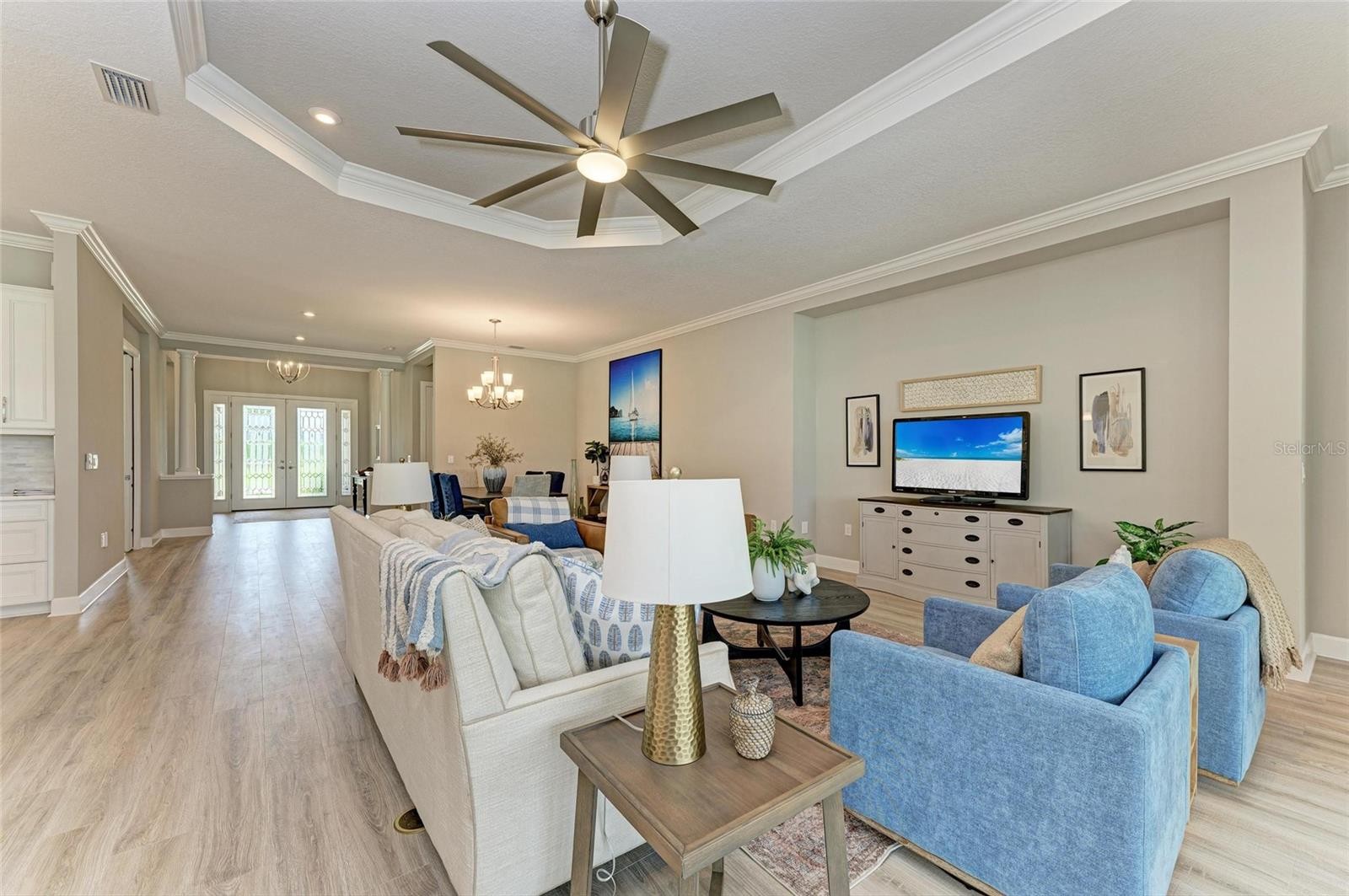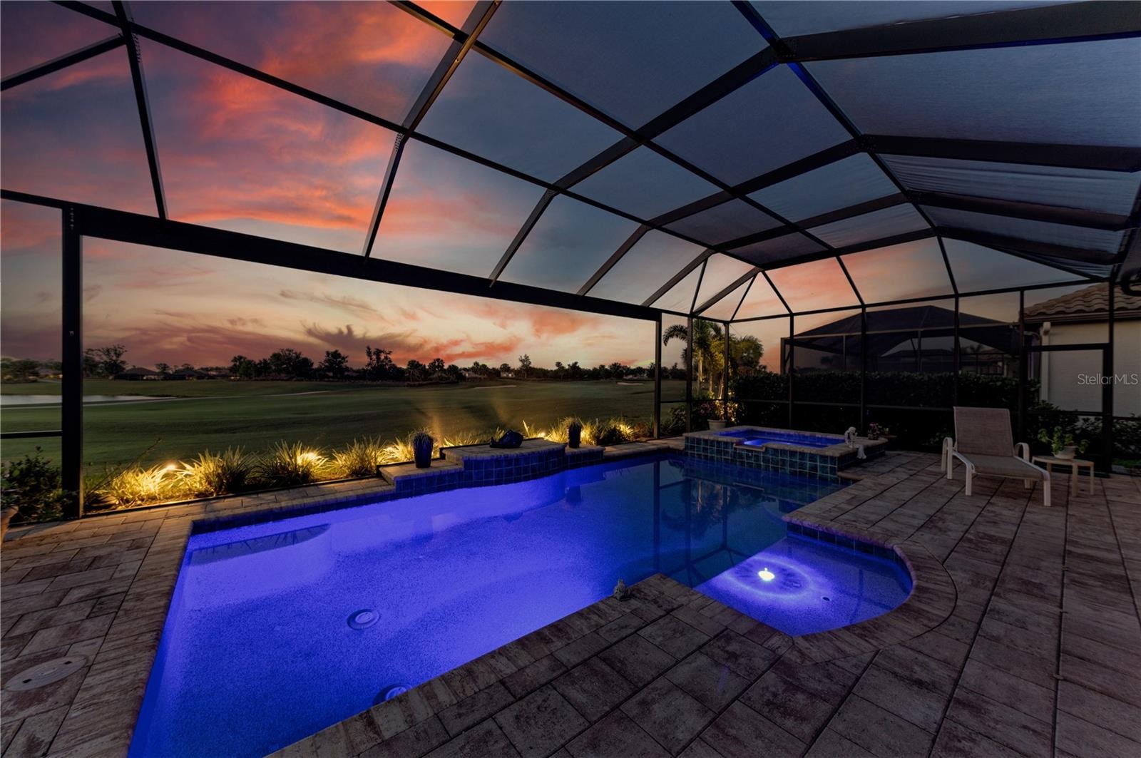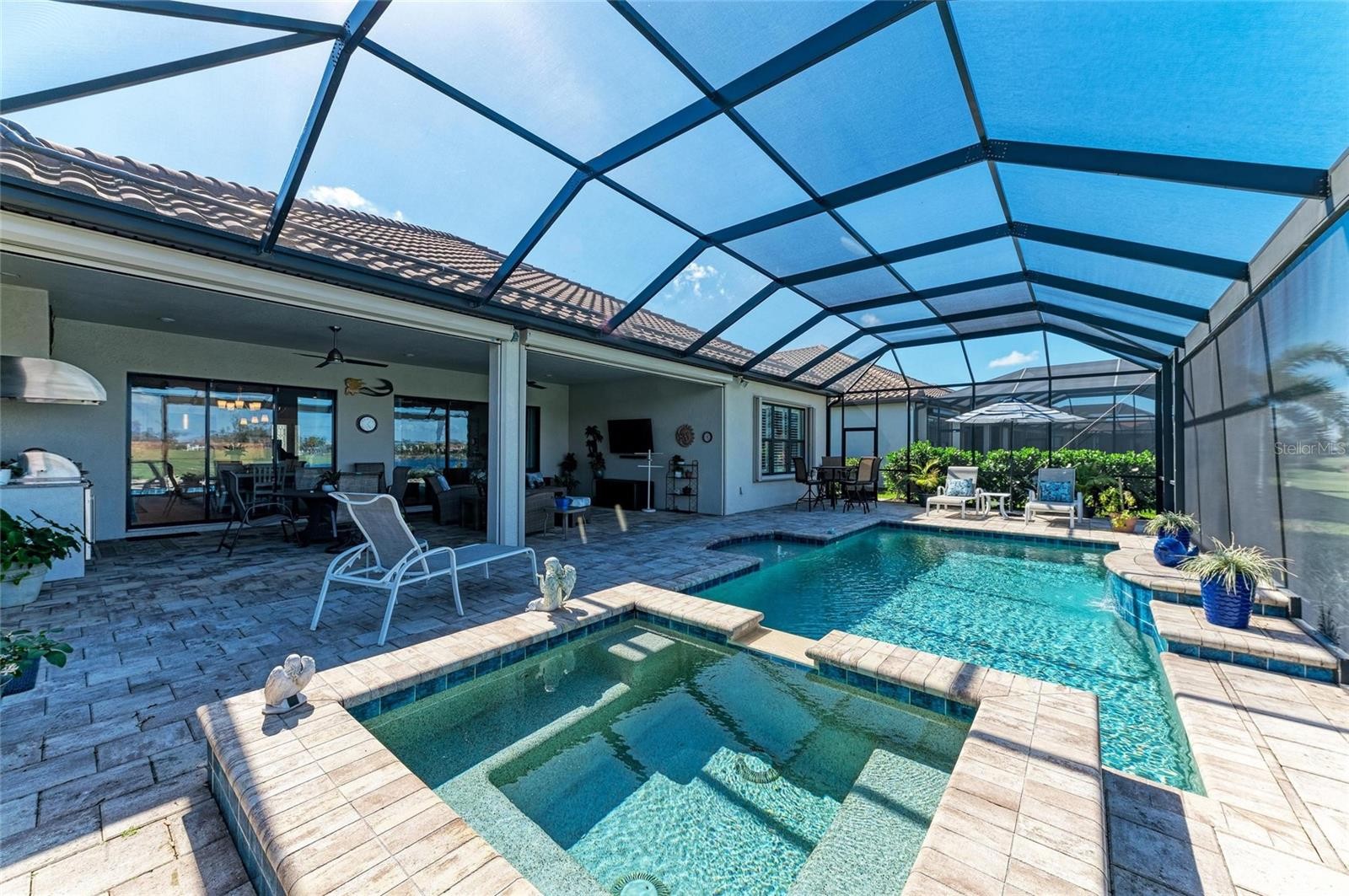 Welcome to luxury living at its finest in this exquisite Pallazio model home in Esplanade at Azario in Lakewood Ranch. Featuring 3 bedrooms, 3 bathrooms, a private office/den, and breathtaking views of the signature fairway of the 15th hole and lake views. Nestled within the highly desirable Esplanade at Azario community in Lakewood Ranch, this residence is designed for both elegance and comfort. Step through the elegant etched-glass front door into an expansive open floor plan boasting a spacious great room and dining area, soaring tray ceilings, and crown molding throughout. The gourmet kitchen is a dream for entertainers and chefs alike, featuring two sinks, state-of-the-art appliances, a large center island, and panoramic views of the heated pool, spa, golf course, and lake—framed beautifully by a Clearview pool cage. The primary suite offers a peaceful retreat, complete with tray ceiling, luxurious ensuite bath with a garden tub, walk-in shower, dual vanities, and a private water closet. A custom walk-in closet with built-in storage ensures effortless organization. Designed with privacy in mind, this split floor plan provides ensuite baths for each bedroom. The private den with double pocket doors offers versatility as a home office or relaxation space, with direct access to an adjoining full bathroom. Additional highlights include: Extended garage Kevlar hurricane screen and impact windows in the front Whole-house generator Covered lanai with resort-style heated pool and spa Unobstructed golf and lake views All golf included at no additional cost except for golf carts $28. Esplanade at Azario redefines resort living with world-class amenities, including: A heated resort-style pool State-of-the-art fitness center with aerobic classes Luxury spa offering facials and massages Multiple pickleball, tennis, and bocce ball courts Community walking trails, vitality park, and fire pit The Bahama Bar, a full-service outdoor bar and restaurant The new 15,000-square-foot Culinary Center for upscale dining An 18-hole championship golf course open to members and public tee times Whether you’re looking to relax, stay active, or socialize, this home and its community is the ultimate Florida lifestyle. Don't miss your chance to own a piece of paradise—schedule your private showing today!