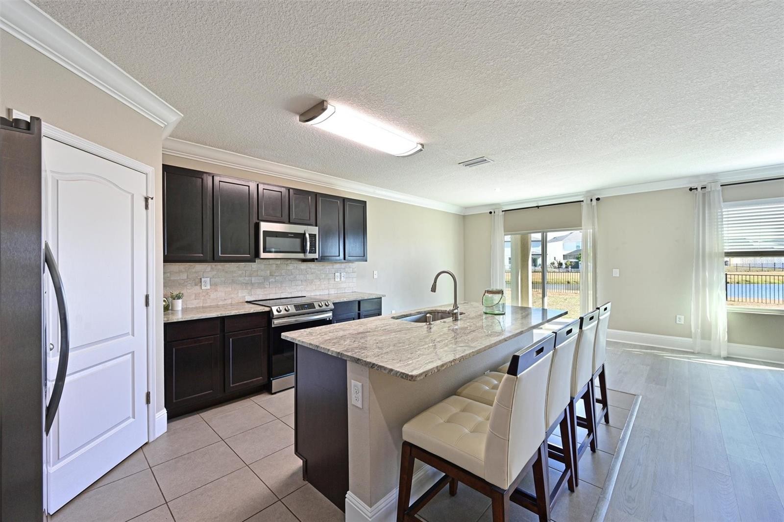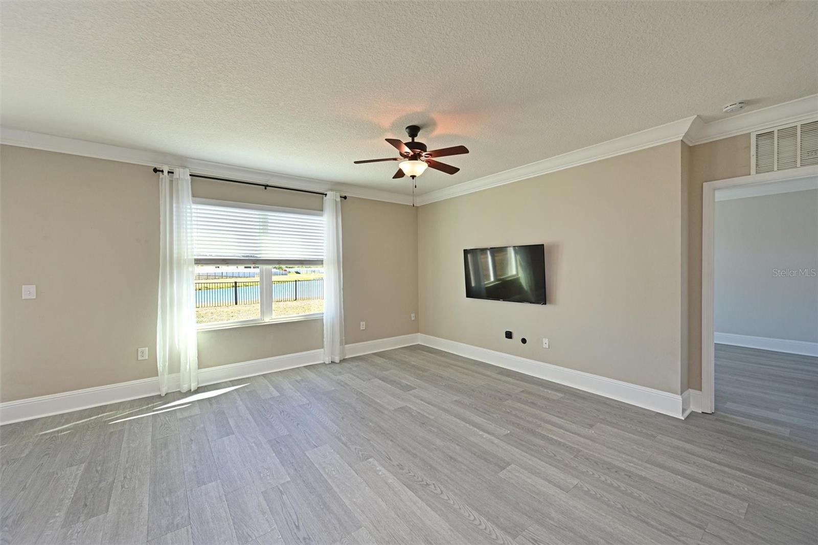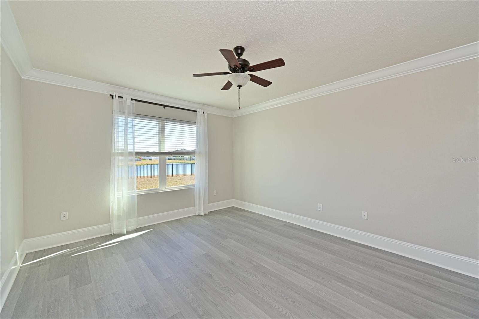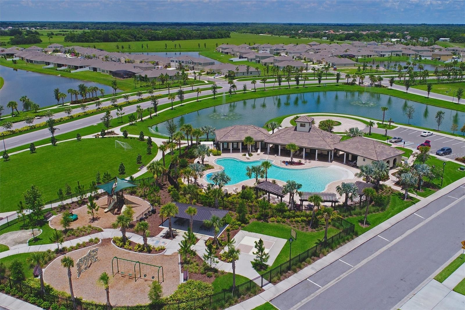 RESORT STYLE LIVING awaits you in this beautiful 5-BEDROOM home nestled on a cul-de-sac in the gated community of Del Tierra. This home offers a vibrant community, coveted schools, modern style, breathtaking lake views and sunsets from your covered lanai. Enjoy peace and security of a NEW ROOF (2024) hurricane shutters and a fully enclosed yard with vinyl fencing on the sides and aluminum fencing in the rear for you to enjoy the peaceful waterfront view. Luxurious finishings include vinyl plank flooring, high baseboards, granite counters, and tile backsplash and a beautiful neutral palette. The open and spacious floor plan flows beautifully from the first floor foyer, den, bath, kitchen, family room, dining area, and primary bedroom, which was freshly painted and has an ensuite bath with dual basins and a large shower. The expansive upstairs bonus area is 24x20 and provides space for relaxation, ample seating for movie nights and gaming. Upstairs, there are four more bedrooms and a full bath. There is plentiful storage space in closets, under the stairs, in the laundry room and in the garage. With NO CDD fees and low HOA fees at $135 a month, this home affords style, comfort, AND affordability. Amenities in Del Tierra include a resort-style pool, a covered area for poolside get-togethers, a fitness center, and a playground. Just minutes from Lakewood Ranch and a short drive to the Marketplace, the UTC Mall, Gulf Beaches, and the Tampa and Sarasota airports. Don't miss the opportunity to make this dream home your own!