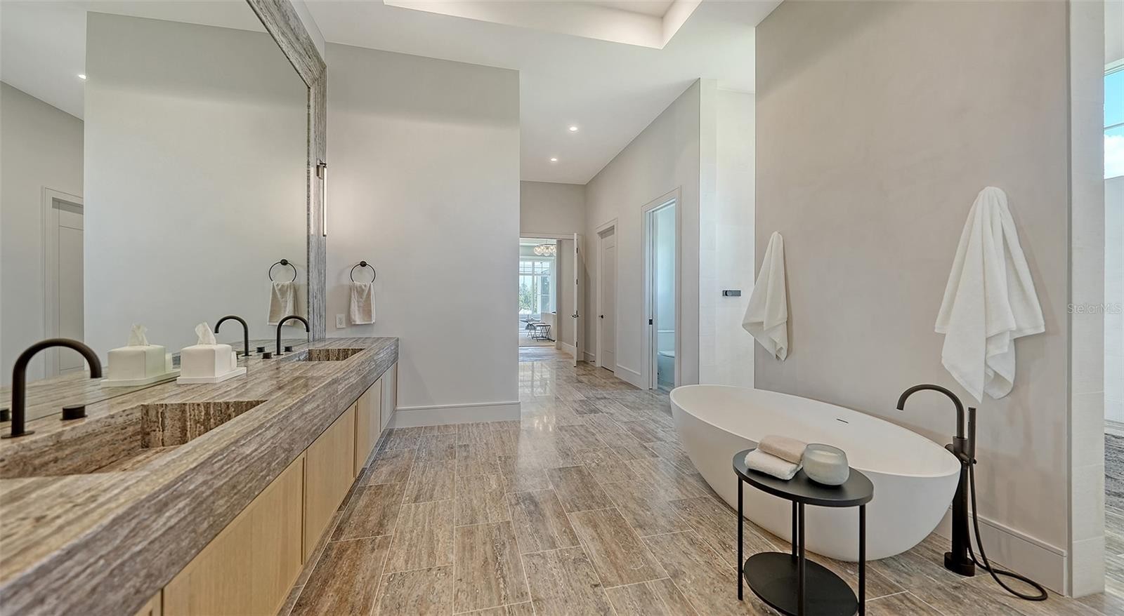 Tucked within the private, gated cul-de-sac enclave of Anchorage Place in The Lake Club, this six-month-old Stock Custom Home is a true architectural masterpiece. Set on two-thirds of an acre with sweeping views of lush natural surroundings, this 5,997 sq. ft., four- bedroom, five-and-a-half bath estate blends modern sophistication with serene, Florida resort-style living. Professionally decorated and fully furnished with new furnishings ($350K furniture package and $100K in recent upgrades), this stunning home embodies “organic modern” elegance—defined by earthy hues, layered textures, and refined finishes. The thoughtful design is evident from the moment you arrive, beginning with a smart glass iron front door with switchable privacy feature, intricate inlay flooring, and 15-foot tongue-and-groove rift-cut white oak ceilings that match the wood flooring throughout. The light-filled great room is anchored by a curved stucco wall with a 72” three-sided gas fireplace and features 10-foot pocketing sliding glass doors topped with transom windows, seamlessly connecting the indoors to the outdoors. A concealed TV, tucked behind remote-controlled artwork, adds to the room’s sleek, sophisticated design. Across the room, a custom curved kitchen hood echoes the architectural elegance of the fireplace wall. The chef’s kitchen is a showstopper with leathered quartzite countertops and backsplashes, dual islands with hidden storage, a large butler pantry, and luxury-grade appliances—including paneled Sub-Zero refrigeration and two Cove dishwashers, and a Wolf dual gas range with six burners, griddle, and double ovens, and a Wolf steamer oven and speed oven. Just off the kitchen is a stylish wet bar with ceiling-mounted shelving, decorative wall tiling, Sub-Zero wine refrigeration, and built-in ice machine—perfect for effortless entertaining. The open-concept dining area features corner pocket sliding doors for full integration with the lanai and pool area, while a generous and versatile bonus room offers flexible living space. The primary suite is a luxurious private retreat, complete with a cozy sitting area, a separate office with floor-to-ceiling built-ins, a morning bar, two custom walk-in closets, and a spa-inspired bath with integrated travertine wall, countertops and flooring, dual water closets, a walk-through shower, and an oval soaking tub. Each of the three guest suites includes its own full en-suite bath and walk-in closet, offering privacy and comfort for family or guests. Step outside to your own private resort—an expansive screened lanai (3,270 sq ft) featuring covered and open-air seating and dining areas, a full outdoor kitchen with island and bar seating, a 72” TV over a 48” linear vent-free fireplace, a saltwater pool and spa with a swim-up bar, and dramatic fire bowls—all set against the tranquil backdrop of preserved natural beauty. Additional highlights include a spacious laundry room with custom cabinetry, a symmetrical four-car garage, a whole-house gas generator, Lutron and Hunter Douglas shades, and an integrated “Smart Home” which includes house-wide boosted Wi-Fi with system integration for selected lighting and shades, all TVs, music, thermostats, all exterior lighting including the lanai and home security cameras. The home includes Starlink to ensure uninterrupted internet access. Located in Lakewood Ranch, Lake Club amenities include a clubhouse, pools, fitness center, tennis and pickleball courts, scenic trail.