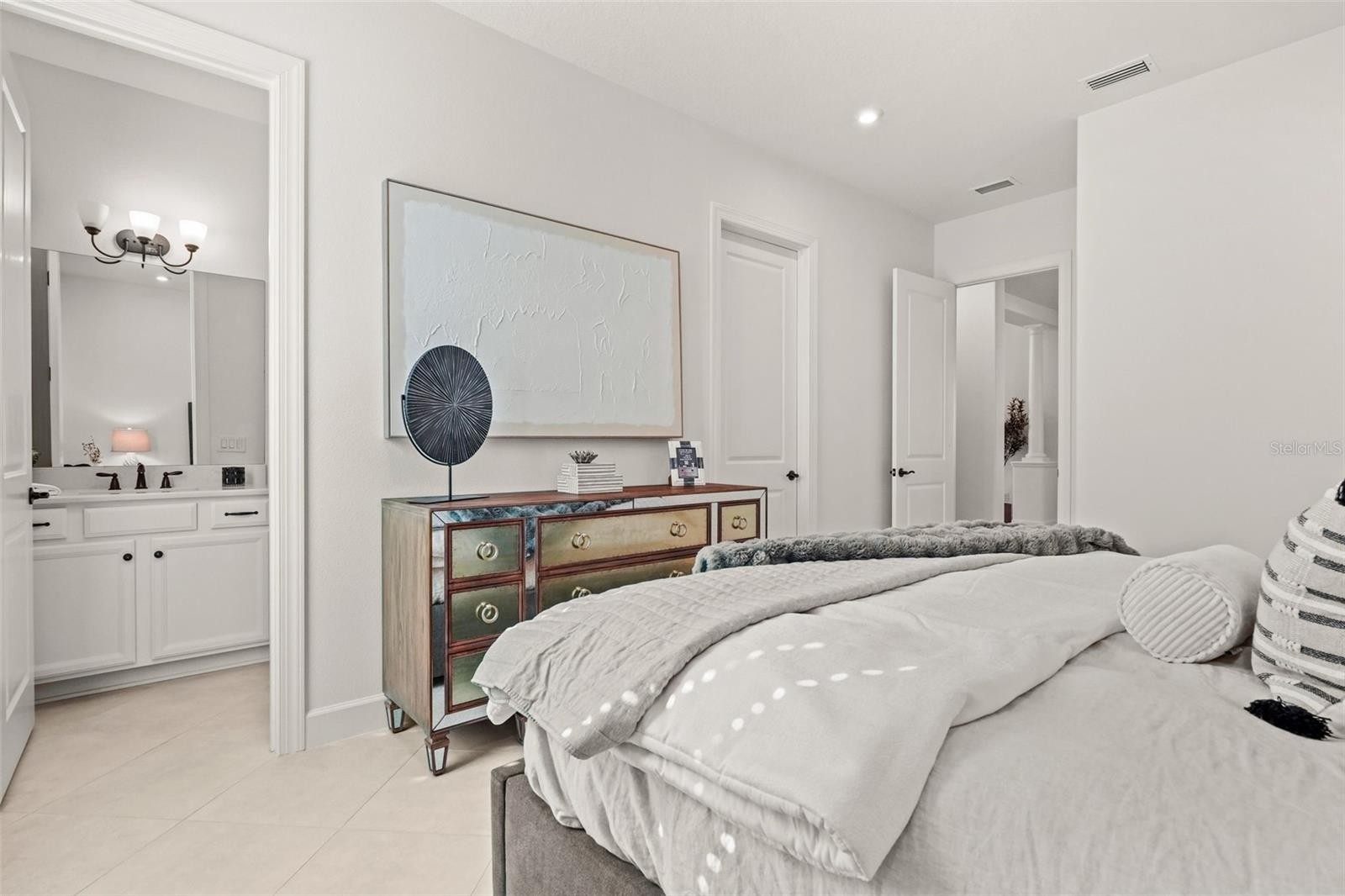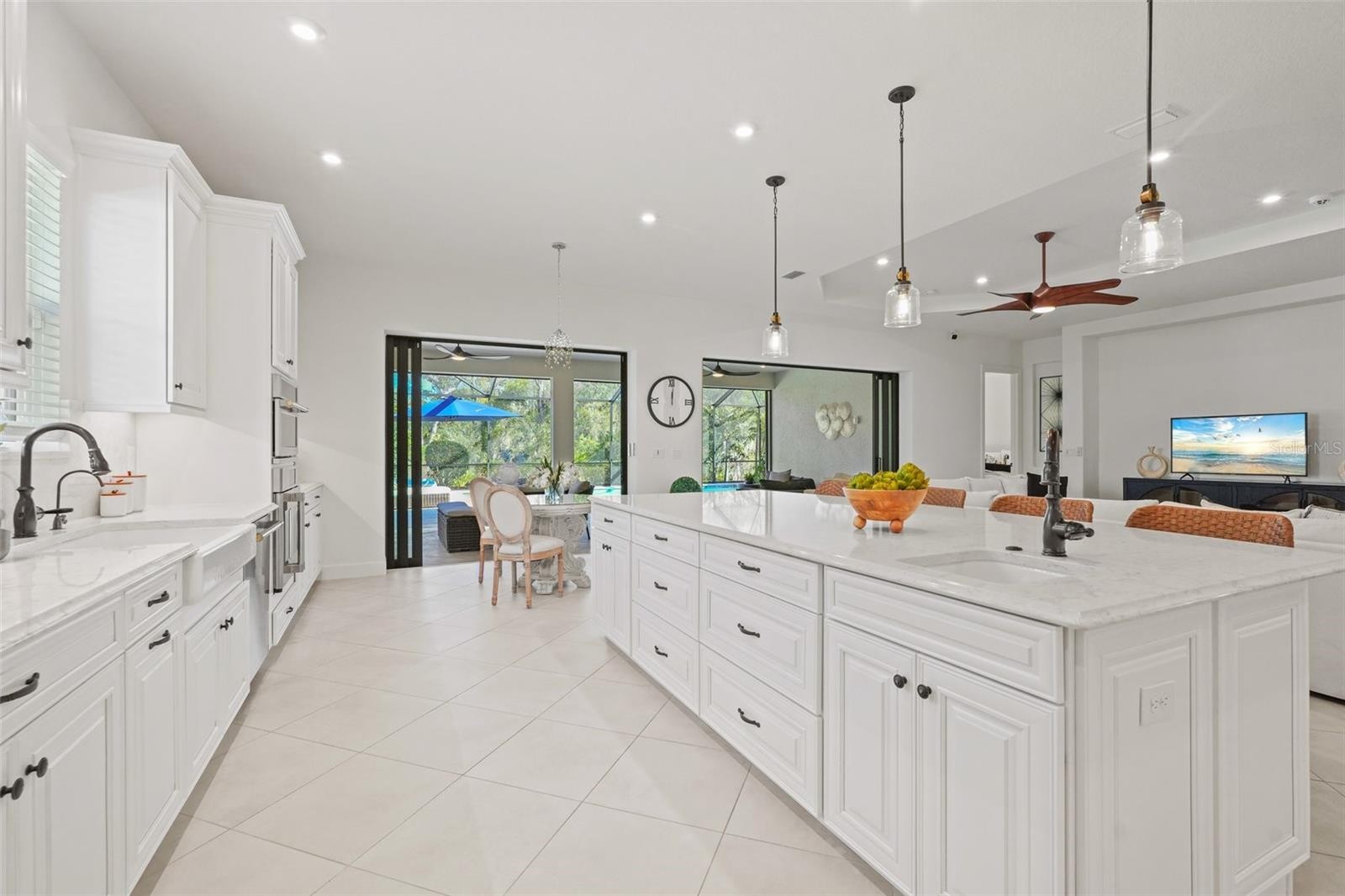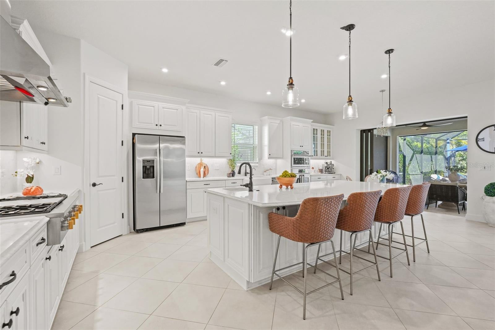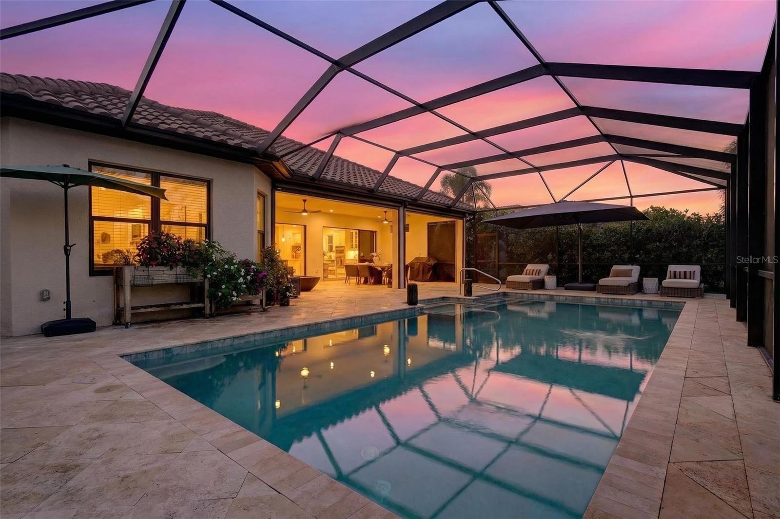 Welcome to this beautifully upgraded home, perfectly positioned on one of the most desirable preserve-view lots in the highly sought-after Esplanade at Azario. Designed for comfort, style, and effortless living, this popular "Pallazzio" furnished residence features an expansive open layout with 3 spacious bedrooms, 3 full designer baths, and a versatile den ideal for an office, gallery, reading room, or additional guest space. The chef’s kitchen is a standout with gleaming quartz countertops and backsplash, high-end GE appliances, a natural gas range, and built-in water filtration—an ideal setting for both everyday cooking and entertaining. Additional enhancements include smart-home technology, a custom security system, impact-resistant windows, and electronic hurricane screens for peace of mind. Step outside to your private retreat, highlighted by an oversized heated saltwater pool and spa— one of the largest in Azario—surrounded by tropical landscaping for total privacy. The extended lanai features cooling fans, pre-plumbing for a summer kitchen, and a gas fire pit, creating the perfect setting for relaxing or hosting friends year-round. The seller is offering a $40K credit towards finishing the summer kitchen and/or a rate buy-down for the buyer. While this home does not include a golf membership, residents enjoy full access to Azario’s resort-style amenities: pool and Bahama Bar, fitness and wellness center, spa, tennis, pickleball, culinary center, and vibrant country club social scene. This exceptional home offers a rare blend of beauty, privacy, and easy living—move-in ready and waiting for you.
