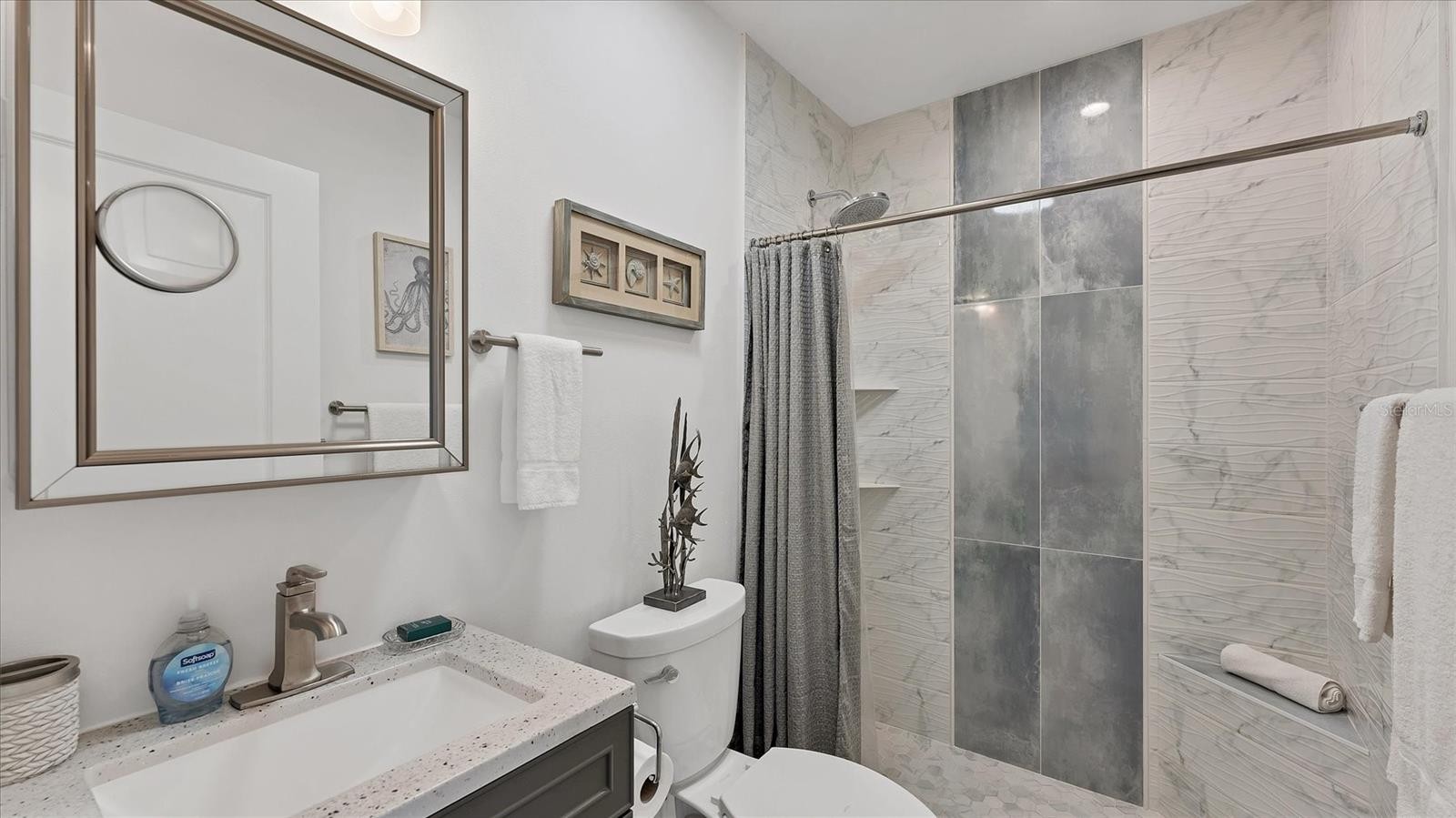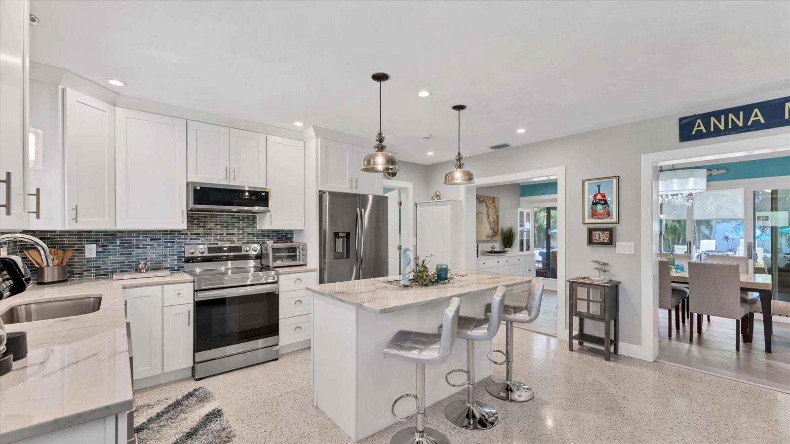 Location! Location! Location! Come Visit…Fall in Love with luxury beach living at it’s finest in this amazing, turnkey furnished, completely and beautifully remodeled 3 bedroom, 3 bathroom resort like pool home with lush island tropical landscaping. This exquisite cottage is nestled on a quiet palm tree lined street, just north of Pine Avenue, in the highly desirable city of Anna Maria, only three houses from the Bay Beach and City Pier!! This is a wonderful investment opportunity, currently showcased as a vacation rental, but could easily be enjoyed as a primary residence or secondary home for our welcomed “snow birds.” This open~ airy~ split floor plan effortlessly combines the seamless living areas of the kitchen, living room, and dining rooms. The updated, beautifully appointed kitchen is sure to impress even the most discerning chef, featuring coastal shaker wood cabinets, glass tile backsplash, stainless appliances, quartzite counter tops, and spacious island with ample seating and storage, illuminated by the beautiful glass pendant lighting above. The stunning formal dining room, with it’s gorgeous, expansive 21 ft sliding glass impact doors overlook the extremely spacious screened lanai and the breathtaking views of the spectacular resort-like pool~spa oasis. Enjoy abundant seating in the spacious living room with sleeper sofa, while watching your favorite movie on the large screen TV above the beautiful electric fireplace. After an enjoyable day at the beach or dinner at one of the many wonderful island restaurants, retreat to the serene primary king en-suite with walk-in shower. The second bedroom offers plenty of space with two twin beds. Impressive third bedroom presents a secondary king en-suite with vaulted ceilings, walk-in shower, private entrance, and is on the alternate side of the home for welcomed privacy. Indulge in the epitome of aquatic luxury with a meticulously crafted pool, complete with state-of-the-art heating and cooling systems, fiber optics, offering a symphony of color and ambiance. The tropical pool oasis is adorned by the captivating centerpiece, the hand crafted giant sea turtle sculpture that was painted by a local artist and previously hung in Mote Marine Aquarium in Sarasota. Enjoy peace of mind with new Hurricane Impact Windows (2022), new Hurricane Impact sliding glass doors (2025), new electrical wiring updated (2025), all new plumbing with new drain lines to the sewer as well as new supply lines (2022), newly built saltwater pool with pebble tech surface-heated and cooled with fiber optic lighting (2023), pool safety alarms (2023), new interior painting (2025), exterior painting (2022), outdoor shower, new landscaping (2023), new A/C (2025), new metal roof (2025)… too many updates to list! Extensive updates list available upon request. Enjoy all that Anna Maria has to provide with it’s nearby City Pier, beautiful world famous beaches, swimming, boating, fishing, abundant island boutiques and shops, plus wonderful island restaurants for your dining pleasure. Enjoy watching the enticing virtual tour and call today!!
