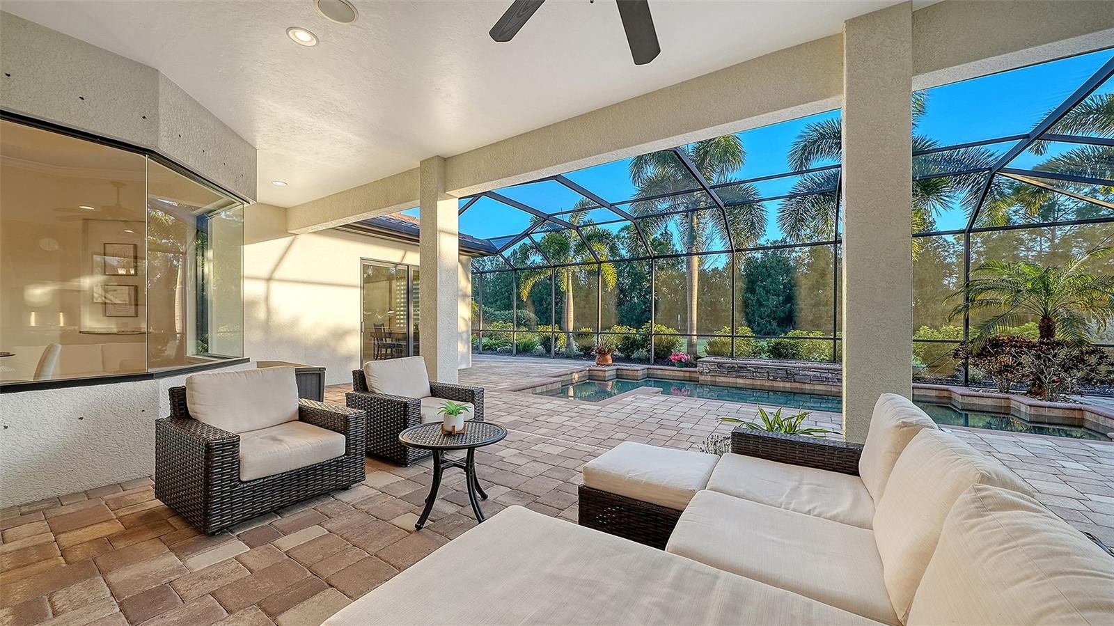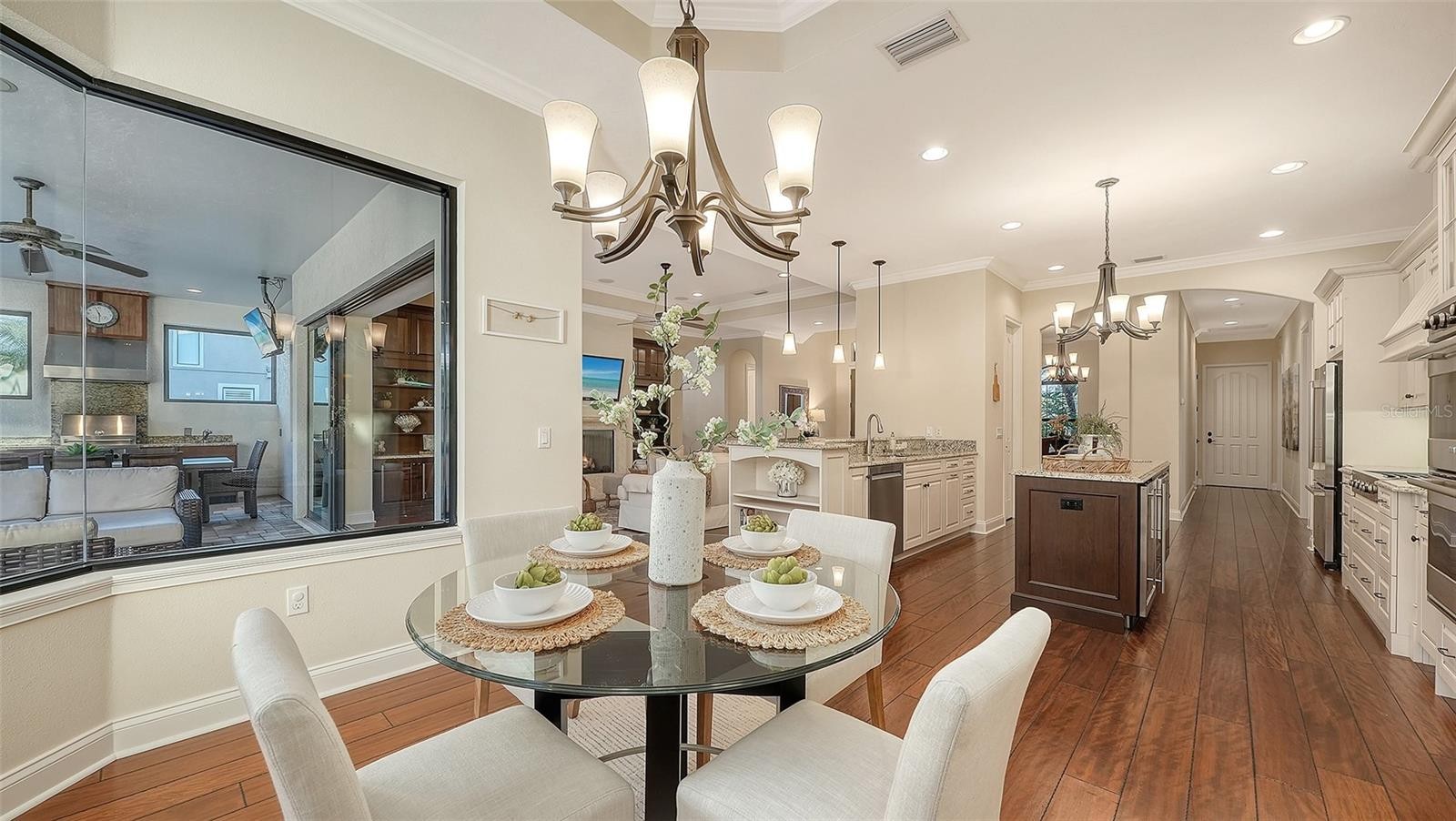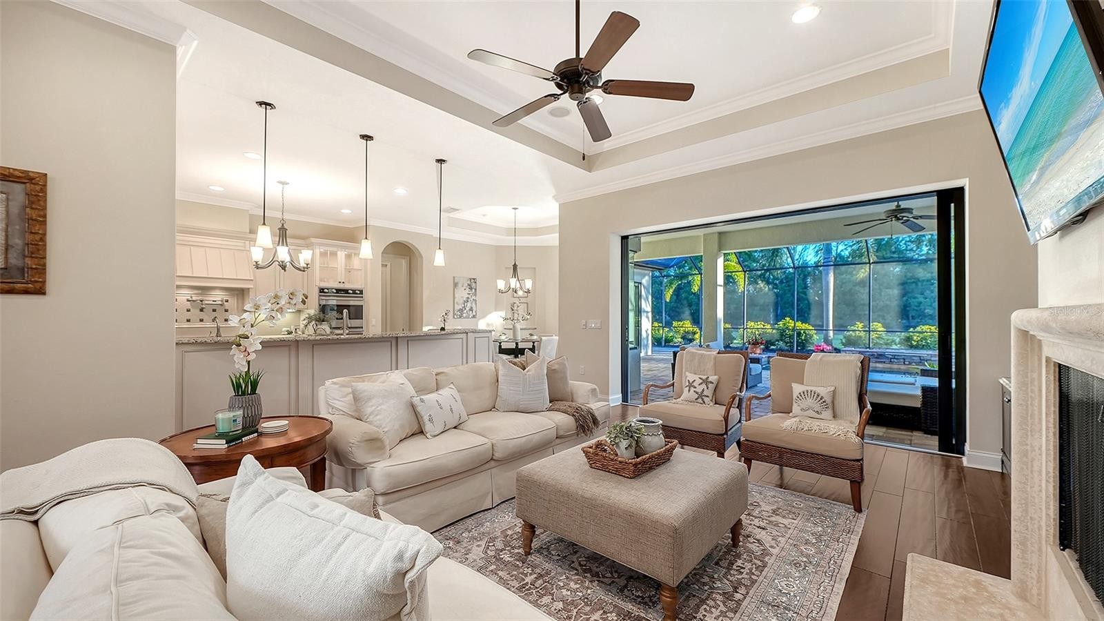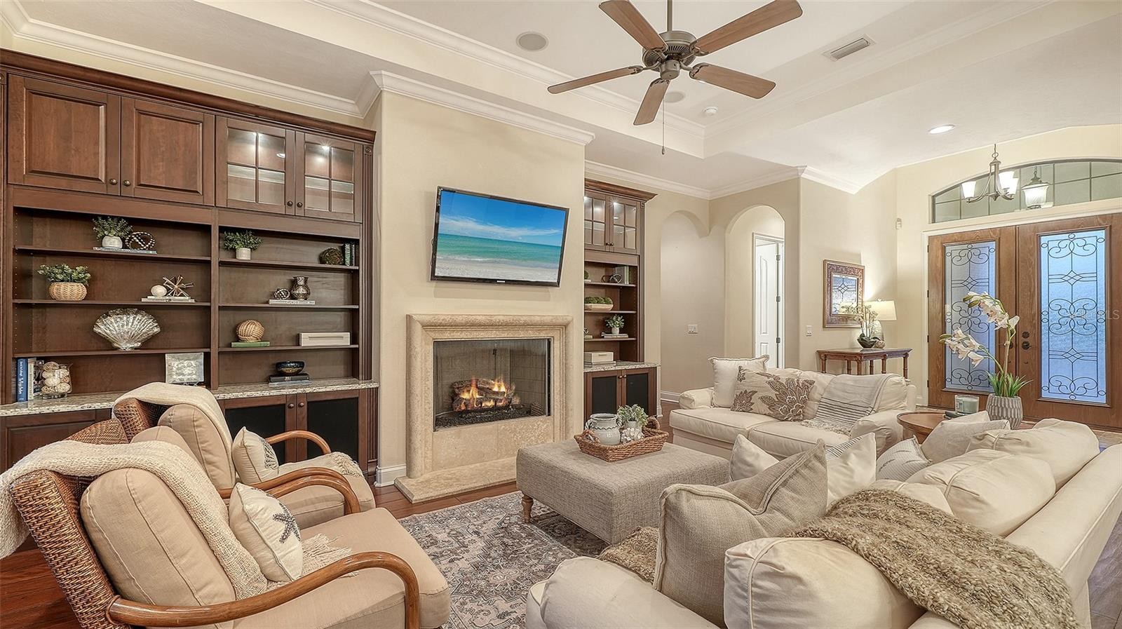 Perfectly positioned on a spacious estate homesite behind the gates of Country Club East, this custom residence blends timeless elegance with effortless Florida living. From the moment you step through the French doors, you’re welcomed by an airy great room floor plan highlighted by a striking stone fireplace and disappearing sliders that seamlessly connect indoor and outdoor spaces. Spanning over 3,300 square feet, the home showcases refined architectural details including rich engineered wood flooring, extensive crown molding, solid core interior doors, designer lighting, and thoughtful custom finishes throughout. The chef’s kitchen is both beautiful and functional, featuring Brookhaven wood cabinetry, Viking double ovens, cooktop and refrigerator, pot filler, a large center island with prep sink, breakfast bar seating, and a built-in wine cooler. The private primary retreat offers a relaxing escape with tray ceiling, sliders to the lanai, oversized custom walk-in closets, and a spa-inspired bath complete with dual vanities, granite countertops, a soaking tub and walk-in shower. The main level also includes three additional bedrooms and two full baths, while upstairs you’ll find a flexible office or fifth bedroom with its own bath, plus an expansive bonus room with wet bar, wood floors, and disappearing sliders leading to a large screened lanai overlooking the private backyard. Outdoor living shines with a PebbleTec saltwater pool, generous covered entertaining areas, and a fully equipped outdoor kitchen with Viking grill and refrigerator — perfect for both quiet evenings and lively gatherings. Built with hurricane impact windows and doors throughout, this exceptional home offers comfort, style, and peace of mind. Residents enjoy the sought-after lifestyle of Country Club East, featuring gated security, scenic surroundings, and optional golf and social memberships. All of this is set within Lakewood Ranch, where miles of trails, vibrant town centers, top-rated schools, dining, shopping, parks, and year-round events create one of the most desirable and active living experiences in the country.