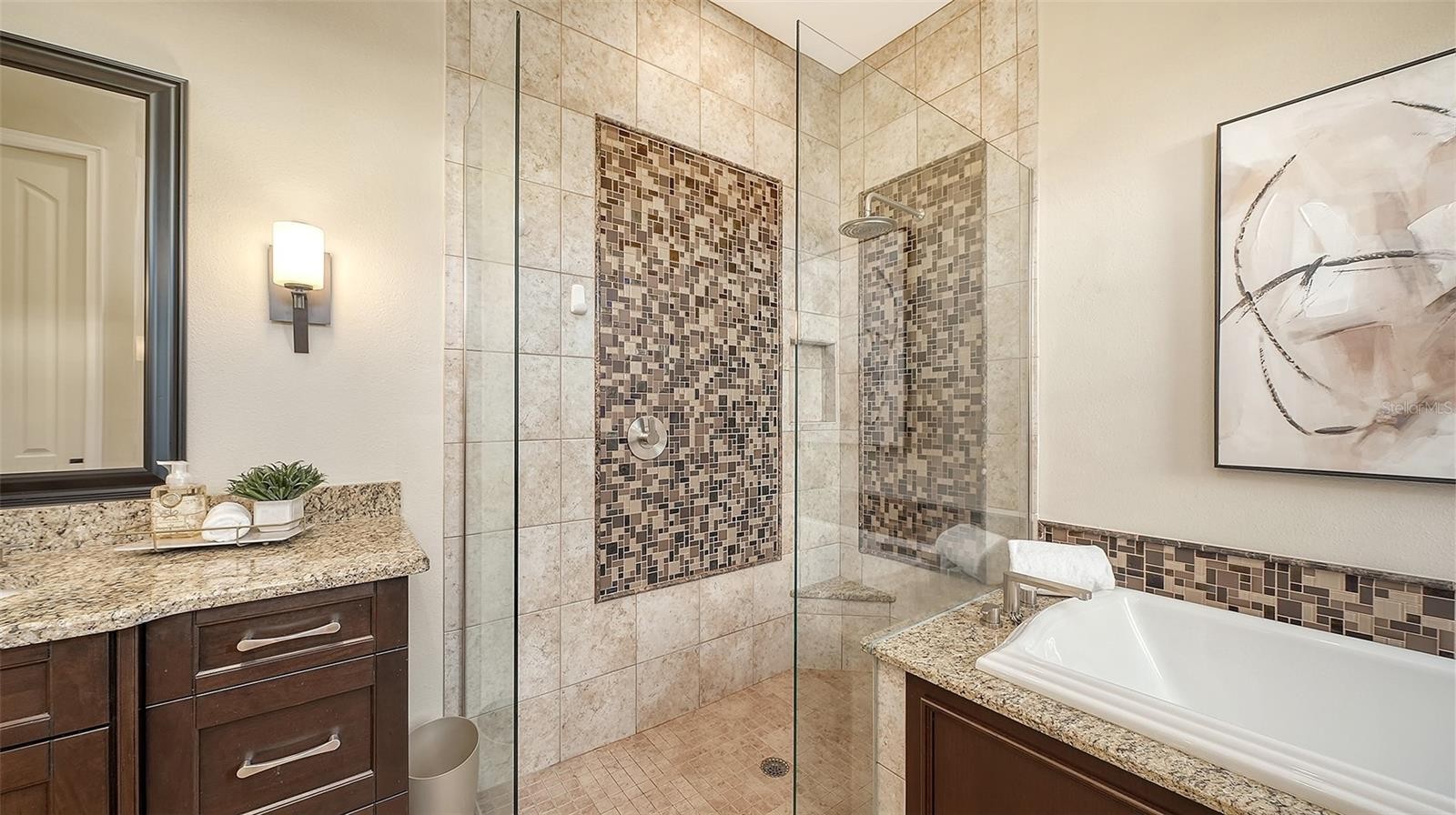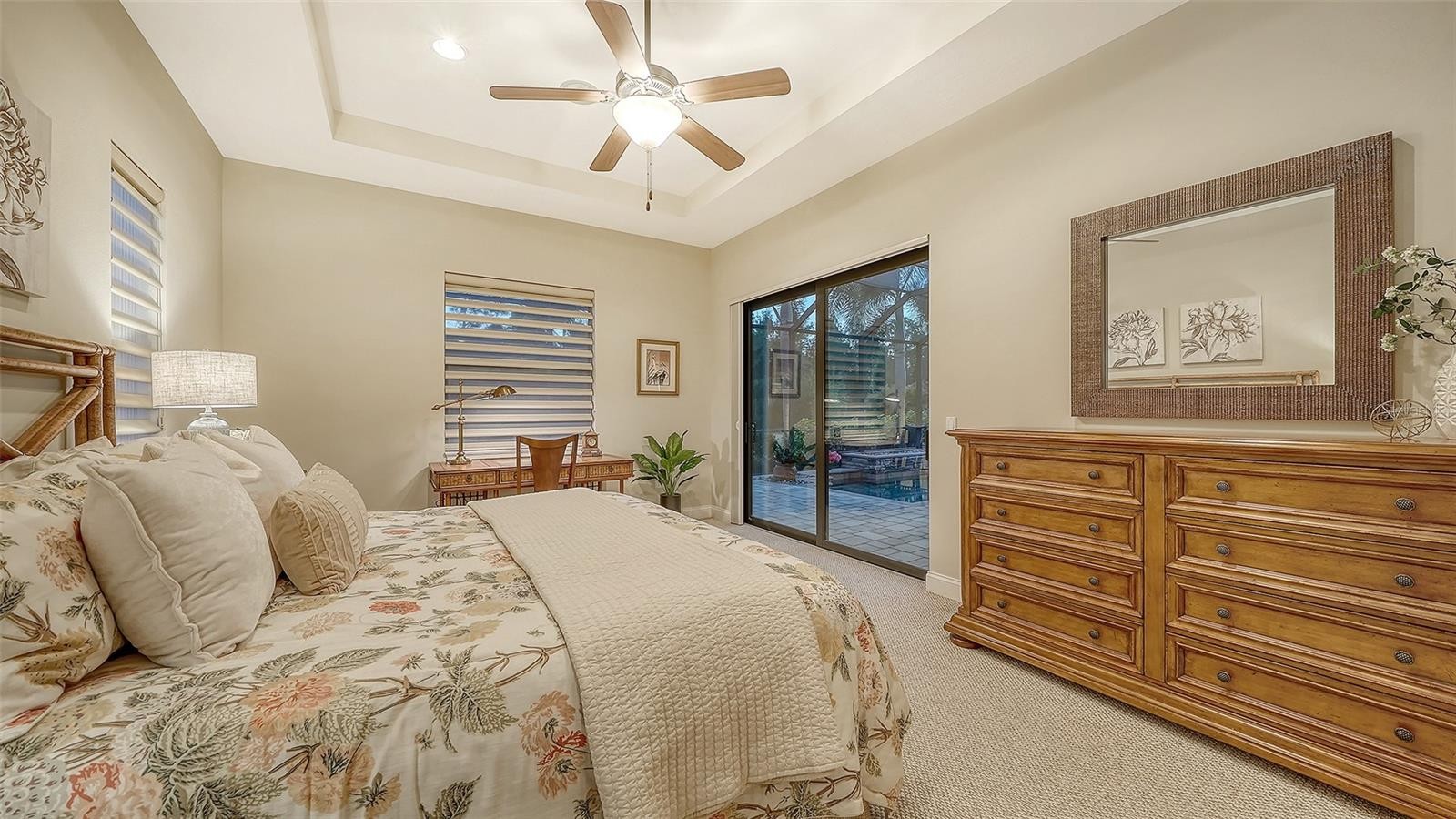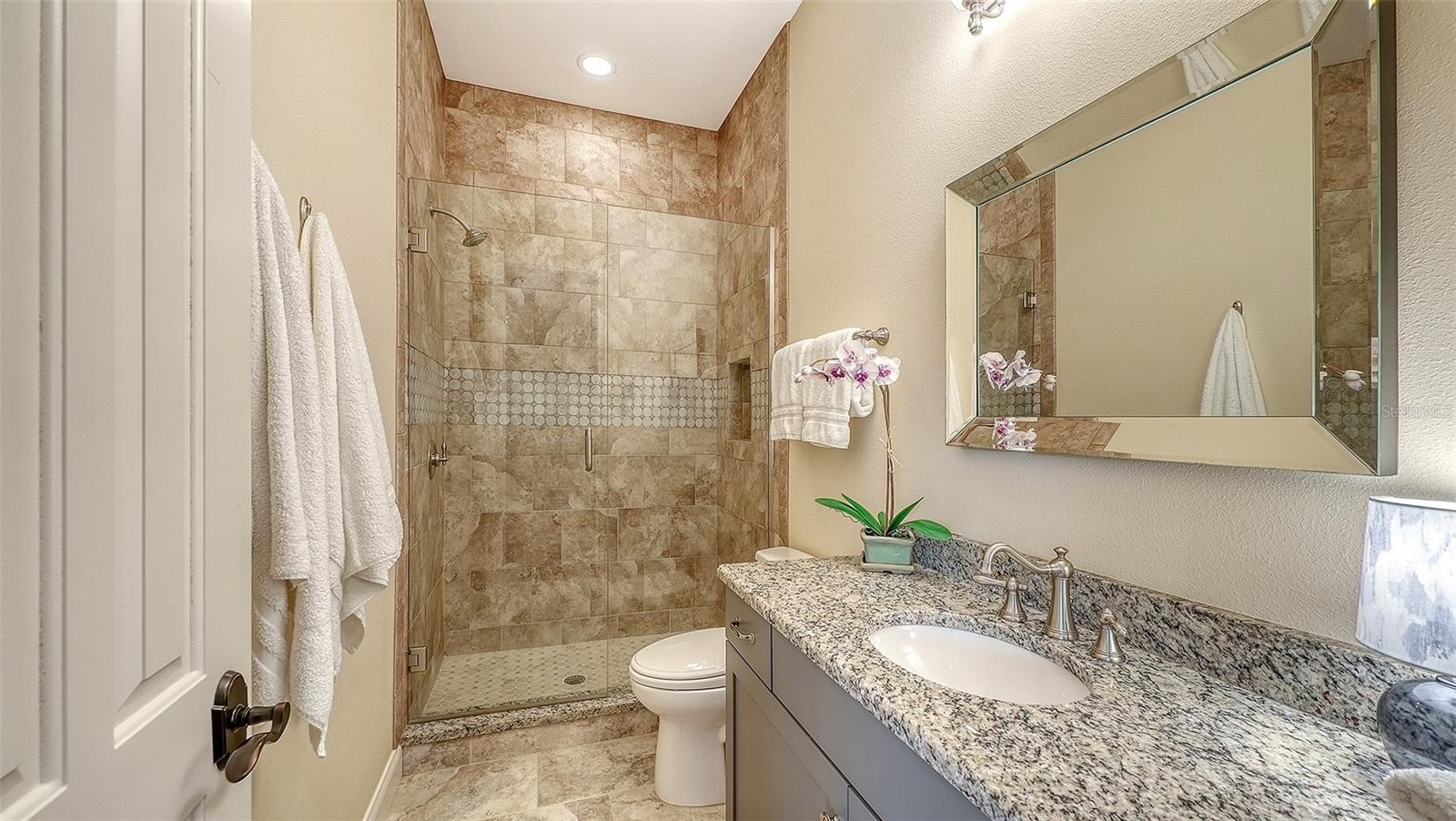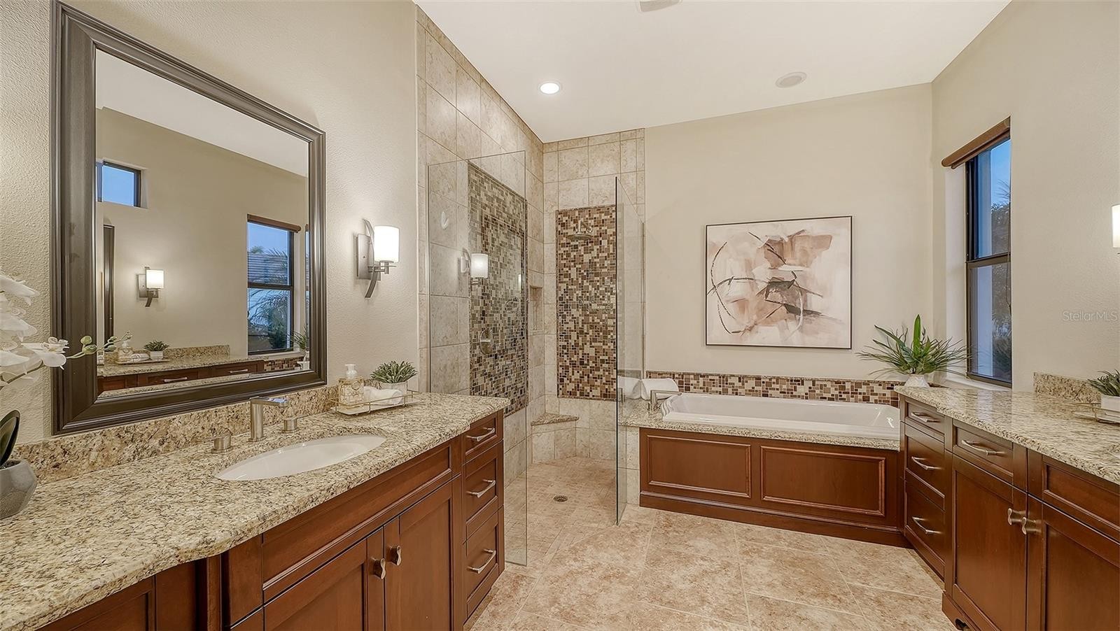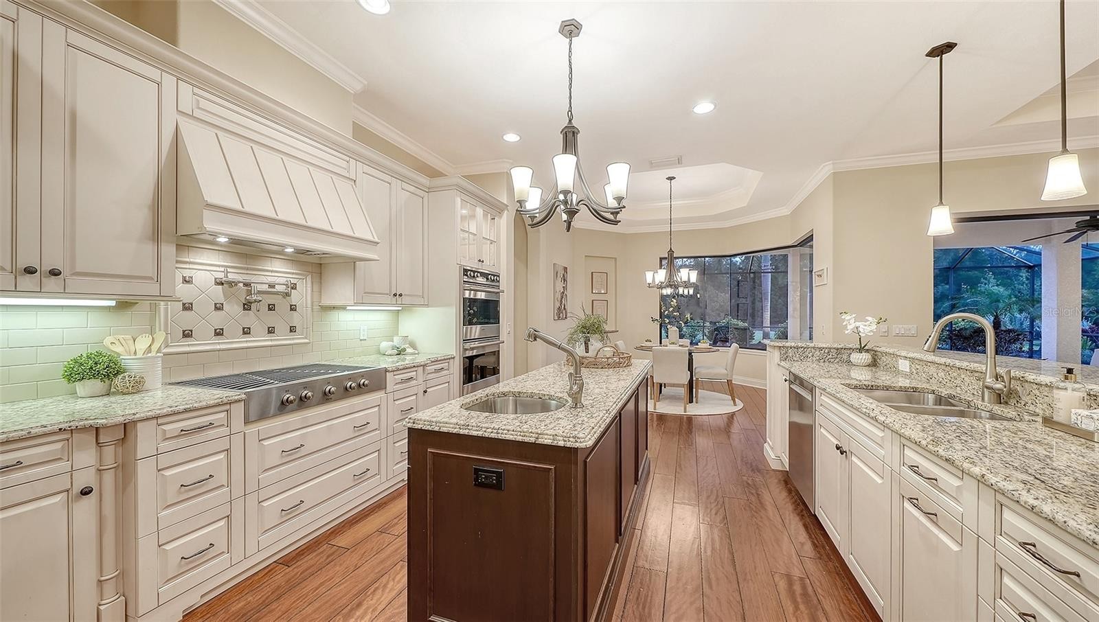 Perfectly positioned on a spacious estate homesite behind the gates of Country Club East, this custom residence blends timeless elegance with effortless Florida living. From the moment you step through the French doors, you’re welcomed by an airy great room floor plan highlighted by a striking stone fireplace and disappearing sliders that seamlessly connect indoor and outdoor spaces. Spanning over 3,300 square feet, the home showcases refined architectural details including rich engineered wood flooring, extensive crown molding, solid core interior doors, designer lighting, and thoughtful custom finishes throughout. The chef’s kitchen is both beautiful and functional, featuring Brookhaven wood cabinetry, Viking double ovens, cooktop and refrigerator, pot filler, a large center island with prep sink, breakfast bar seating, and a built-in wine cooler. The private primary retreat offers a relaxing escape with tray ceiling, sliders to the lanai, oversized custom walk-in closets, and a spa-inspired bath complete with dual vanities, granite countertops, a soaking tub and walk-in shower. The main level also includes three additional bedrooms and two full baths, while upstairs you’ll find a flexible office or fifth bedroom with its own bath, plus an expansive bonus room with wet bar, wood floors, and disappearing sliders leading to a large screened lanai overlooking the private backyard. Outdoor living shines with a PebbleTec saltwater pool, generous covered entertaining areas, and a fully equipped outdoor kitchen with Viking grill and refrigerator — perfect for both quiet evenings and lively gatherings. Built with hurricane impact windows and doors throughout, this exceptional home offers comfort, style, and peace of mind. Residents enjoy the sought-after lifestyle of Country Club East, featuring gated security, scenic surroundings, and optional golf and social memberships. All of this is set within Lakewood Ranch, where miles of trails, vibrant town centers, top-rated schools, dining, shopping, parks, and year-round events create one of the most desirable and active living experiences in the country.
