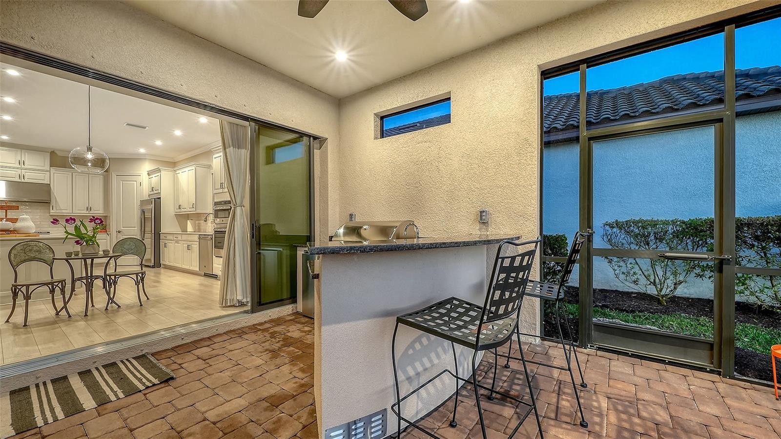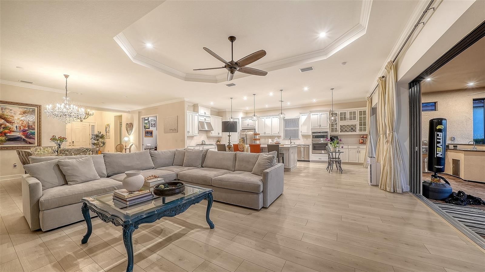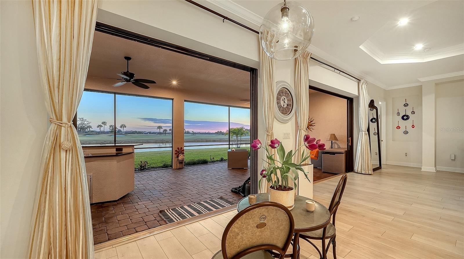 Most sought after golf-deeded Pallazio in Esplanade Azario with the rare and stunning lake and golf views! This home is being offered furnished (some exclusions apply, and yes that is negotiable). Before entering the home, you will be wowed by the gorgeous outdoor landscaping that warms the heart. As you enter this beautiful three-bedroom, three-bath-plus-den home, you will notice all exquisite custom designs in this open floor plan. Beautiful laminate flooring, plantation shutters throughout, tray ceilings and crown molding, designer lighting and fixtures, gourmet kitchen with quartz countertops and soft-close everything. The primary en suite has a lovely sitting area and spa-like bath adjacent to a custom built-in closet. There is a whole-house water filtration and softener, security cameras front and back with home security system. For hurricane protection, there are accordion-style smart guard shutters and a MagnaTrack screen on the lanai. As for storage, the kitchen pantry and main closets have custom built-ins, and the epoxy-finished flooring in the extended garage has two hanging storage units. Go outside to view your personal piece of paradise with the southwest facing views of water and golf (16th hole). With an outdoor kitchen and expanded lanai, here you will experience the most beautiful, peaceful and private sunsets. If you desire a pool and spa, here is your blank canvas with the best backdrop and views awaiting your design. Esplanade at Azario offers world-class amenities including an 18-hole championship golf course, pro shop, culinary center, fitness center, full-service spa, six tennis courts, 16 pickleball courts, a resort-style pool, Bahama Bar & Restaurant, coffee shop and casual pizzeria. (CDD fee is included in annual tax amount.) Ideally near Sarasota’s finest dining, shopping and award-winning Gulf Coast beaches, this home captures the essence of luxury, leisure and lifestyle.