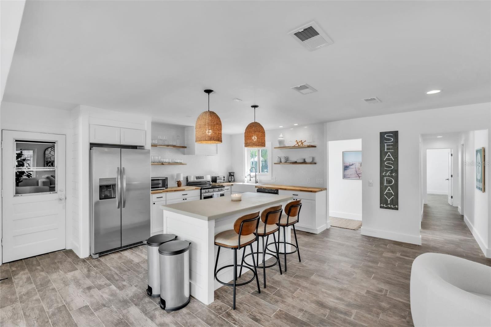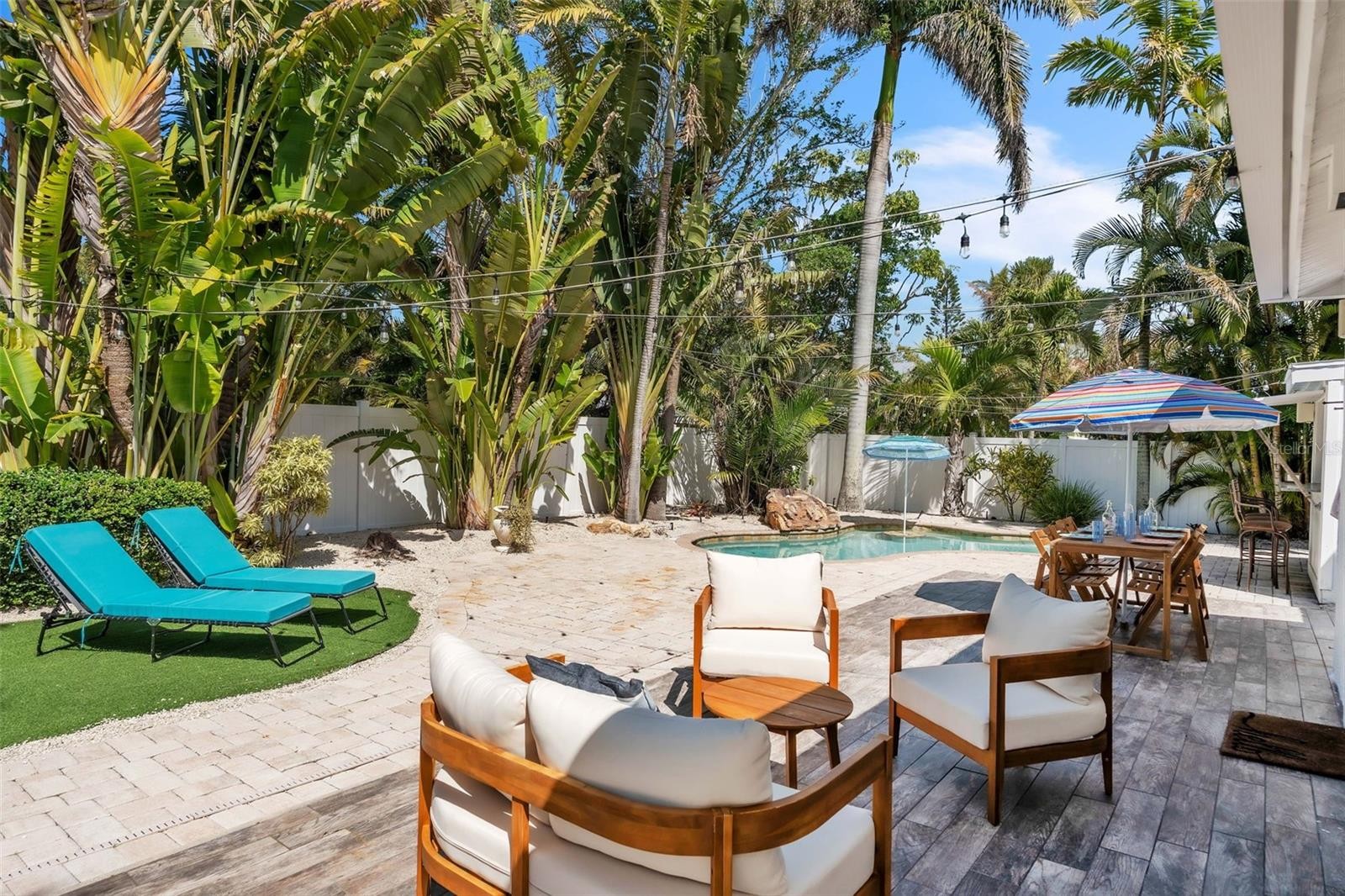 Your private island retreat awaits in this exquisitely renovated coastal cottage, situated on an oversized lot North of Pine Avenue in the city of Anna Maria. This solid concrete block, ground level residence offers 3 bedrooms and 2 bathrooms with a bright, open layout design that embodies refined island living. Inside, elegant ceramic tile flooring, hurricane impact windows, and expansive living spaces create an inviting yet sophisticated atmosphere. The spacious living room flows seamlessly into the great room, offering the perfect setting for both relaxed coastal living and stylish entertaining. The designer chef’s kitchen features beautifully refinished cabinetry, a classic subway tile backsplash, stainless steel appliances, and a chic breakfast bar for casual dining. The serene primary suite offers a private en-suite bath, while two additional guest bedrooms provide comfortable accommodations for family and visitors. An oversized two car garage adds both convenience and storage. Step outside to your secluded backyard sanctuary, where lush tropical landscaping surrounds a sparkling pool and private cabana. Artificial turf and thoughtfully placed LED landscape lighting create an ambiance perfect for evening gatherings or peaceful island nights. This exceptional property is part of a voluntary HOA providing access to six community boat docks with direct entry to the sparkling waters of Tampa Bay and the Gulf of Mexico. Just a short stroll away, you’ll find the pristine white sands of Bean Point, the boutiques and dining along Pine Avenue, the City Pier, the local farmer’s market, and the convenient island trolley. Experience the very best of Anna Maria Island living and schedule your showing today to claim your slice of paradise.