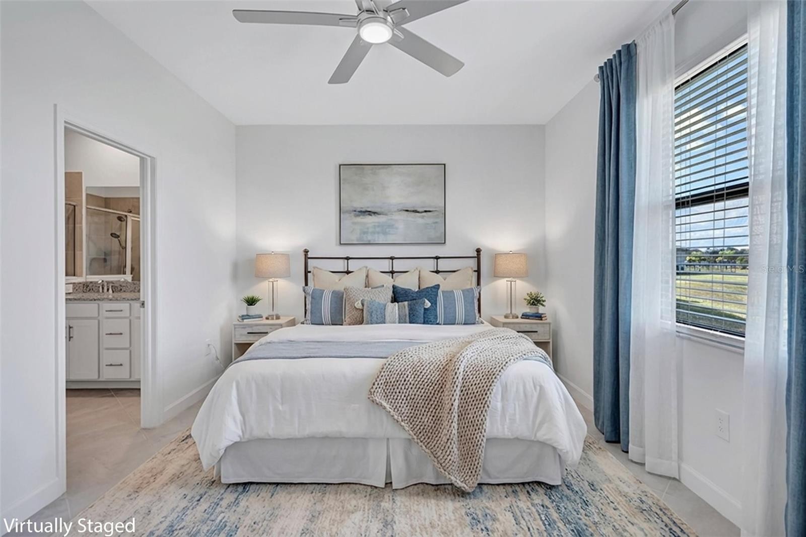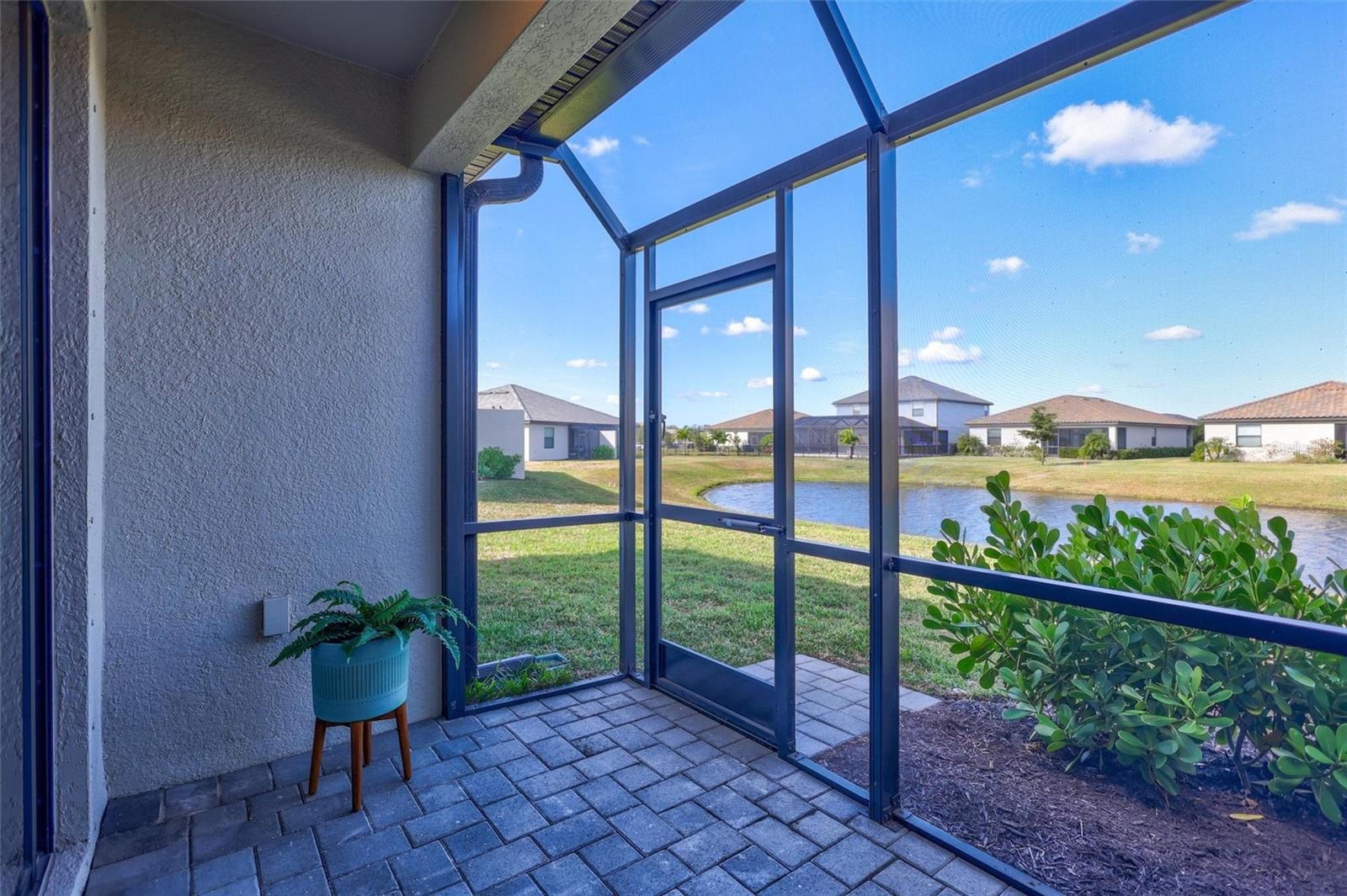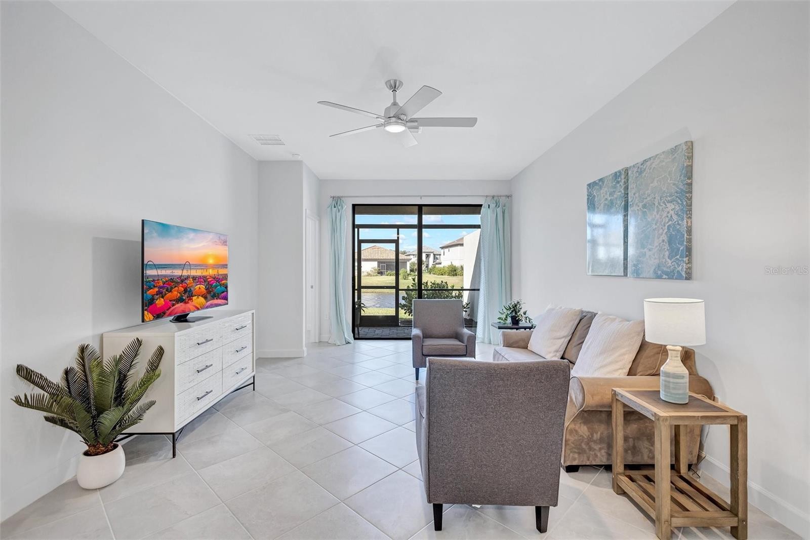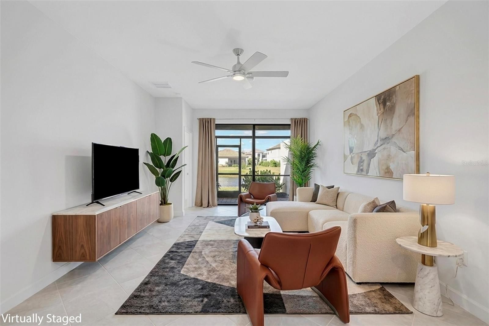 One or more photo(s) has been virtually staged. Never-Lived-In Waterfront Villa Loaded With Premium Upgrades. Move right into this beautifully furnished, newer villa in the highly desirable community of Lorraine Lakes in Lakewood Ranch. Situated on a peaceful, pie-shaped waterfront lot, this home has never been lived in and features extensive upgrades throughout—tile flooring in every room (no carpet), epoxy-coated garage flooring, tankless water heater, whole-house water filtration, remote-controlled fans, dimmer lighting in the bedrooms, professionally installed grab bars in both bathrooms and showers, dual shower heads in the primary bath, and a tile backsplash extended under the kitchen cabinets for a clean, custom look. Designed with an open-concept layout, the villa features a bright kitchen with all-new appliances and a gas cooktop, spacious living areas, and an enclosed lanai perfect for morning coffee or sunset relaxation. Residents enjoy world-class amenities, including a resort-style pool with food and beverage service, fitness centers, indoor basketball, pickleball, tennis, bocce, volleyball, miniature golf, a heated lap pool, a splash pad, an arcade, and a full-service restaurant and bar located within the clubhouse. Located in award-winning Lakewood Ranch, this home delivers maintenance-free living, flexible rental options (1-month minimum, up to 12 leases/year), and convenient access to everything the area has to showcase. A minimum restaurant spend applies and is easily met thanks to the exceptional on-site dining. Experience the ease, beauty, and vibrant lifestyle of Lorraine Lakes from the comfort of this stunning, never-lived-in villa.