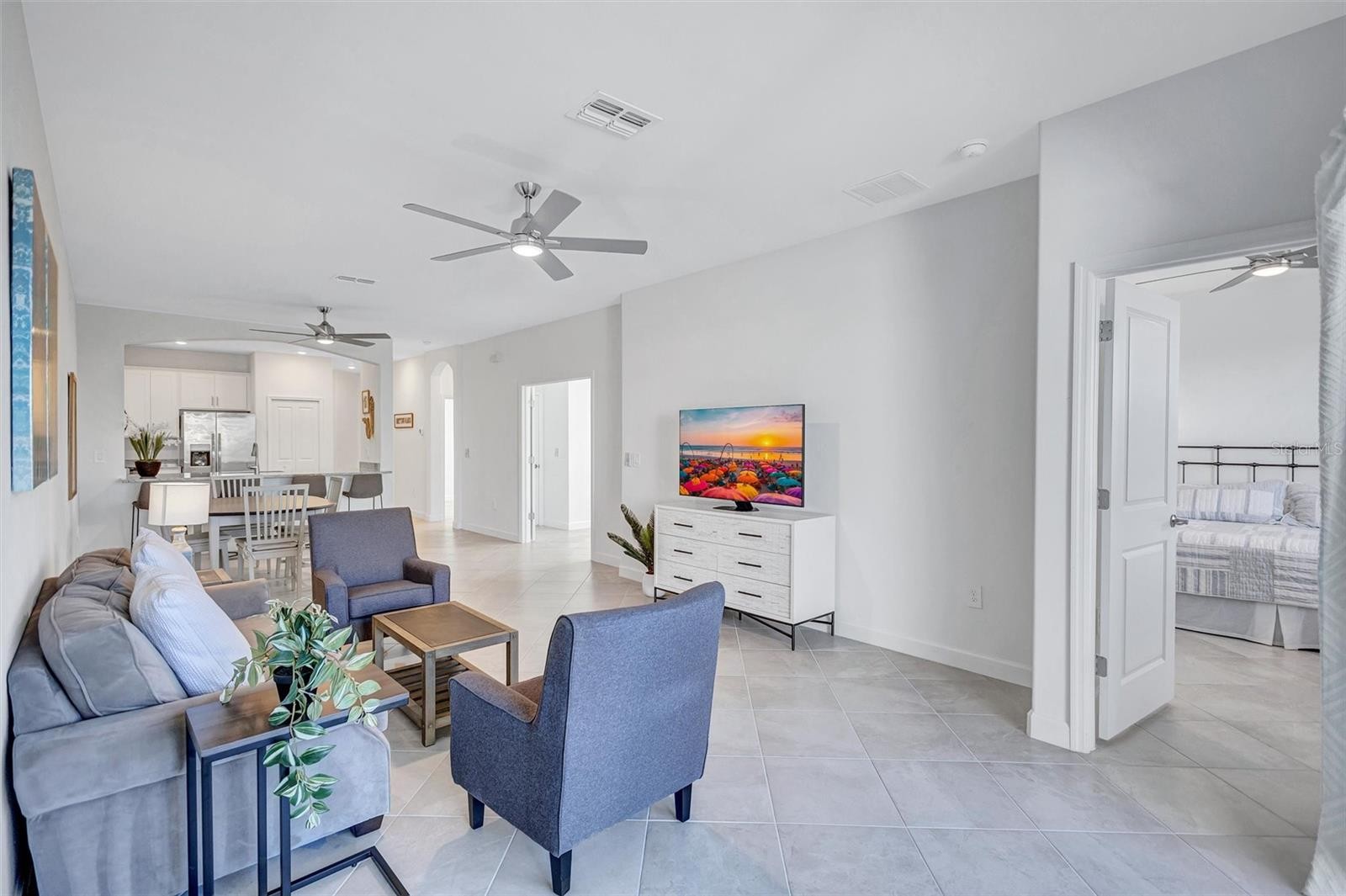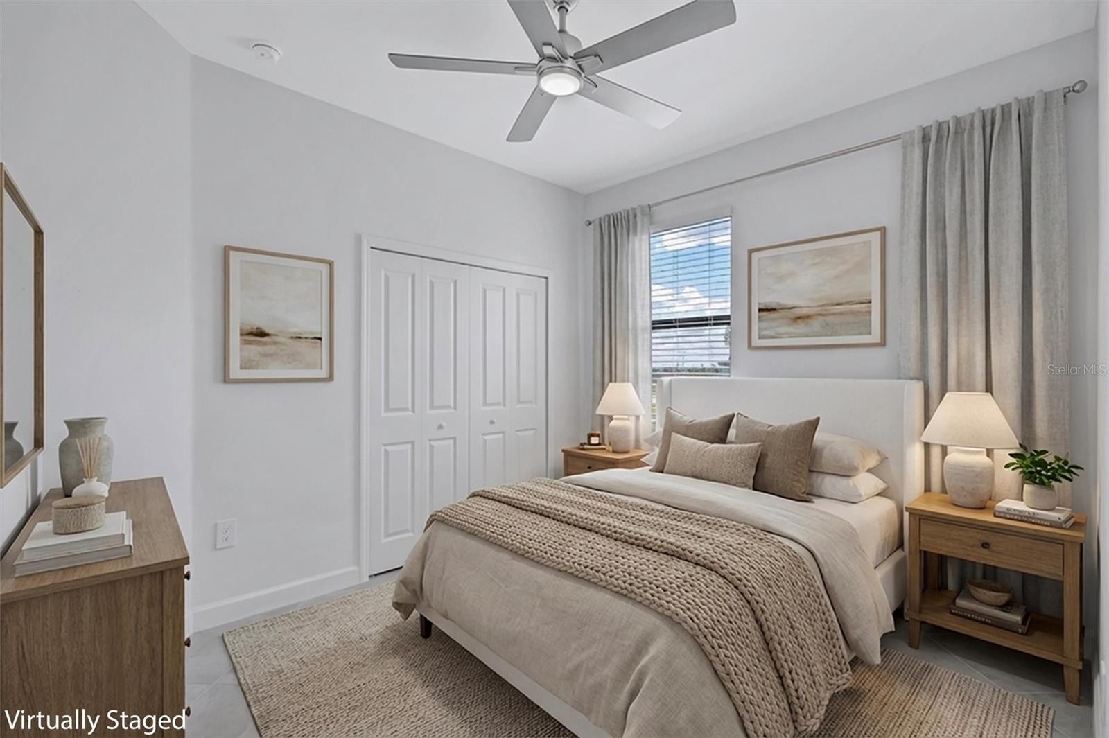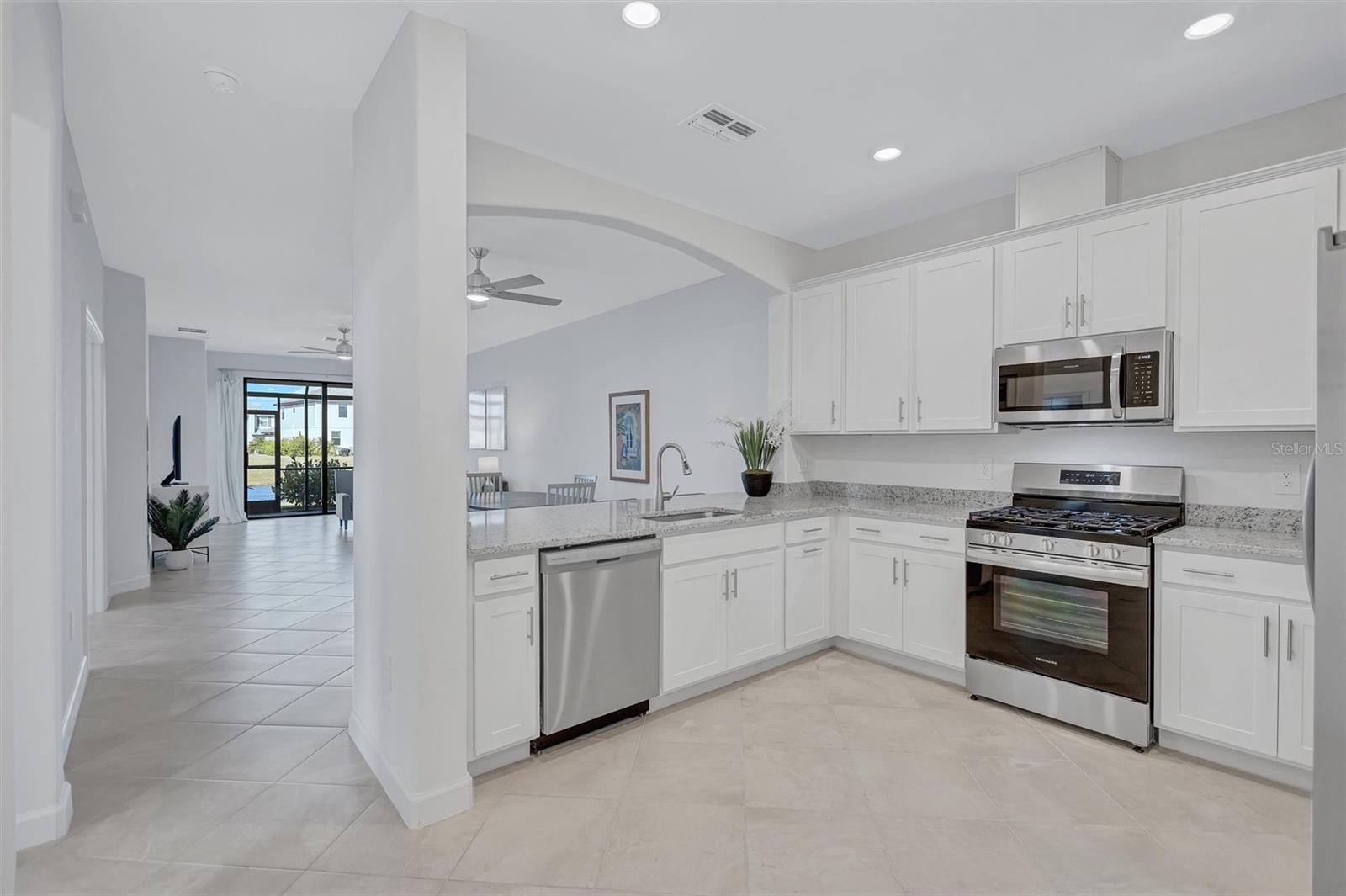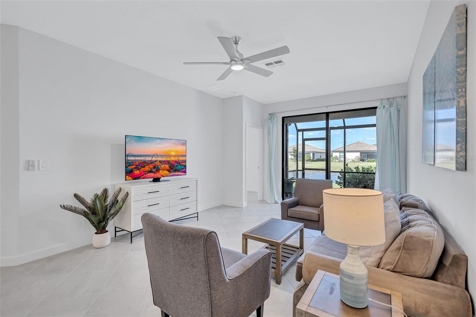 One or more photo(s) has been virtually staged. Never-Lived-In Waterfront Villa Loaded With Premium Upgrades. Move right into this beautifully furnished, newer villa in the highly desirable community of Lorraine Lakes in Lakewood Ranch. Situated on a peaceful, pie-shaped waterfront lot, this home has never been lived in and features extensive upgrades throughout—tile flooring in every room (no carpet), epoxy-coated garage flooring, tankless water heater, whole-house water filtration, remote-controlled fans, dimmer lighting in the bedrooms, professionally installed grab bars in both bathrooms and showers, dual shower heads in the primary bath, and a tile backsplash extended under the kitchen cabinets for a clean, custom look. Designed with an open-concept layout, the villa features a bright kitchen with all-new appliances and a gas cooktop, spacious living areas, and an enclosed lanai perfect for morning coffee or sunset relaxation. Residents enjoy world-class amenities, including a resort-style pool with food and beverage service, fitness centers, indoor basketball, pickleball, tennis, bocce, volleyball, miniature golf, a heated lap pool, a splash pad, an arcade, and a full-service restaurant and bar located within the clubhouse. Located in award-winning Lakewood Ranch, this home delivers maintenance-free living, flexible rental options (1-month minimum, up to 12 leases/year), and convenient access to everything the area has to showcase. A minimum restaurant spend applies and is easily met thanks to the exceptional on-site dining. Experience the ease, beauty, and vibrant lifestyle of Lorraine Lakes from the comfort of this stunning, never-lived-in villa.