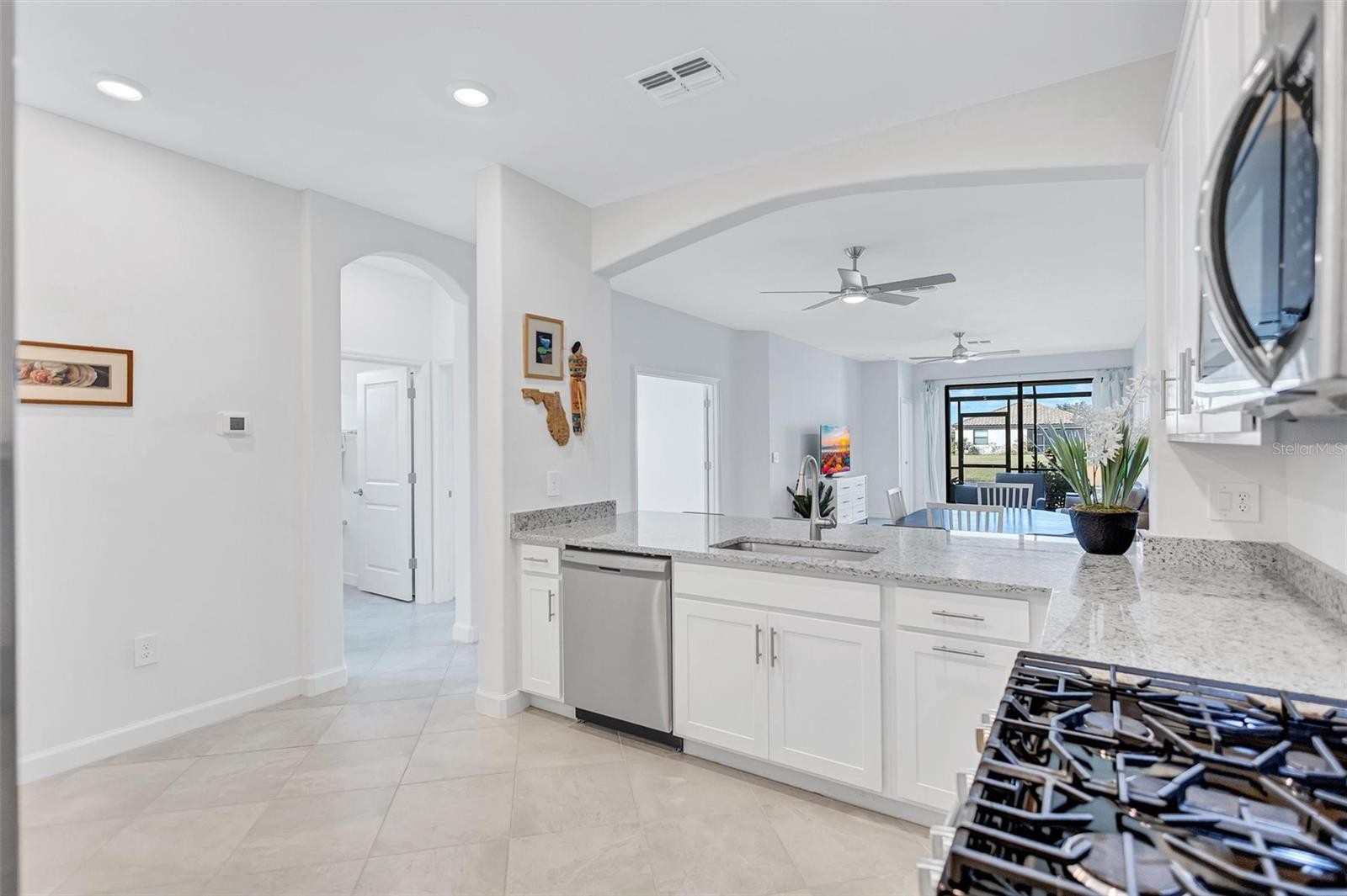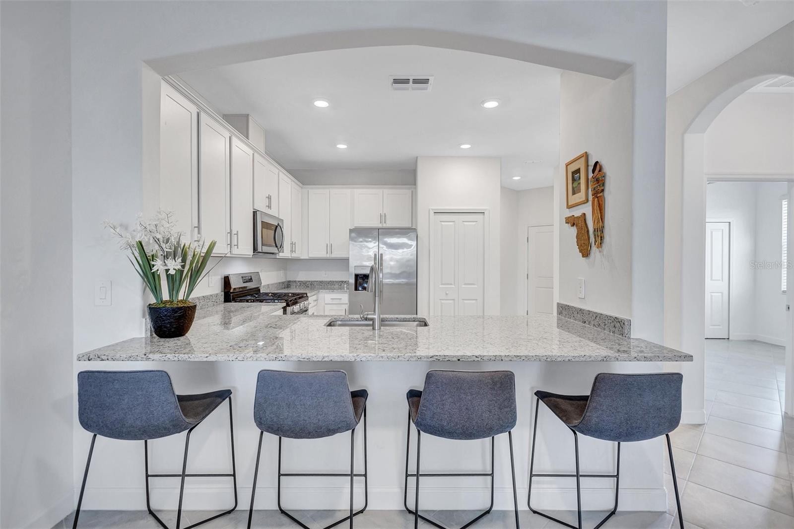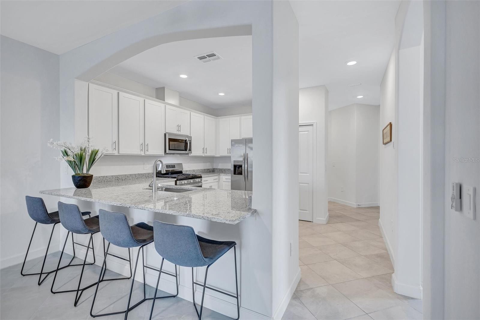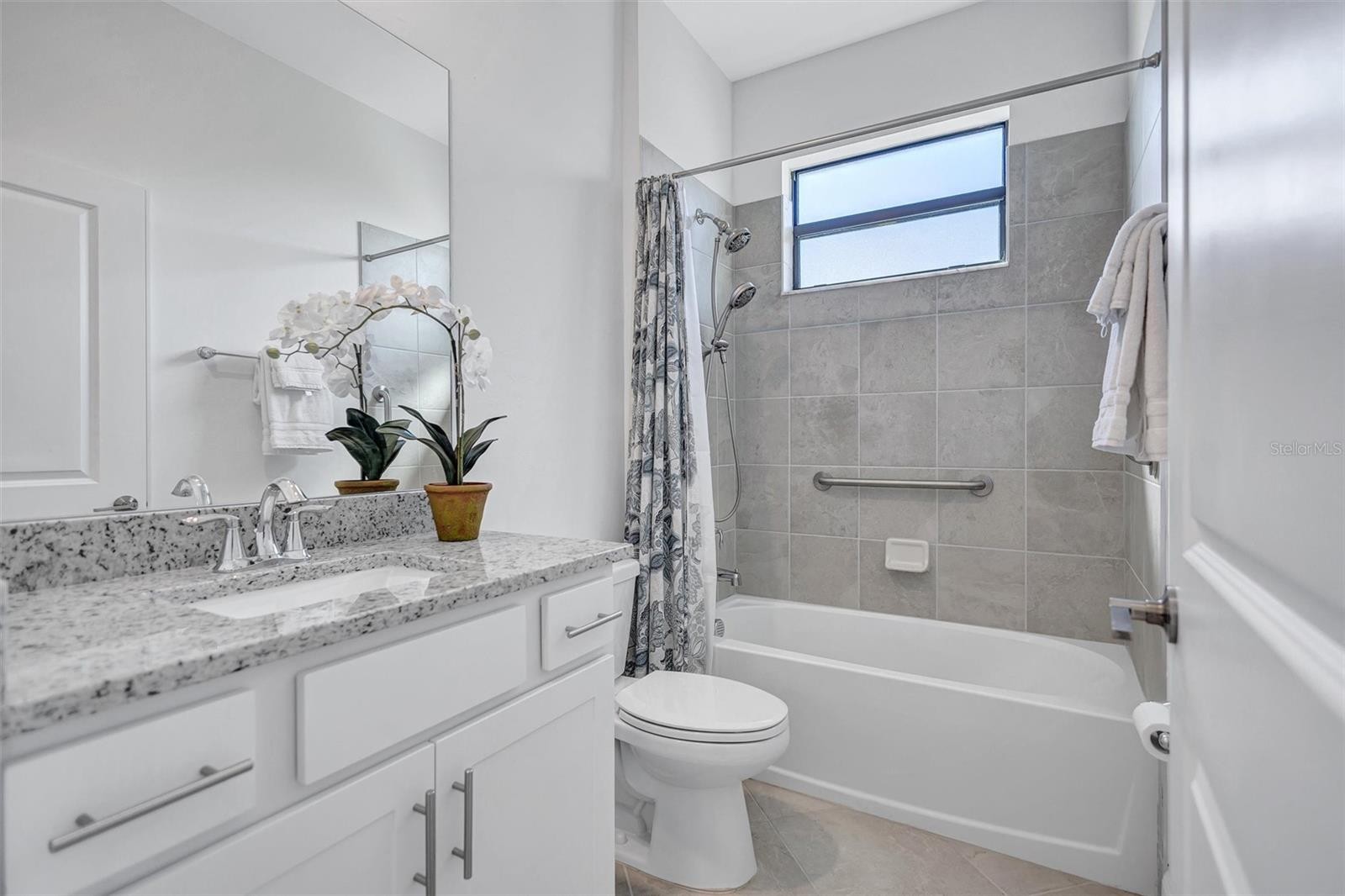 One or more photo(s) has been virtually staged. Never-Lived-In Waterfront Villa Loaded With Premium Upgrades. Move right into this beautifully furnished, newer villa in the highly desirable community of Lorraine Lakes in Lakewood Ranch. Situated on a peaceful, pie-shaped waterfront lot, this home has never been lived in and features extensive upgrades throughout—tile flooring in every room (no carpet), epoxy-coated garage flooring, tankless water heater, whole-house water filtration, remote-controlled fans, dimmer lighting in the bedrooms, professionally installed grab bars in both bathrooms and showers, dual shower heads in the primary bath, and a tile backsplash extended under the kitchen cabinets for a clean, custom look. Designed with an open-concept layout, the villa features a bright kitchen with all-new appliances and a gas cooktop, spacious living areas, and an enclosed lanai perfect for morning coffee or sunset relaxation. Residents enjoy world-class amenities, including a resort-style pool with food and beverage service, fitness centers, indoor basketball, pickleball, tennis, bocce, volleyball, miniature golf, a heated lap pool, a splash pad, an arcade, and a full-service restaurant and bar located within the clubhouse. Located in award-winning Lakewood Ranch, this home delivers maintenance-free living, flexible rental options (1-month minimum, up to 12 leases/year), and convenient access to everything the area has to showcase. A minimum restaurant spend applies and is easily met thanks to the exceptional on-site dining. Experience the ease, beauty, and vibrant lifestyle of Lorraine Lakes from the comfort of this stunning, never-lived-in villa.