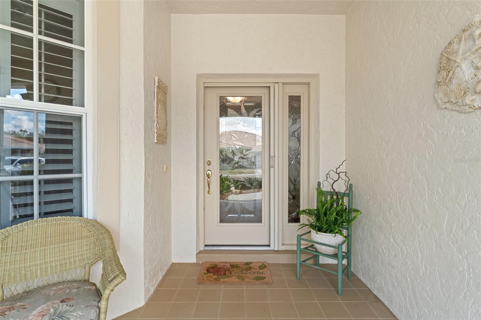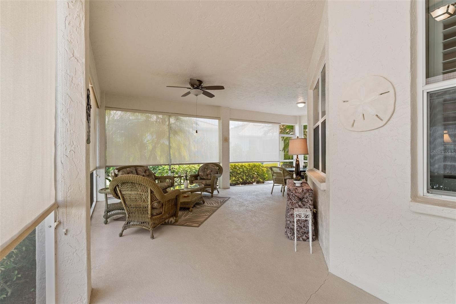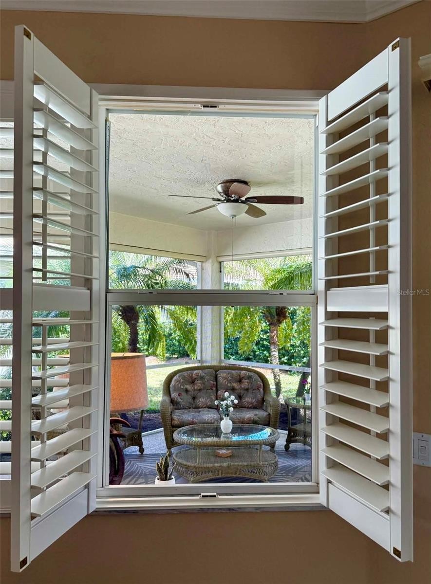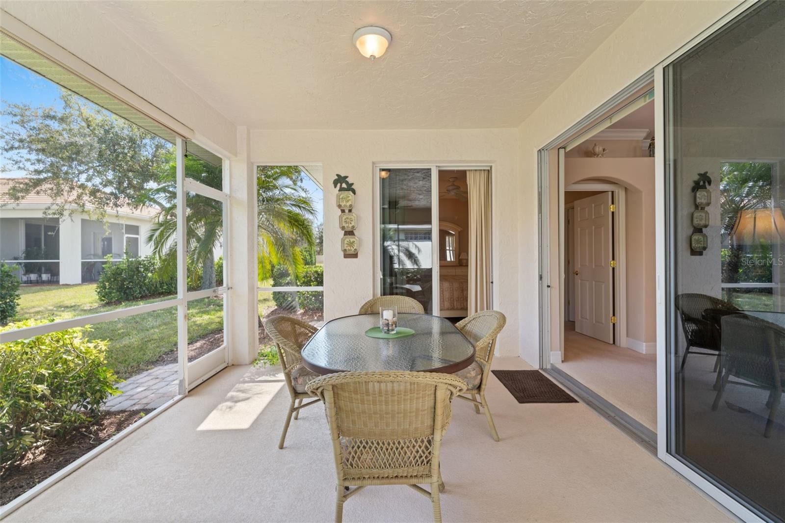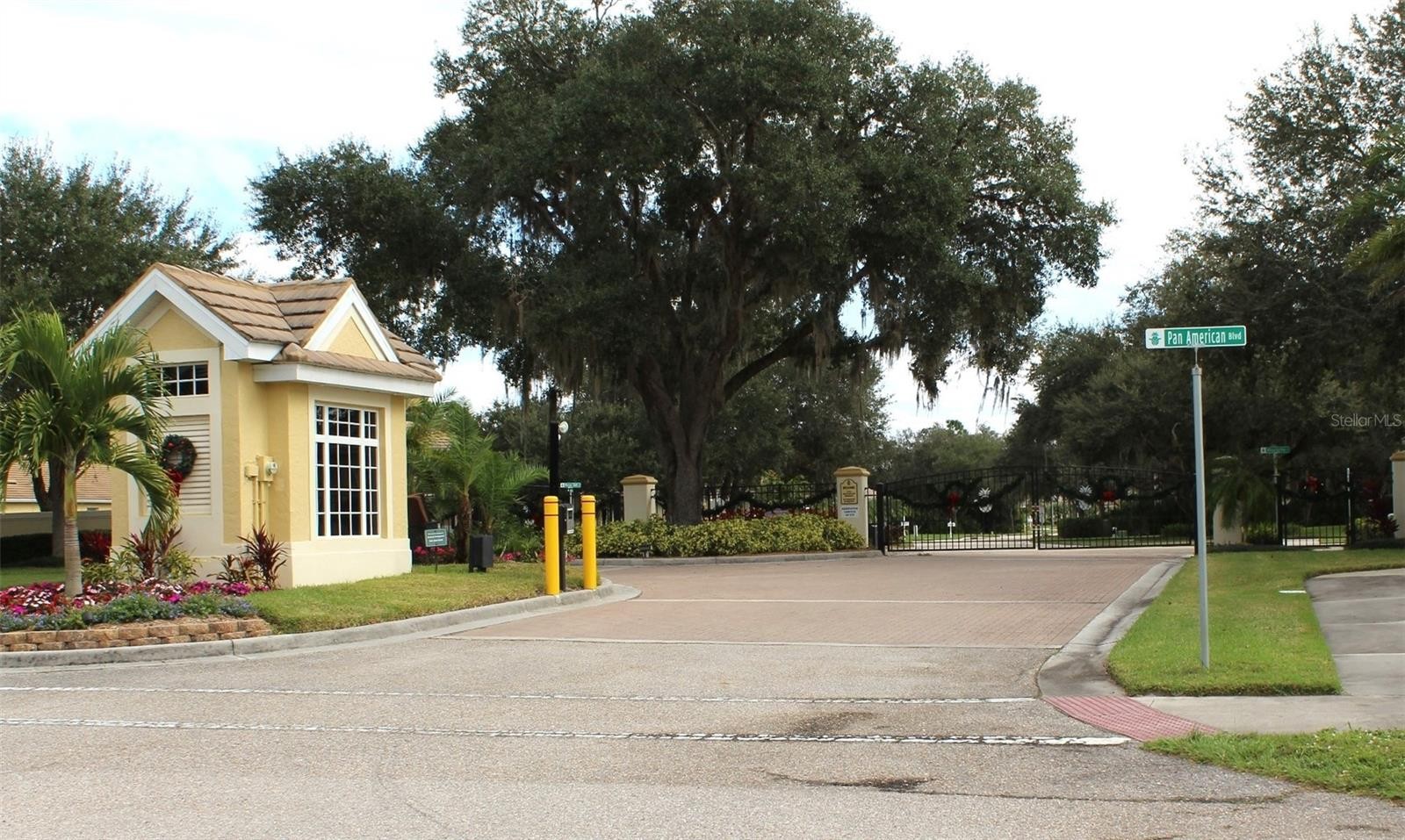 Enjoy the serenity of this private, gated community featuring beautifully landscaped grounds, sidewalks, tranquil pond fountains, park benches, and charming lantern-lit streets. Whether living here full-time or seasonal, this low maintenance gated community is the perfect oasis. No CDD fees, Flood Zone X, low HOA. This recently painted and meticulously maintained residence offers the perfect balance of comfort, elegance, and move-in-ready convenience. Inside, you’ll find 3 spacious bedrooms and 2 full baths, enhanced by impact glass windows, plantation shutters, and crown molding. The home can be available turnkey furnished. A welcoming covered front porch leads you into a generous foyer. The thoughtfully designed kitchen features abundant cabinetry with pull-out shelving, stainless appliances, and a bright dinette area ideal for casual dining. The open-concept living area flows seamlessly to the outdoors through triple sliding glass doors. Florida living is defined by exceptional outdoor spaces—where sunshine, gentle breezes, and year-round enjoyment create the perfect backdrop for both relaxation and entertaining. This spacious, expanded, screened-in wraparound patio/lanai is a must see. With access from slider doors from the living room, dinette, and primary bedroom, it truly serves as an extension of the home’s interior living space. Whether hosting weekend barbecues, savoring your morning coffee beneath the palms, or simply unwinding in your own private backyard oasis, this outdoor retreat embodies the very heart of the Florida lifestyle. The spacious primary suite offers private lanai access through double sliders, a walk-in closet, and a well-appointed en-suite bath complete with dual sinks and a Roman walk-in shower. A desirable split-bedroom floor plan ensures privacy for guests, with two additional bedrooms and a conveniently located guest full bath. Bedroom #3, with its French doors, is currently being used as a den. Exceptional curb appeal completes the package, featuring a tile roof, mature landscaping, and a welcoming front porch. This home truly combines refined style, thoughtful upgrades, and peaceful surroundings in one impressive offering. The community is located near Wellen Park, just 2 miles from the Legacy biking and walking trail and nature trails, close to multiple golf courses, tropical beaches, public boat launches, and spring training baseball facilities. Convenient access to medical facilities, schools and local amenities. This home truly offers the best of Florida living—schedule your showing today!