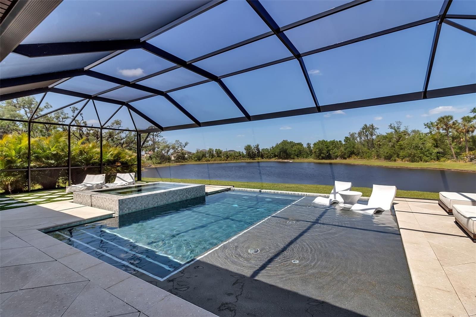 Experience pure sophistication from the moment you step through the entrance. This stunning, contemporary pool home is a testament to meticulous attention to every detail. The open and luminous floor plan is flooded with natural light, offering a captivating view of the pool against the tranquil backdrop of a serene pond. The living area boasts beautiful neutral-colored porcelain floors, complemented by tray ceilings featuring recessed LED lighting. Modern lighting fixtures and custom built-ins, including a wine rack and an entertainment center, add a touch of refinement. The thoughtfully designed split-bedroom plan ensures privacy, with the office conveniently located adjacent to the primary bedroom. The kitchen is a vision of elegance with its white-on-white aesthetic, endless counter space, and cabinets. High-end appliances and a bay window in the breakfast area complete the picture of culinary delight. Step outside to a breathtaking patio that offers ample covered space, a complete summer kitchen with countertops, all while indulging in the luxury of a saltwater heated pool during the colder months. This home is an absolute gem with its functional floor plan, exquisite finishes, and prime location in The Reserve—a highly sought-after community.