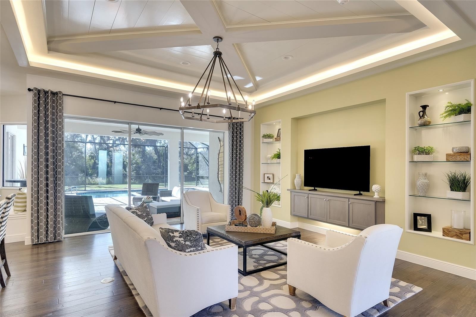 FURNISHED FORMER MODEL!! Stunning home --immaculate-- move in ready. The Medallion Homes "Aruba" tastefully furnished former model pool home with an outdoor kitchen located in the highly sought after Reserve at Twin Rivers, a gated community. Move in ready-- just bring your toothbrush and swimsuit!! The beautiful furniture is included for those seeking to indulge in the finest aspects of residential luxury. Upon entering, you are greeted by engineered hardwood floors that seamlessly flow throughout the living area, complemented by custom tray ceilings, custom wood baseboards, custom drapery and a meticulously crafted floor plan. The kitchen features ample cabinets, quartz counter tops, upgraded stainless appliances, double oven, and a separate microwave. The home also features a tile roof, brick paver driveway, AIR CONDITIONED 3 car garage, NEW pool heater 07/2025, NEW pool pump 11/2025, NEW washer and dryer 10/2024, ALL NEW landscaping and no CDD. Entertain around your caged pool/spa and enjoying your outdoor kitchen!