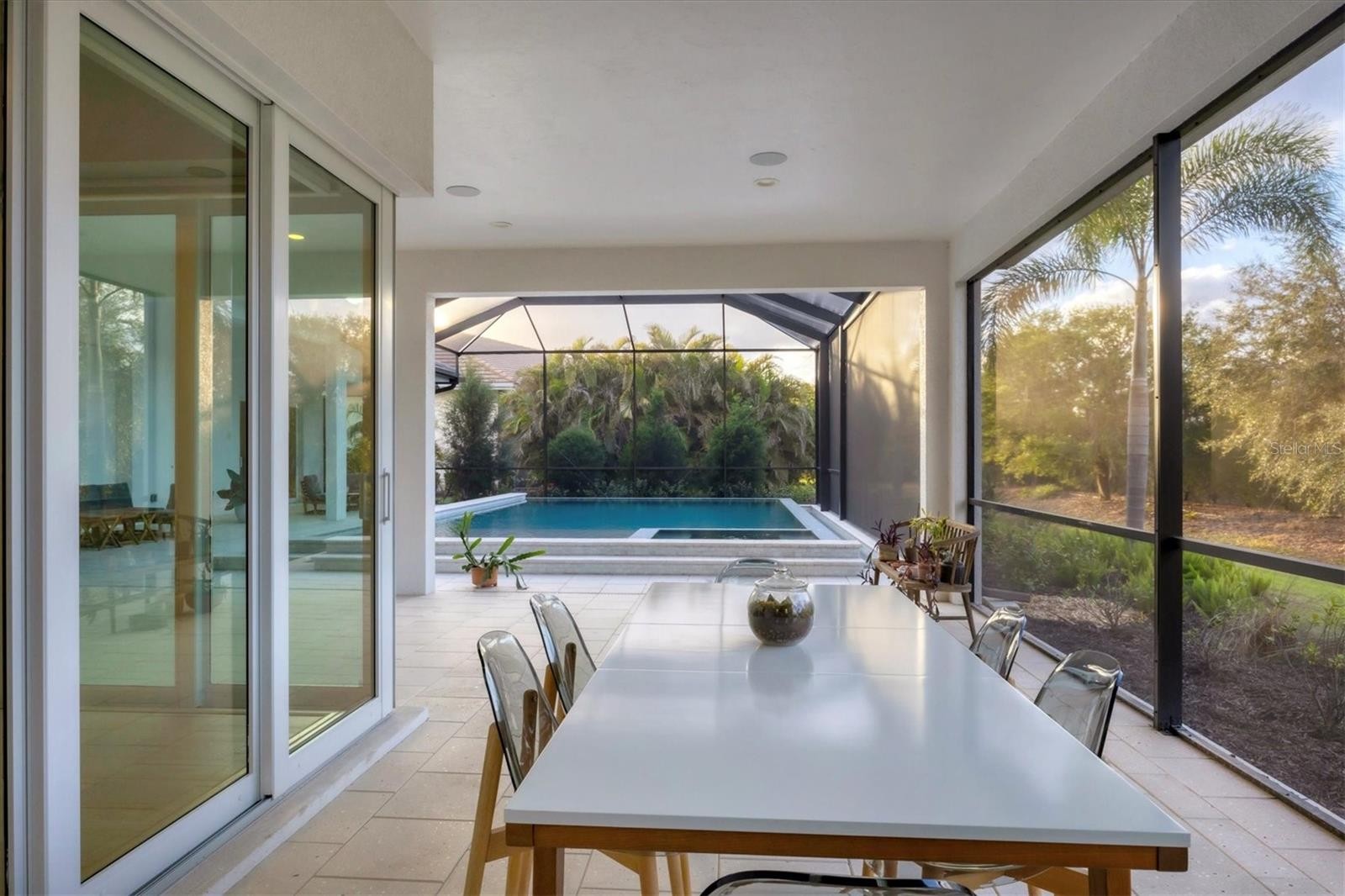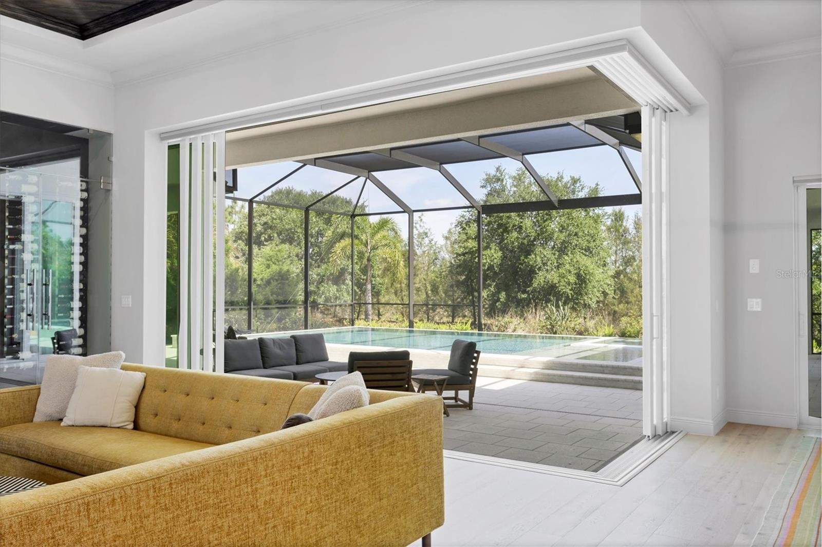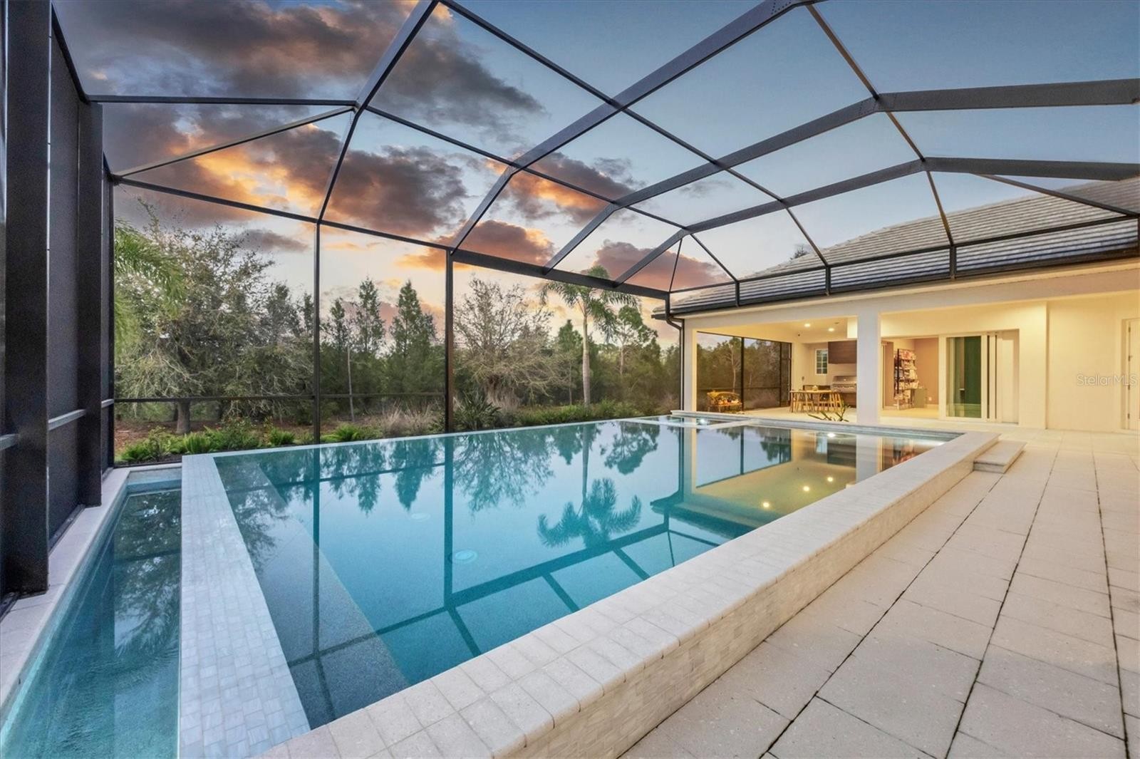 On a quiet preserve in the exclusive gated enclave of Country Club East, this exceptional John Cannon residence showcases refined craftsmanship, modern luxury, and seamless indoor-outdoor living. Designed for comfort and impact, the home features impact-rated windows and doors, a full-house generator, and an open layout that’s as functional as it is beautiful. Enter through 10-foot iron and glass double doors into a dramatic great room with whitewashed European oak flooring, soaring 13-foot ceilings with chevron wood detail, and a striking natural gas fireplace framed by Basalt volcanic tile and reclaimed wood mantle. A custom Whisperkool wine wall holds up to 130 bottles, accented by a chevron Stickwood backdrop. The main foyer features a hidden closet for bags and shoes. The chef’s kitchen boasts Sub-Zero and Wolf appliances, a six-burner range, built-in oven and microwave, quartz countertops, a prep island outfitted with pullout drawers, two for spices, a farmhouse sink and a standalone ice maker. An entertaining-sized island outside the kitchen features Sub-Zero beverage and wine coolers, an additional microwave and ample hidden storage. A spacious walk-in pantry is nearby and includes a built-in tall closet. The great room’s 10-foot sliders fold back into a disappearing corner and lead to the expansive lanai with a PebbleTec infinity-edge heated saltwater pool and spa, panoramic screen enclosure, Shell Lock pavers and a fully outfitted summer kitchen with Alfresco grill, Trailwinds hood, True ice machine, Uline refrigerator and Blanco sink. The private owner’s wing includes two walk-in closets, tray ceiling with crown molding, lanai access, and a spa-style bath with radiant heated floors and a steam shower. Two guest suites are positioned in separate wings, each with its full bath and walk-in closet, one with a private entrance and drop zone, the other with pool bath access. Additional living spaces include a bonus room with 10-foot sliders as a second disappearing corner as well as a study/exercise room with 15-foot ceilings. The laundry room features abundant cabinet storage, designer tile, sink and an additional 60 square feet of dedicated storage carved out behind two double doors. Adding even more value, the home is equipped with a whole-house water filtration system, designer lighting, automatic blinds and an oversized three-car garage. Every detail of this home has been thoughtfully curated for elevated living in one of Lakewood Ranch’s prestigious communities.