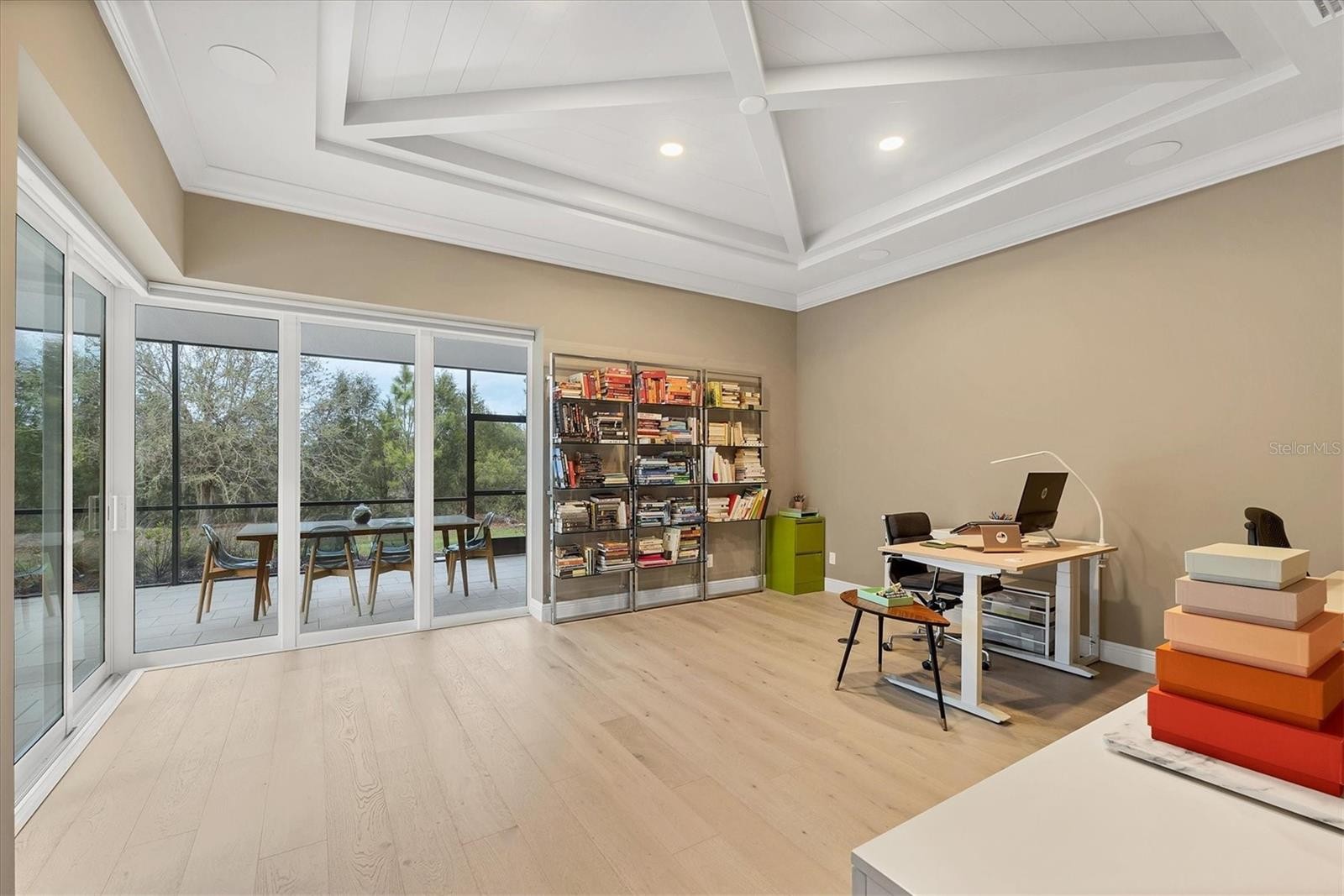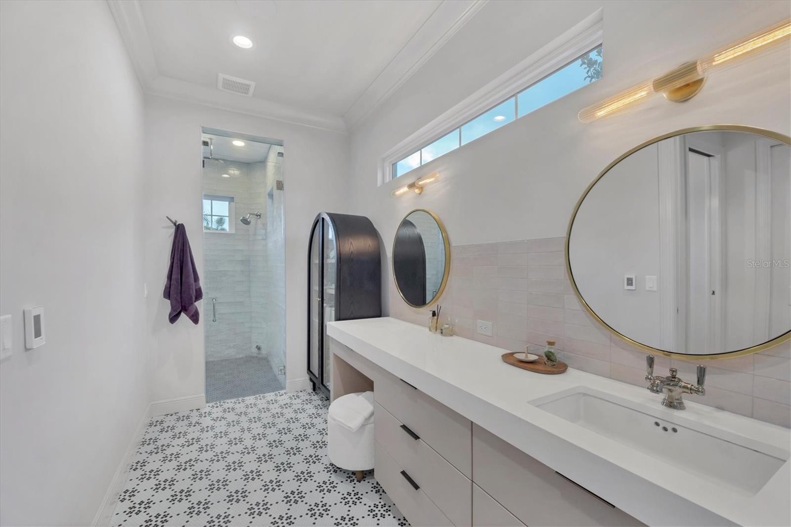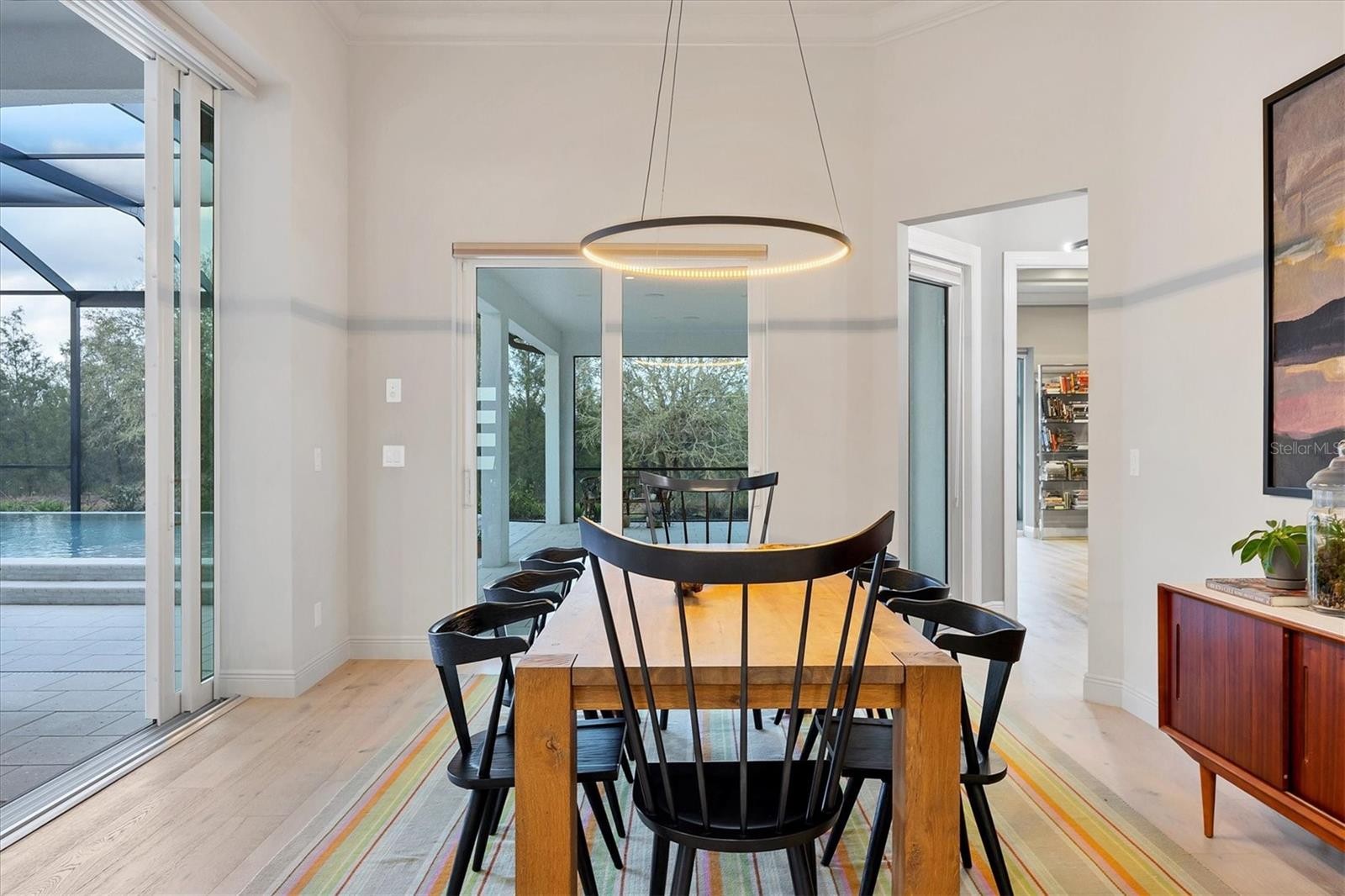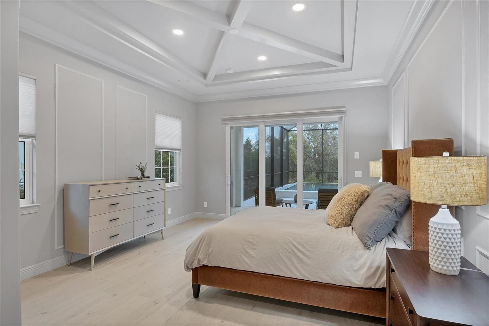 On a quiet preserve in the exclusive gated enclave of Country Club East, this exceptional John Cannon residence showcases refined craftsmanship, modern luxury, and seamless indoor-outdoor living. Designed for comfort and impact, the home features impact-rated windows and doors, a full-house generator, and an open layout that’s as functional as it is beautiful. Enter through 10-foot iron and glass double doors into a dramatic great room with whitewashed European oak flooring, soaring 13-foot ceilings with chevron wood detail, and a striking natural gas fireplace framed by Basalt volcanic tile and reclaimed wood mantle. A custom Whisperkool wine wall holds up to 130 bottles, accented by a chevron Stickwood backdrop. The main foyer features a hidden closet for bags and shoes. The chef’s kitchen boasts Sub-Zero and Wolf appliances, a six-burner range, built-in oven and microwave, quartz countertops, a prep island outfitted with pullout drawers, two for spices, a farmhouse sink and a standalone ice maker. An entertaining-sized island outside the kitchen features Sub-Zero beverage and wine coolers, an additional microwave and ample hidden storage. A spacious walk-in pantry is nearby and includes a built-in tall closet. The great room’s 10-foot sliders fold back into a disappearing corner and lead to the expansive lanai with a PebbleTec infinity-edge heated saltwater pool and spa, panoramic screen enclosure, Shell Lock pavers and a fully outfitted summer kitchen with Alfresco grill, Trailwinds hood, True ice machine, Uline refrigerator and Blanco sink. The private owner’s wing includes two walk-in closets, tray ceiling with crown molding, lanai access, and a spa-style bath with radiant heated floors and a steam shower. Two guest suites are positioned in separate wings, each with its full bath and walk-in closet, one with a private entrance and drop zone, the other with pool bath access. Additional living spaces include a bonus room with 10-foot sliders as a second disappearing corner as well as a study/exercise room with 15-foot ceilings. The laundry room features abundant cabinet storage, designer tile, sink and an additional 60 square feet of dedicated storage carved out behind two double doors. Adding even more value, the home is equipped with a whole-house water filtration system, designer lighting, automatic blinds and an oversized three-car garage. Every detail of this home has been thoughtfully curated for elevated living in one of Lakewood Ranch’s prestigious communities.