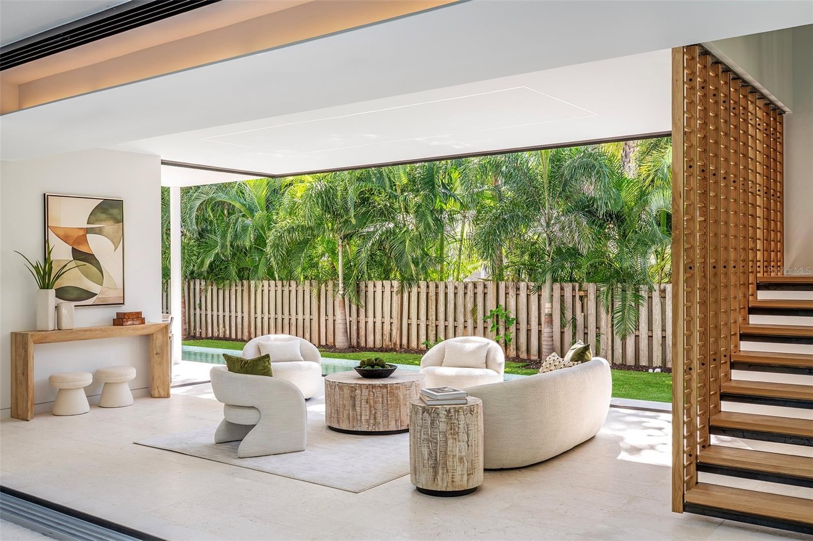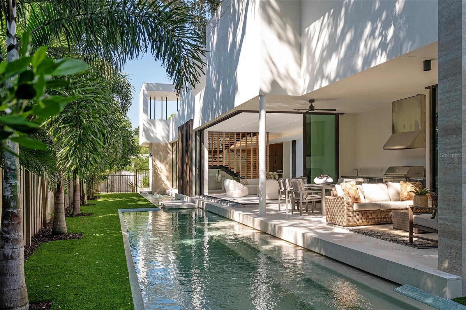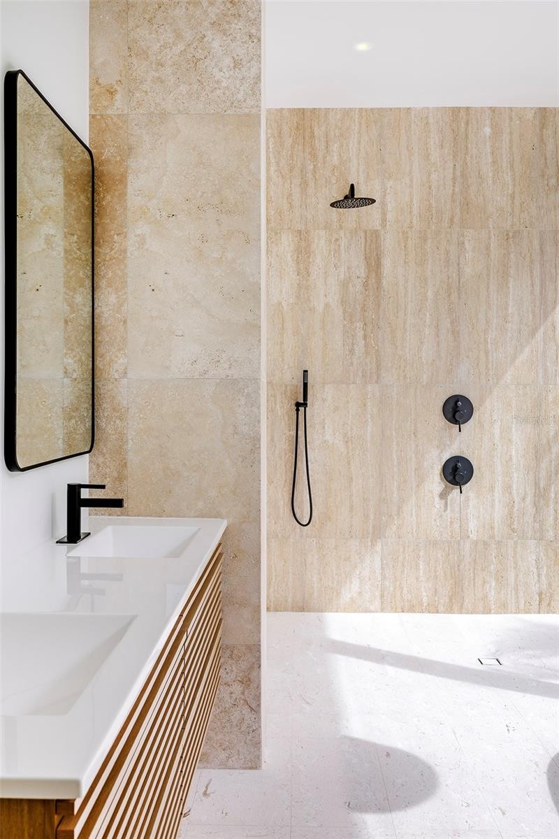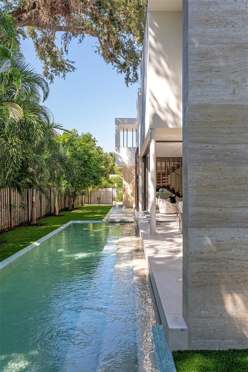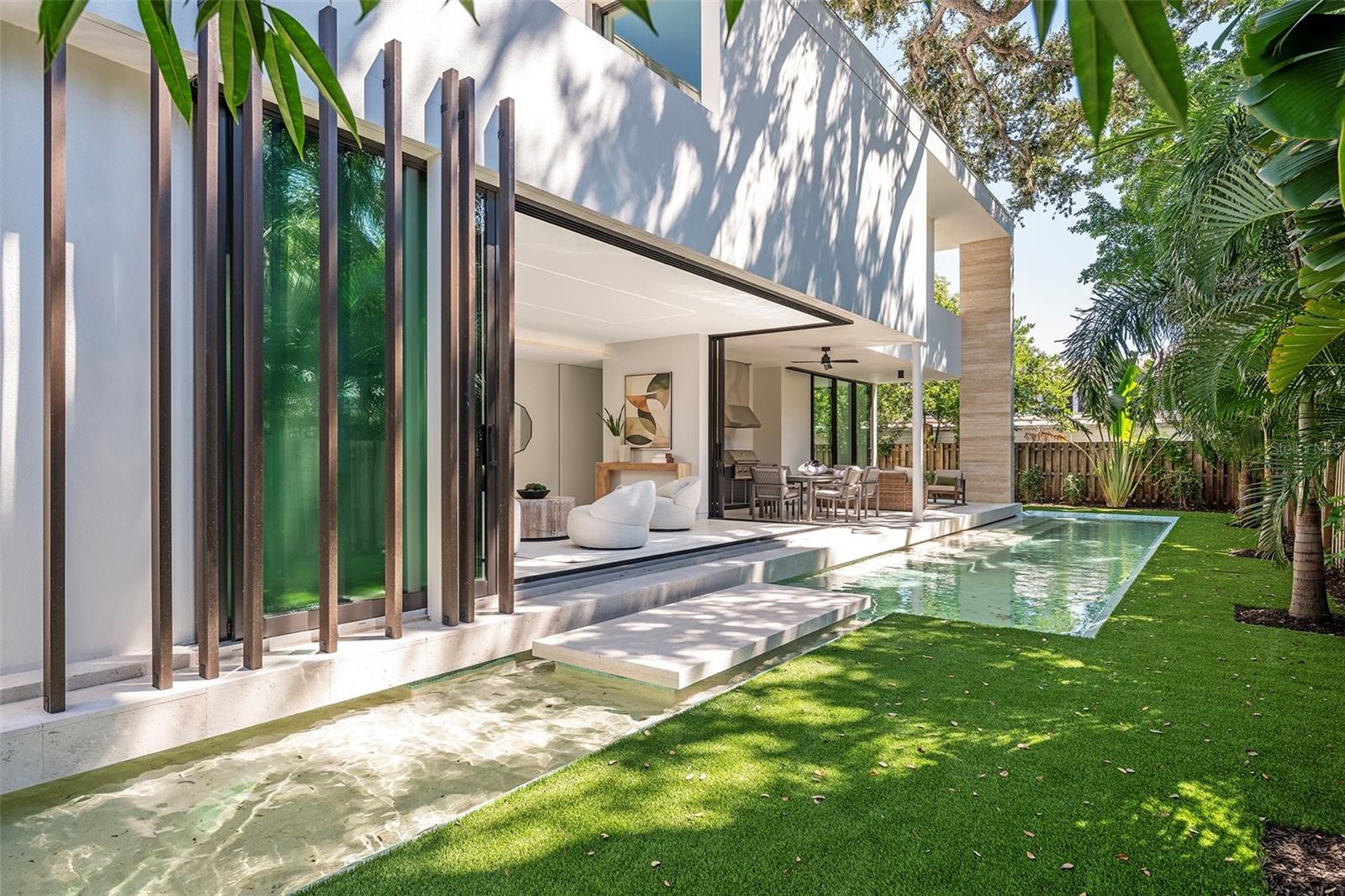 Stunning New Construction by Award-Winning Architect Dan Lear in coveted West of Trail Neighborhood** This meticulously designed luxury home offers the perfect blend of modern elegance and timeless sophistication. Near Selby Gardens, Morton's Market, and Sarasota Memorial Hospital, this exceptional property provides both convenience and style. Spanning over 3,800sqft of living area, this expansive residence boasts four spacious bedrooms, five full bathrooms, a enormous den with terrace, and a dedicated office space, all thoughtfully crafted for contemporary living. The grand, open-concept great room is the heart of the home, seamlessly floating over the pool area with a stunning large corner pocketing glass door that connects the interior to the beautifully landscaped outdoor oasis. The second floor features three guest suites, each with its own private terrace, offering tropical views and tranquility. The home's striking exterior showcases luxurious vein-cut travertine, creating a refined, sophisticated look. This is an extraordinary opportunity to move right in to a worry free one-of-a-kind masterpiece.