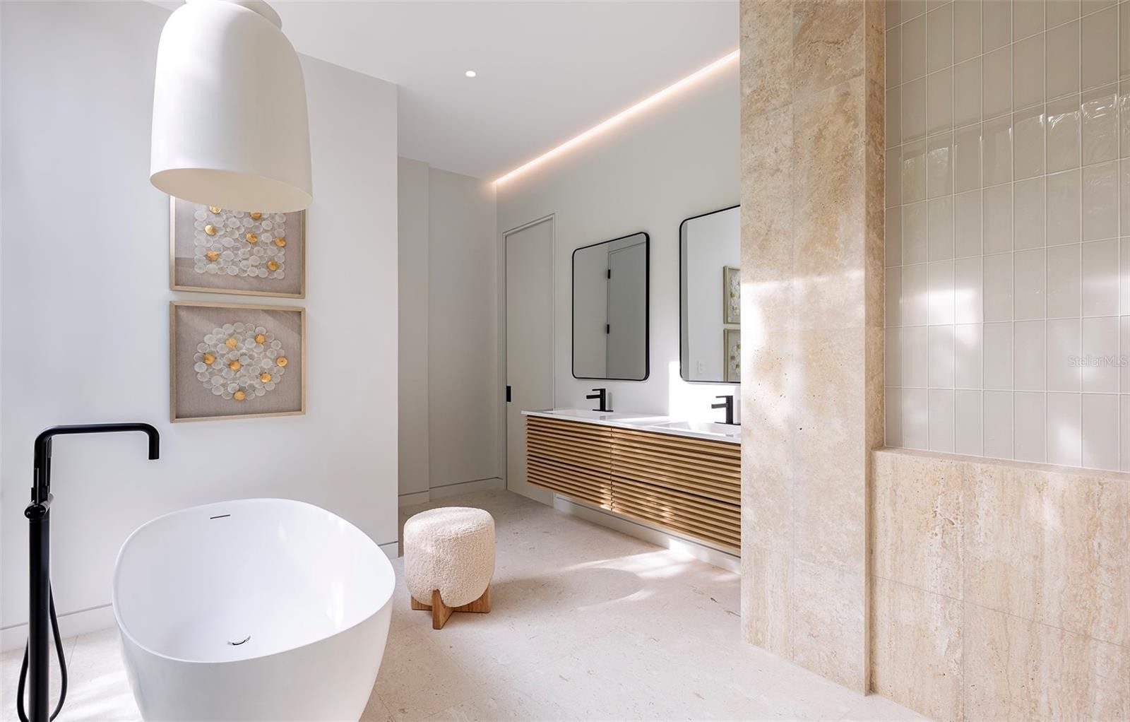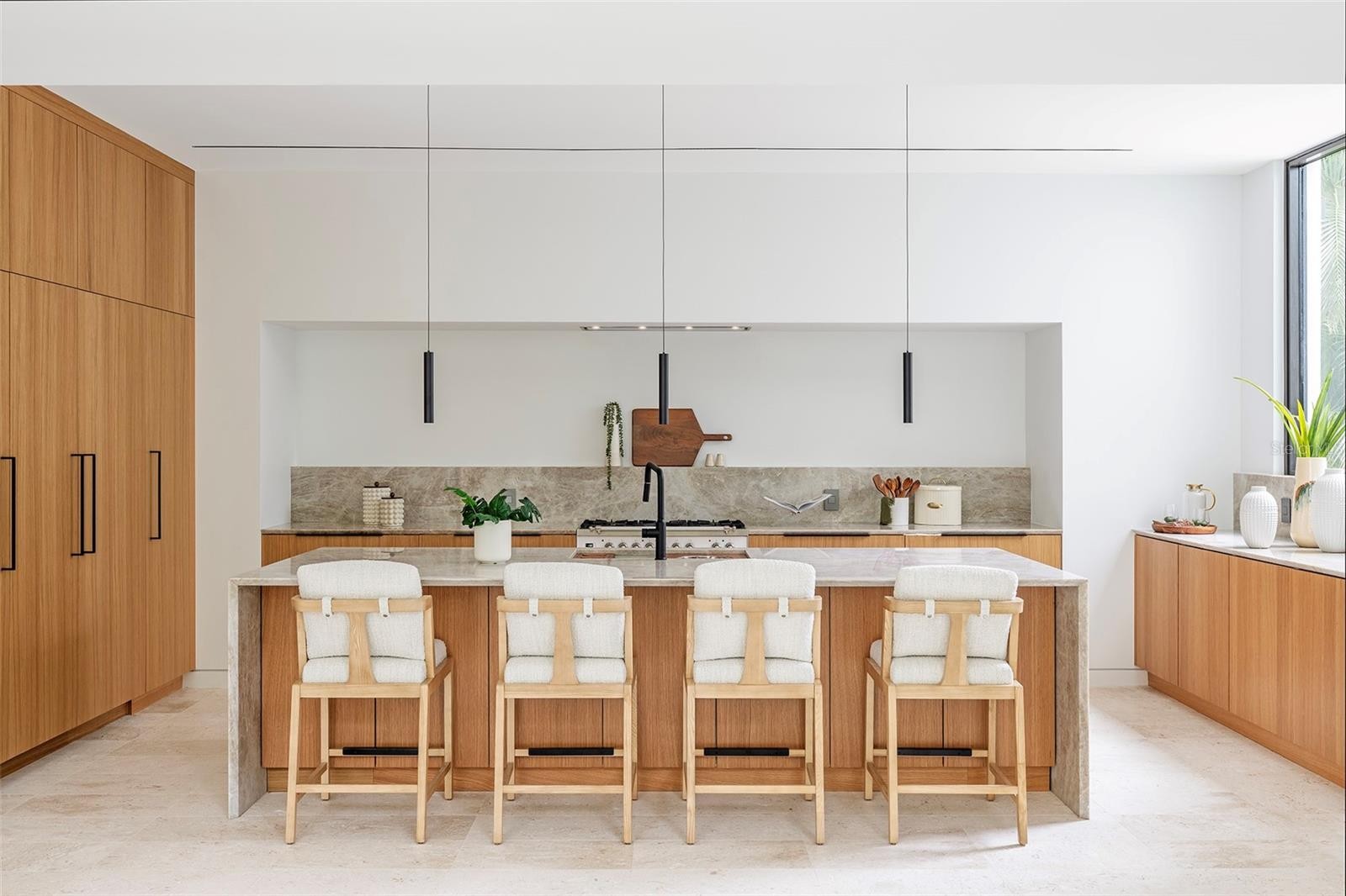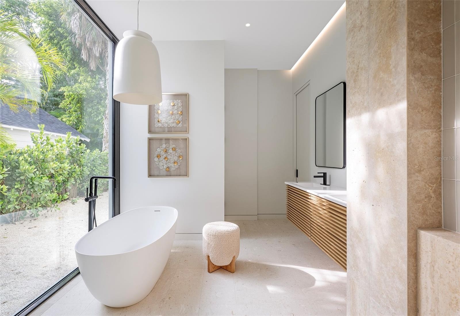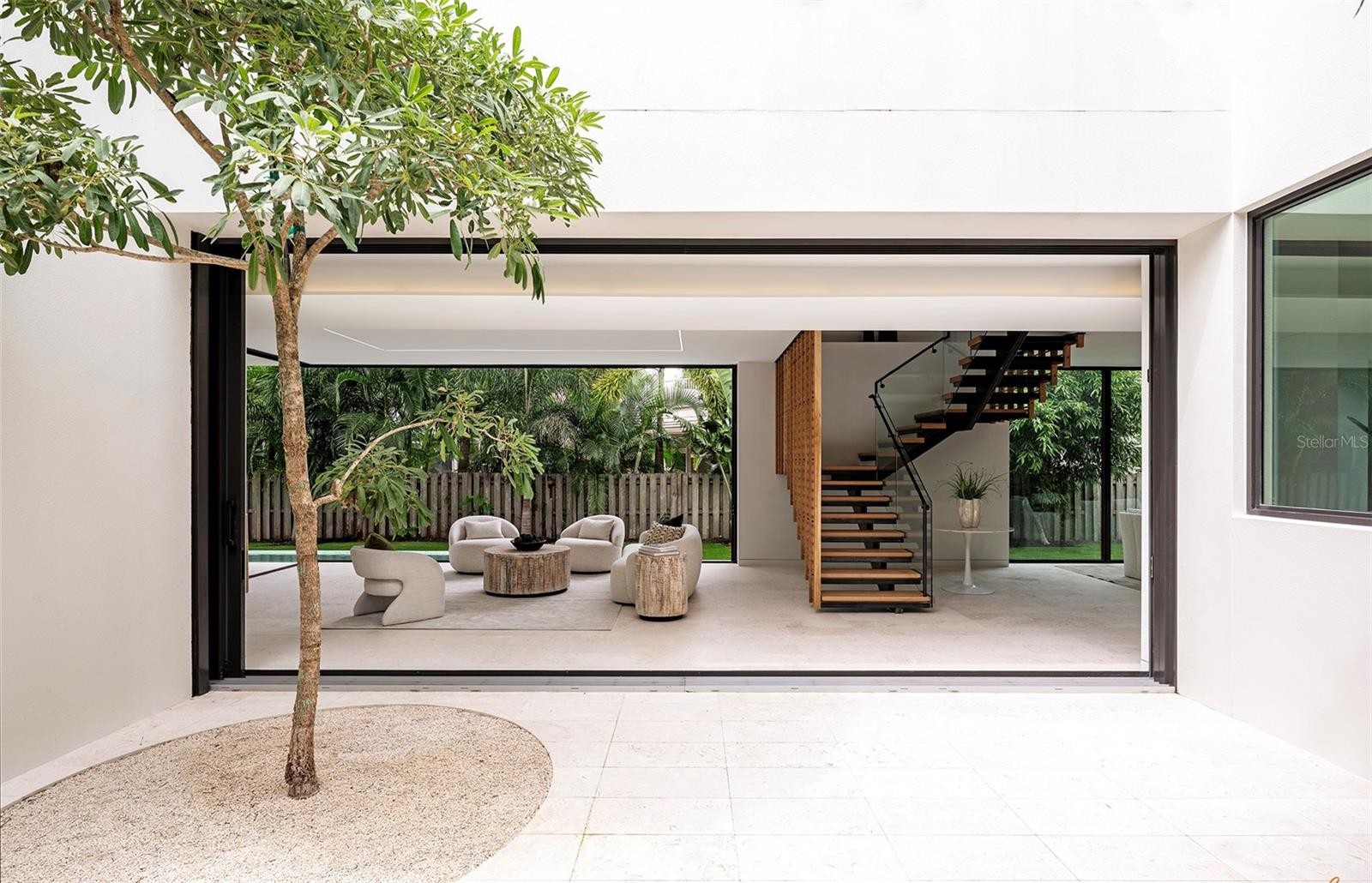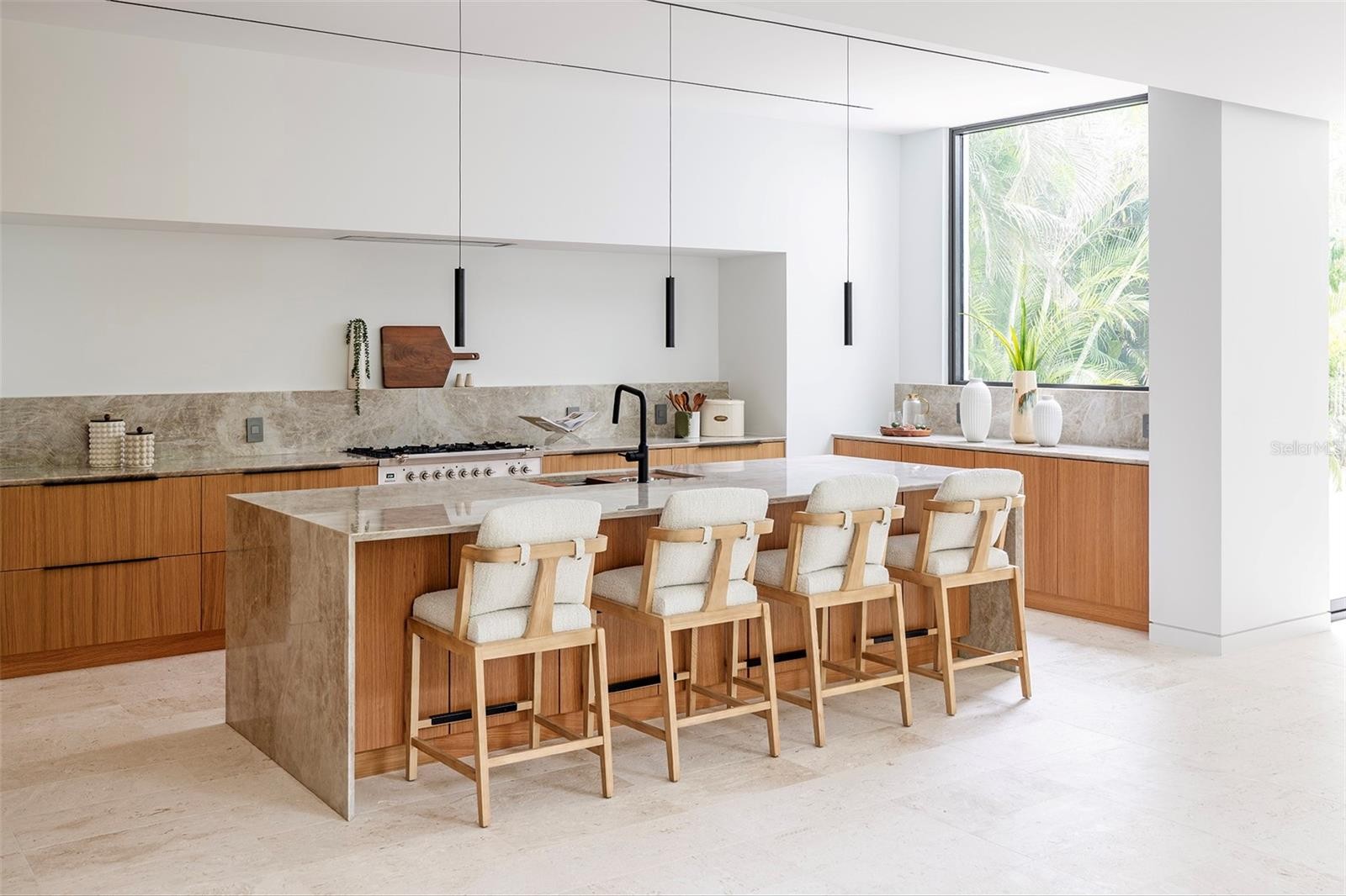 Stunning New Construction by Award-Winning Architect Dan Lear in coveted West of Trail Neighborhood** This meticulously designed luxury home offers the perfect blend of modern elegance and timeless sophistication. Near Selby Gardens, Morton's Market, and Sarasota Memorial Hospital, this exceptional property provides both convenience and style. Spanning over 3,800sqft of living area, this expansive residence boasts four spacious bedrooms, five full bathrooms, a enormous den with terrace, and a dedicated office space, all thoughtfully crafted for contemporary living. The grand, open-concept great room is the heart of the home, seamlessly floating over the pool area with a stunning large corner pocketing glass door that connects the interior to the beautifully landscaped outdoor oasis. The second floor features three guest suites, each with its own private terrace, offering tropical views and tranquility. The home's striking exterior showcases luxurious vein-cut travertine, creating a refined, sophisticated look. This is an extraordinary opportunity to move right in to a worry free one-of-a-kind masterpiece.